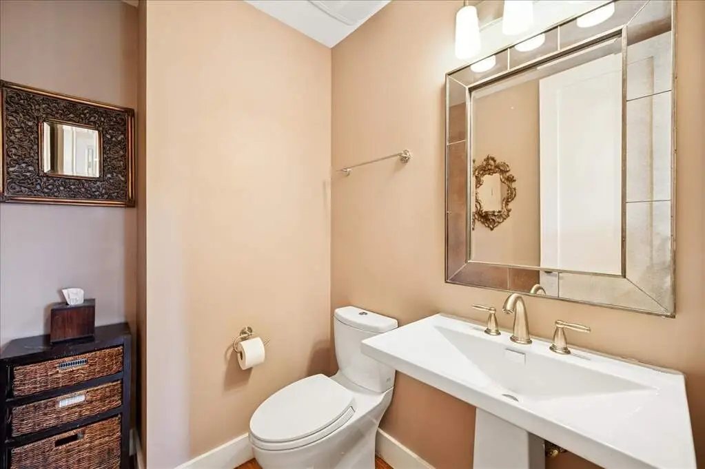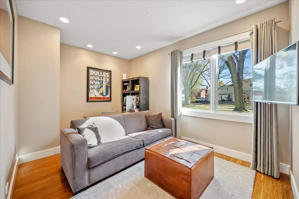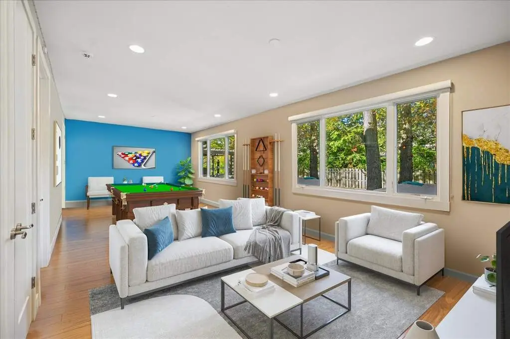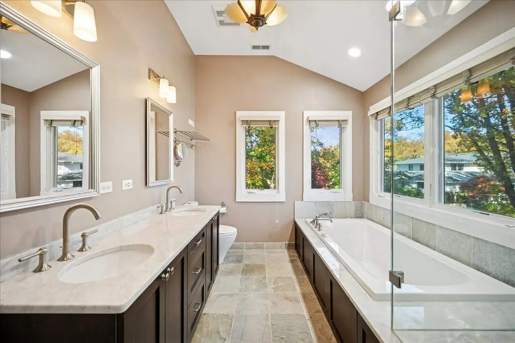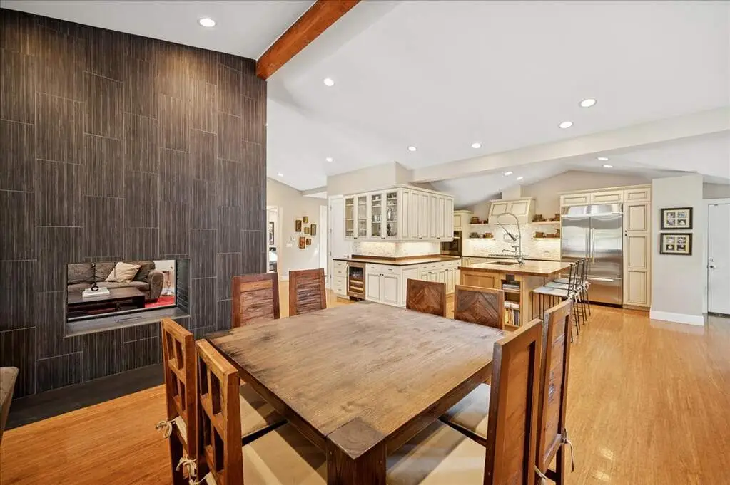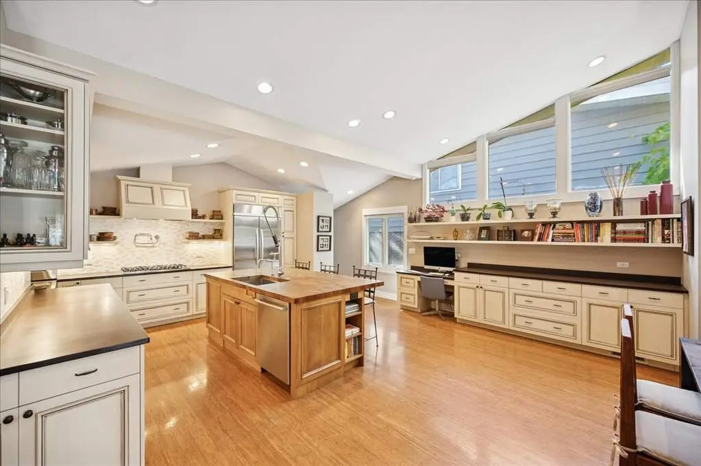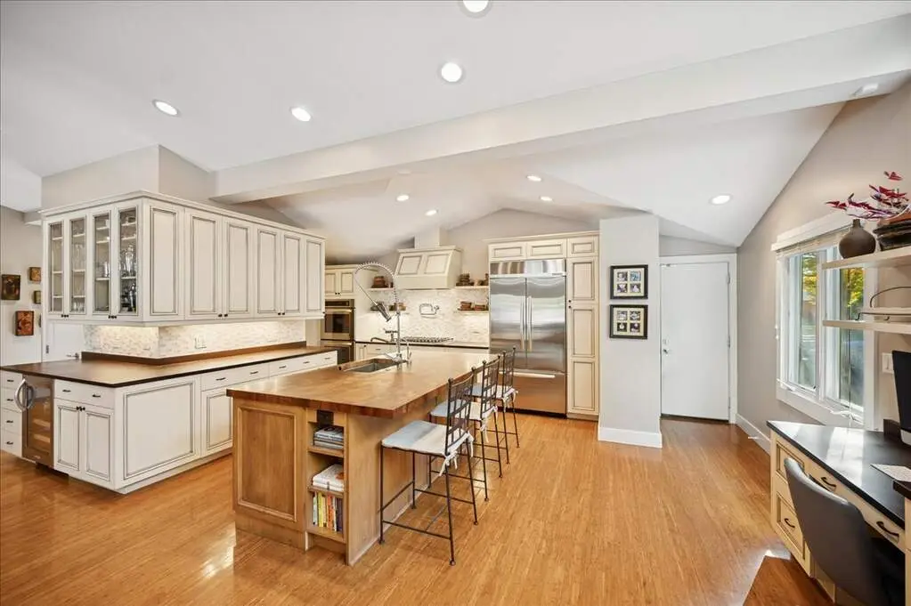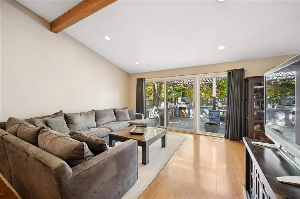 Beautifully renovated and expanded home, completely reimagined in 2008 with a second-story addition and attached two-car garage. The main level offers an open-concept layout with gorgeous bamboo floors, vaulted ceilings with beams and a skylight, and a high-end kitchen featuring custom cabinetry, glass backsplash, distinctive eco-friendly countertops with seating on island, a huge walk-in pantry, and an effortless flow to the dining area, family room, and living room-all anchored by an exquisite two-sided fireplace. A powder room, office, bedroom, beautifully updated full bath, spacious laundry room, and a versatile bonus room/playroom complete the first floor, providing flexible living options that can evolve with your needs. Upstairs, the luxurious primary suite boasts two walk-in closets with custom organizers and a stunning slate and marble bath with a separate jacuzzi soaking tub. Two additional bedrooms with organized closets share a stylish Jack-and-Jill bath. All full bathrooms throughout the home feature heated floors. Outside, the home showcases classic brick and Hardie board siding, complemented by an incredible backyard retreat complete with an outdoor kitchen (built-in grill and pizza oven), pergola, expansive patio with fire pit, generous seating areas, and lush green space. A true entertainer's dream, this home was designed with seamless spaces for hosting effortlessly both indoors and out. Thoughtfully crafted with sustainability in mind, it includes an extensive list of green features available upon request. Originally built as a ranch, the owner mindfully designed the renovation to allow the option to convert the bonus room to a first-floor primary suite. Above Grade Total Sq Ft: 3,637, Below Grade Total Sq Ft: 621, Approx. Total Sq Ft: 4,258 Sq Ft plus 462 Sq Ft garage. 2024 taxes: $25,784 with Homeowner Exemption.