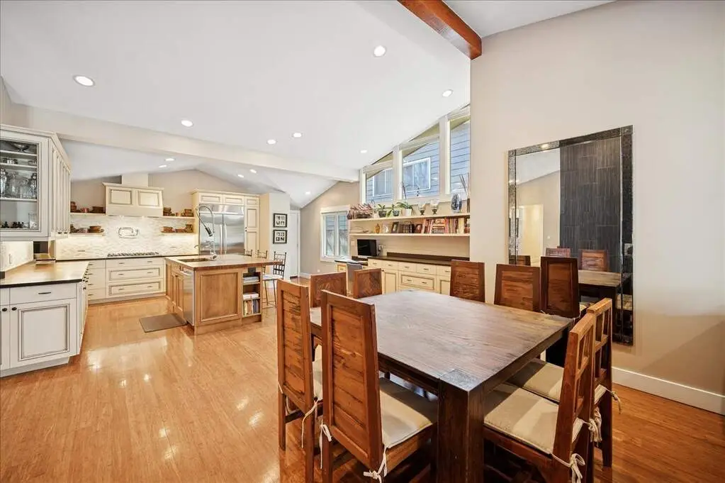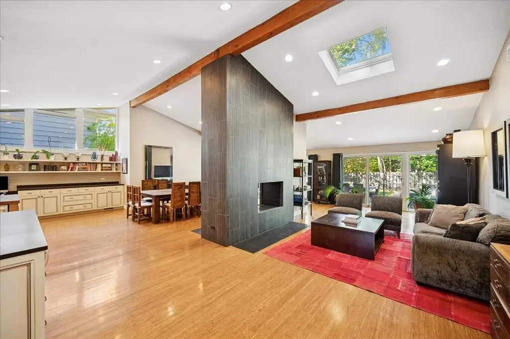 • Vaulted ceilings with beams and skylight