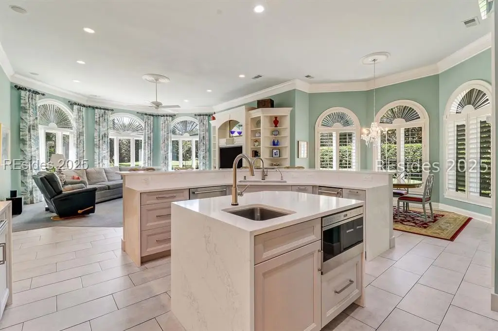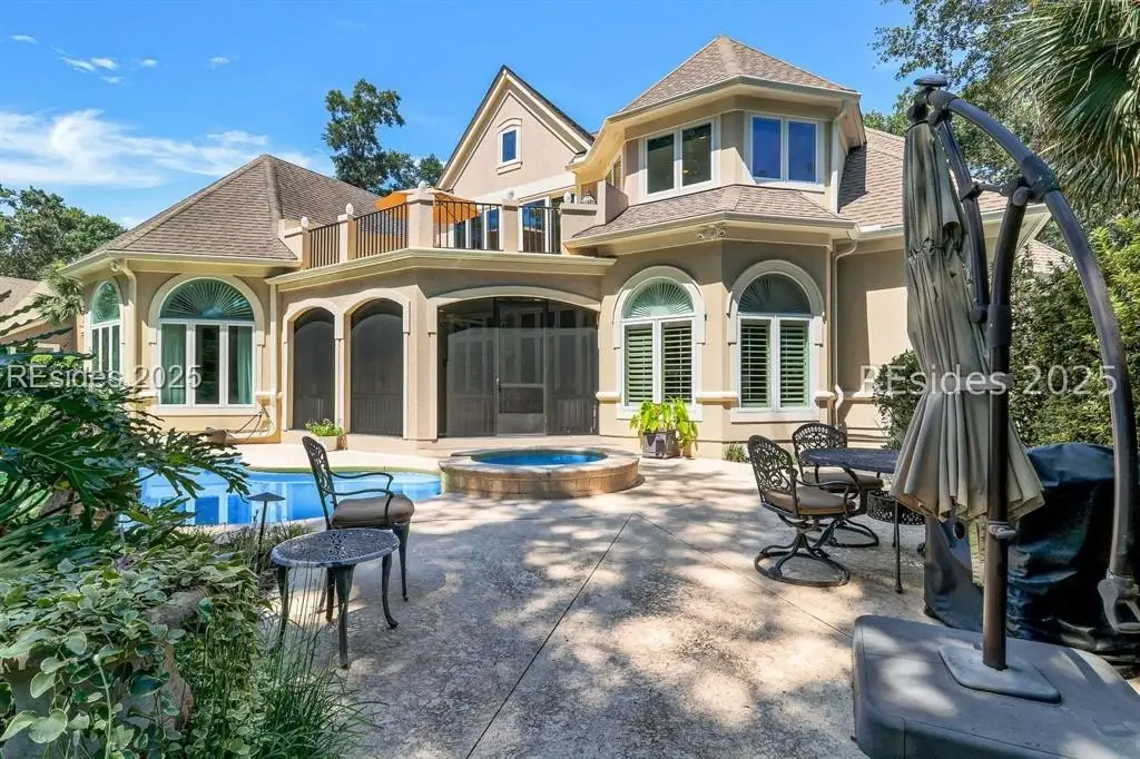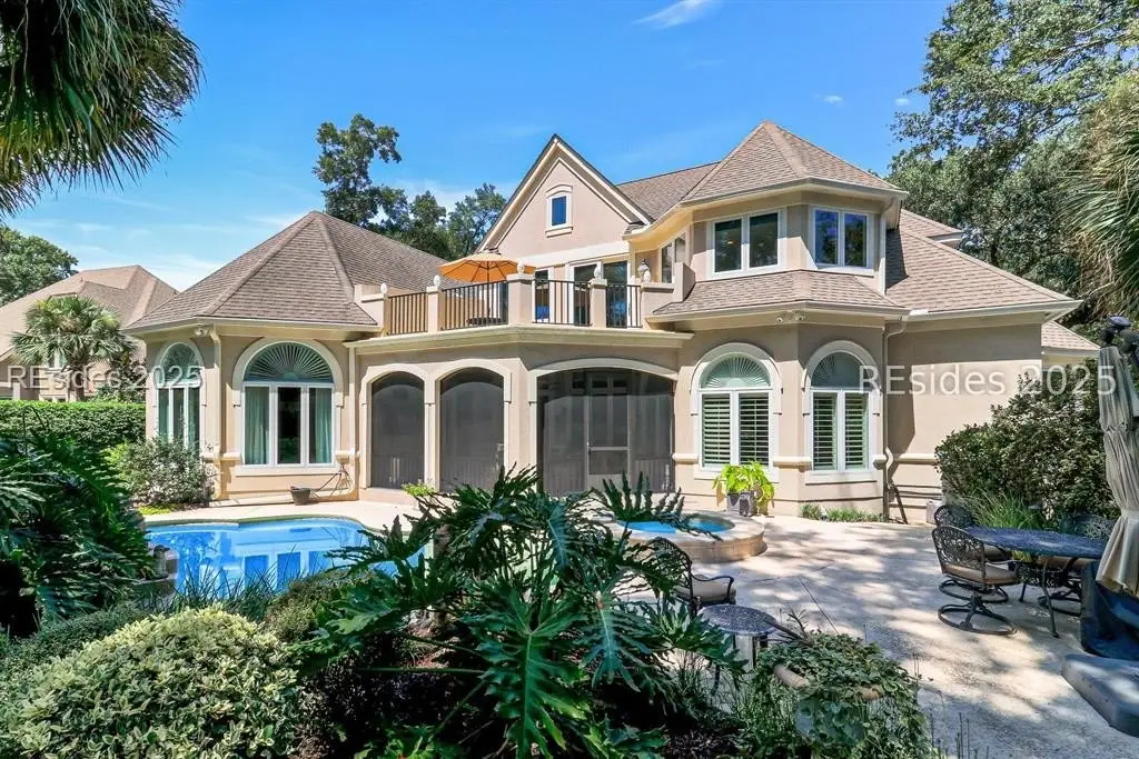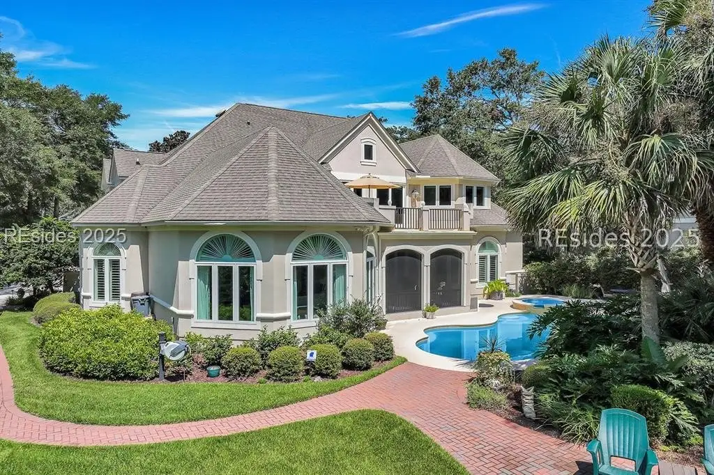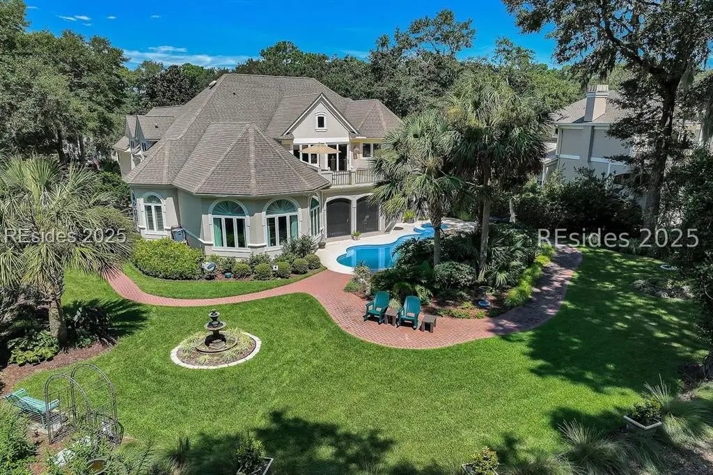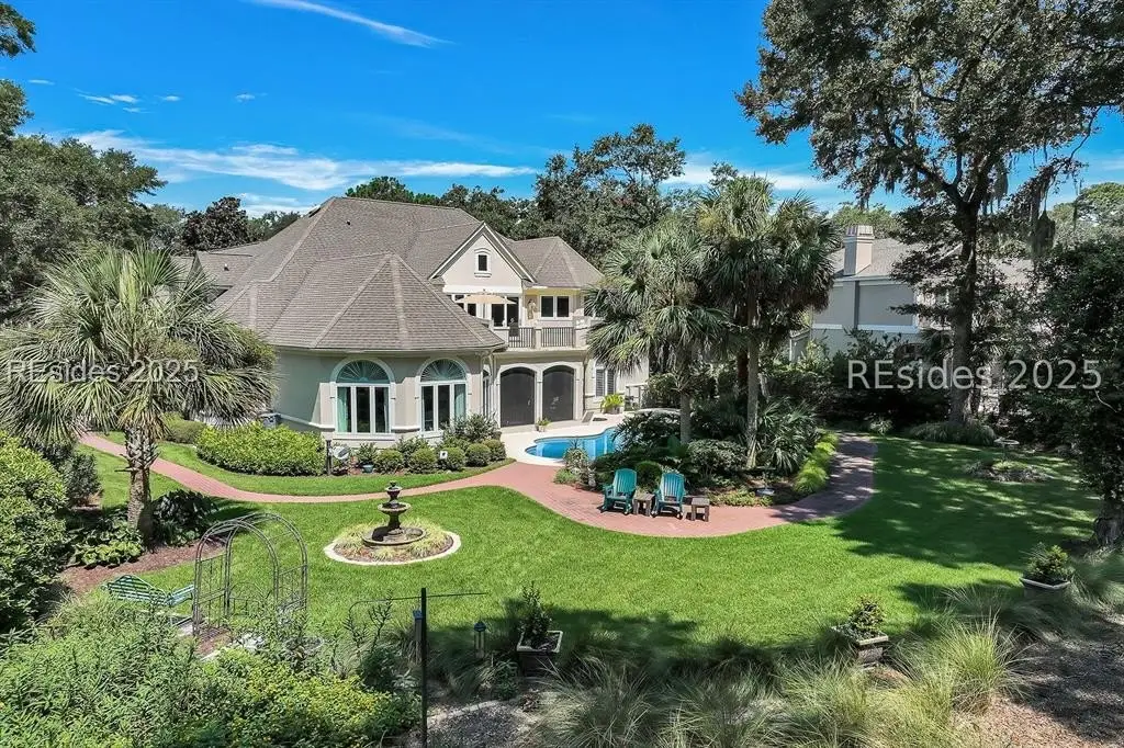 The combination of one of the most private locations and a custom design gives this home an estate-style feel in The Golf Club at Indigo Run. Few details were spared in the impressive updates to the kitchen and primary bath. The heart of the home features a stunning chef's kitchen with high-end Sub-Zero and Wolf appliances, quartz waterfall countertops, large walk-in pantry, abundant cabinets and counter space with a prep sink in the island, and an open flow into the expansive family room--flooded with natural light from its southern exposure. Adjoining the family room is a screened-in porch with built-in heaters for year-round enjoyment, which overlooks the heated freeform pool and spa. Formal living and dining rooms add elegance, while the spacious primary suite on the left wing of the home offers privacy and comfort and includes two large walk-in closets and a spectacular, recently renovated primary bath features separate vanities, a free-standing tub and walk-in shower. The handsome study/office at the front of the home provides the perfect work-from-home space with its built-in cabinets and shelves. A dramatic staircase leads from the marble foyer to three additional bedrooms and a large bonus room with pool table, plus an additional room adjoining one of the bedrooms, offering multiple use options. An oversized balcony is accessed from the bonus room and offers vistas of one of the most secluded and serene settings within Indigo Run. This home is for an owner who wants the luxury of space and flexibility of a gracious home complemented by a spectacular private location. Really must see to appreciate the expansive panoramic gardens, views of the 12th Hole of the Golf Club, and the private setting that photos can't convey.