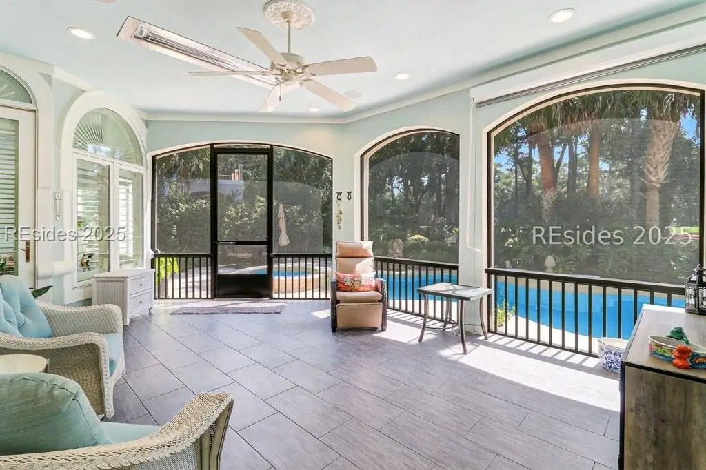 • Screened-in porch with built-in heaters overlooking heated freeform pool and spa