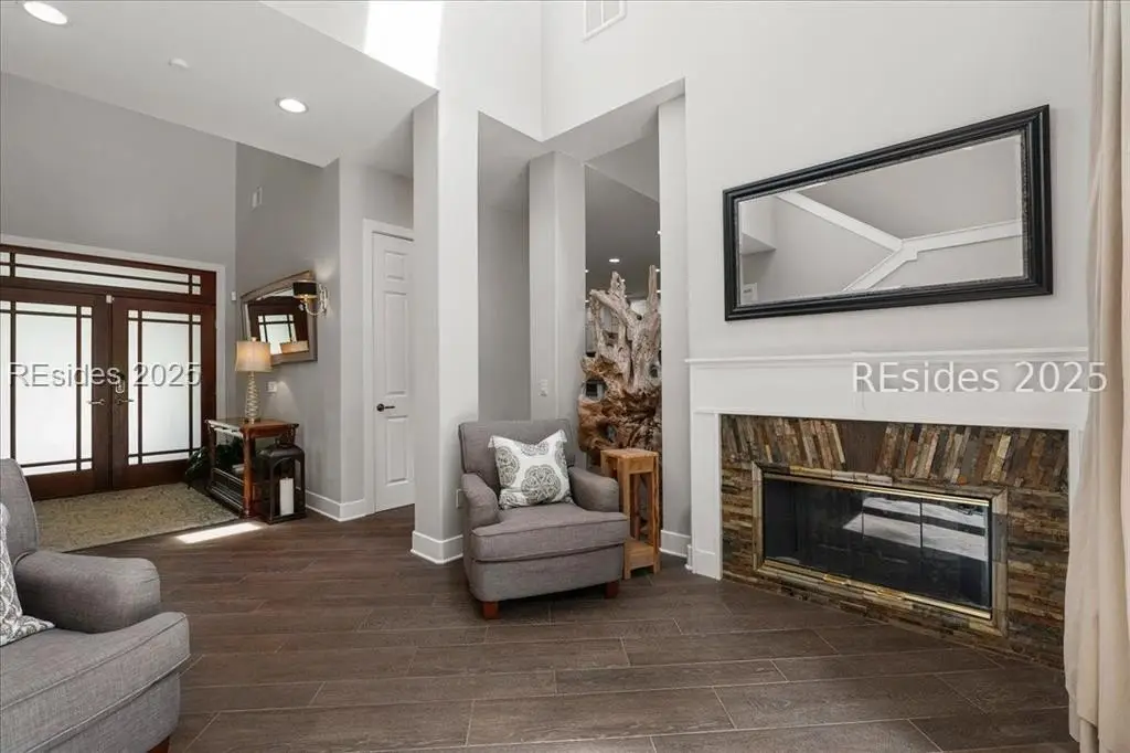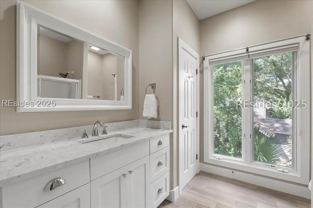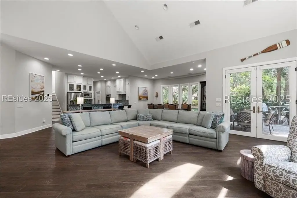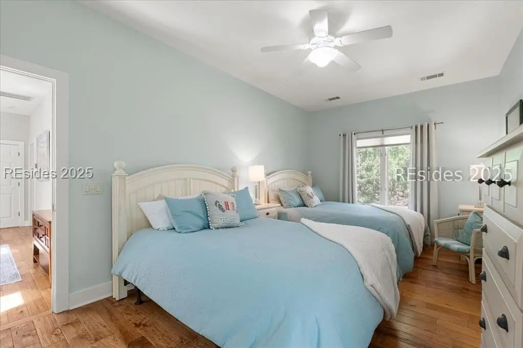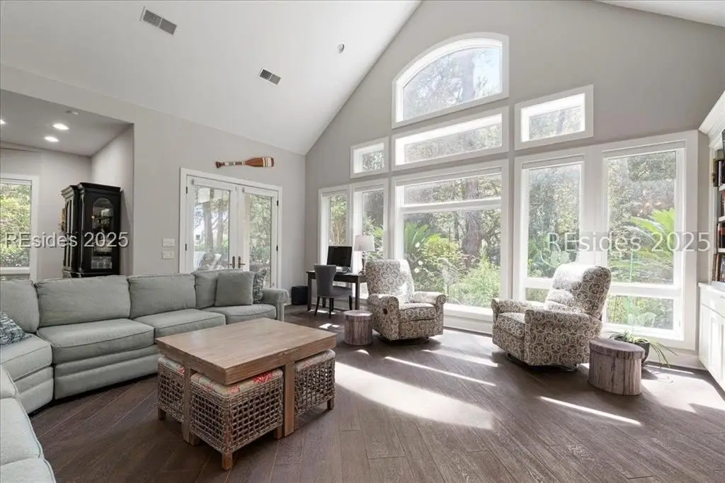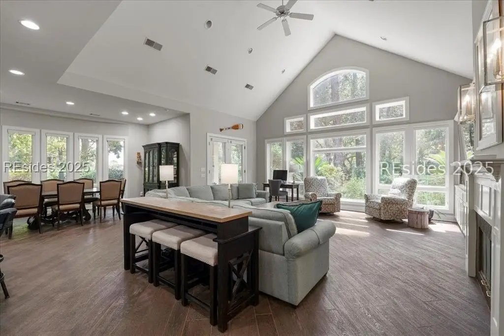 Only 300 yards from the sand, this Port Royal home ensures the Beach is part of your everyday life. The custom floor plan pairs coastal ease with modern design, set on an oversized (.86 acre) corner lot w a golf view. Inside, soaring ceilings and an open inviting layout create a light-filled gathering space with fireplace, dining, kitchen, beverage bar, and walk-in pantry. A welcoming front room with fireplace, primary suite, office, guest room & laundry complete the main level. Upstairs, a split design offers three more guest suites, including a bunk room retreat perfect for family & friends. Outdoors, enjoy lush gardens, open & covered patios designed by master gardeners. Living in Port Royal means access to private beach access, a beach house, lap pool, fire pits, leisure trails, pickleball, tennis, playground, community gardens, and 24-hour security in Hilton Heads only private oceanfront community with no short-term rentals. A warm & social setting.