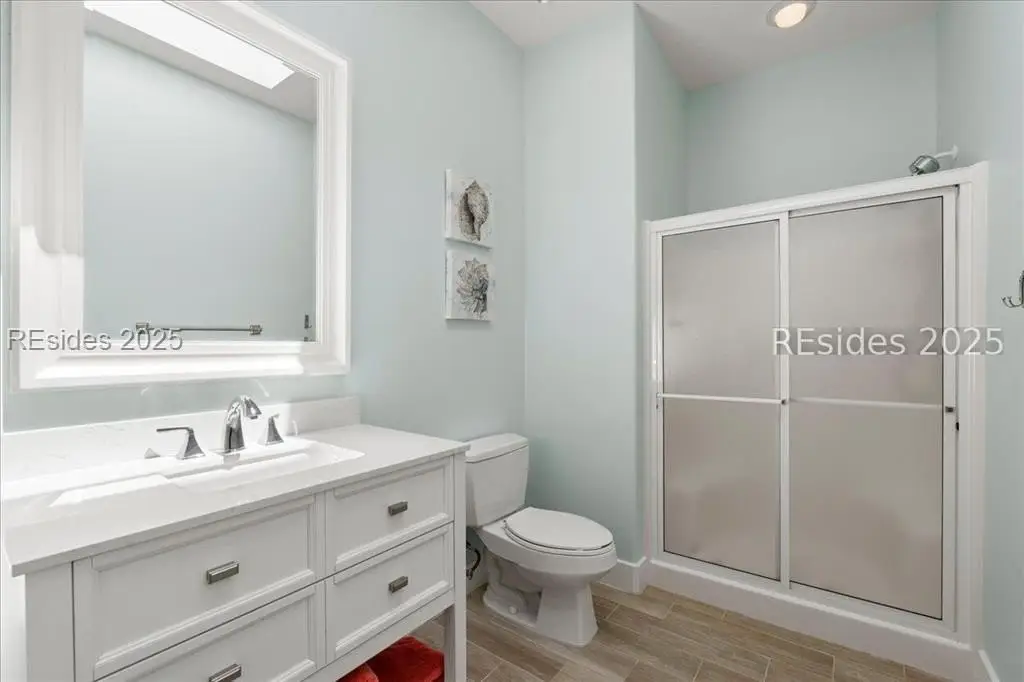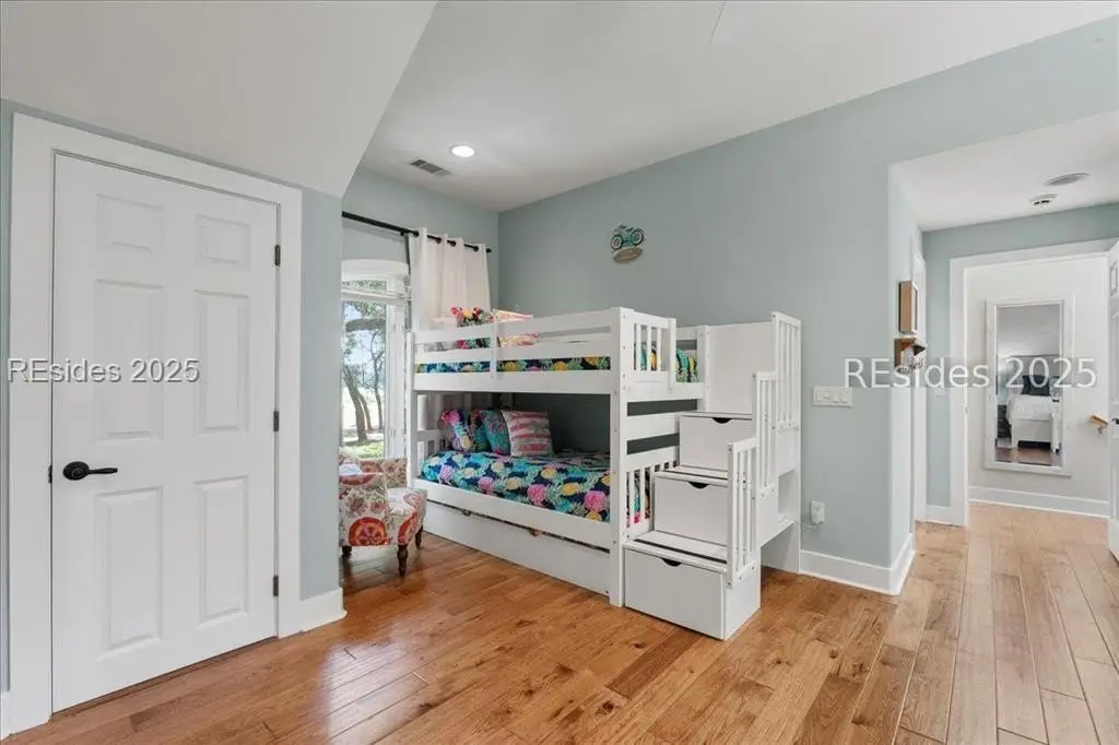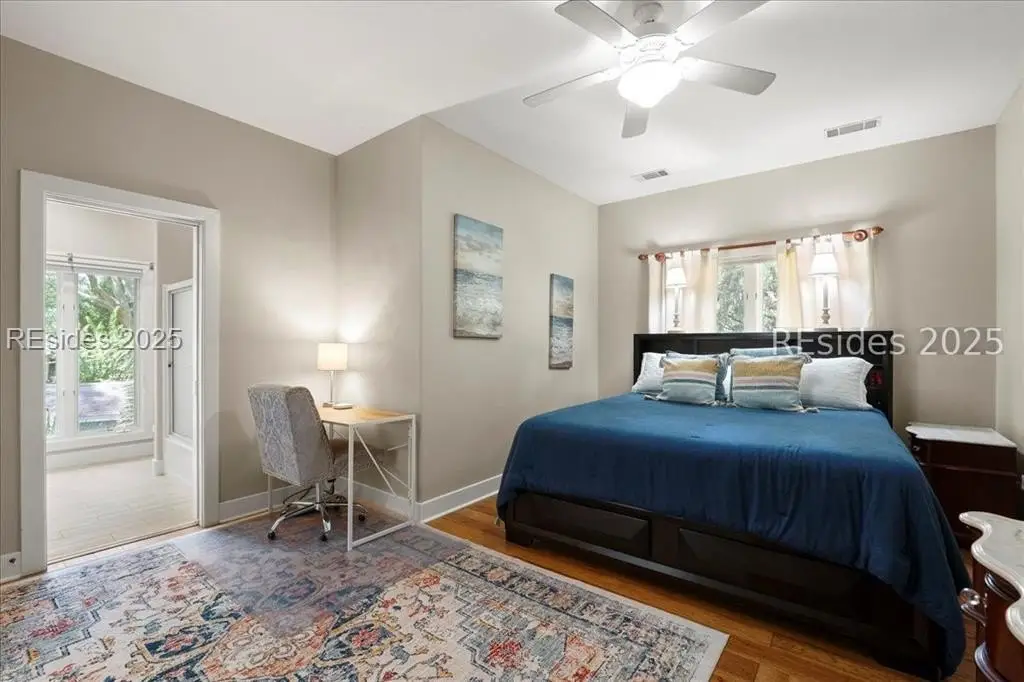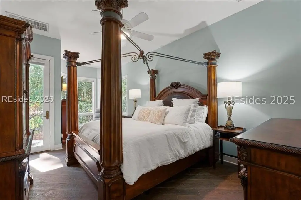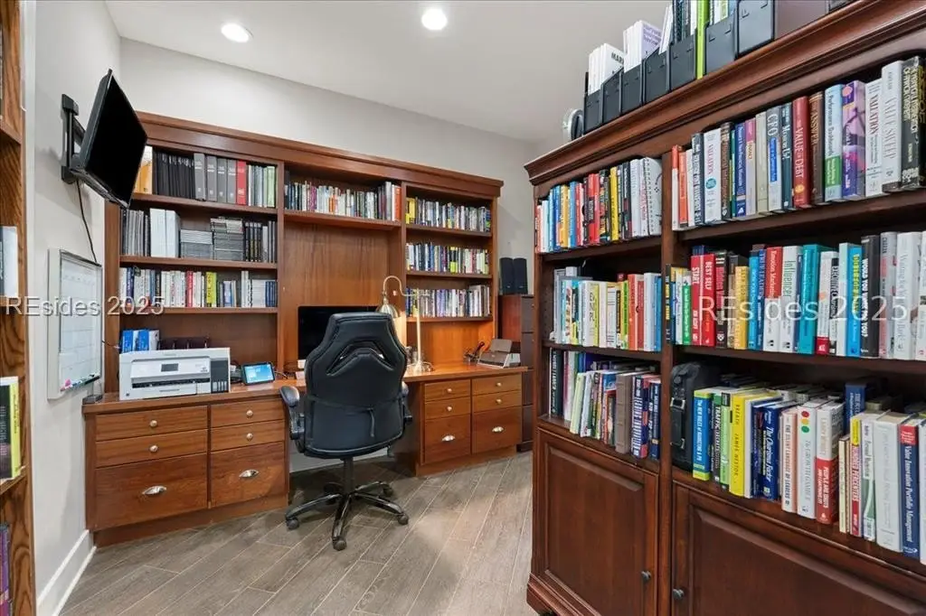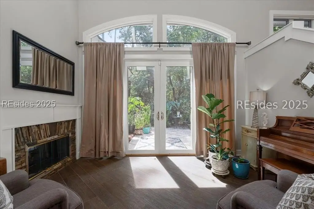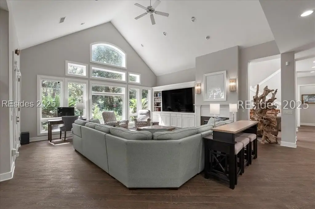 Only 300 yards from the sand, this Port Royal home ensures the Beach is part of your everyday life. The custom floor plan pairs coastal ease with modern design, set on an oversized (.86 acre) corner lot w a golf view. Inside, soaring ceilings and an open inviting layout create a light-filled gathering space with fireplace, dining, kitchen, beverage bar, and walk-in pantry. A welcoming front room with fireplace, primary suite, office, guest room & laundry complete the main level. Upstairs, a split design offers three more guest suites, including a bunk room retreat perfect for family & friends. Outdoors, enjoy lush gardens, open & covered patios designed by master gardeners. Living in Port Royal means access to private beach access, a beach house, lap pool, fire pits, leisure trails, pickleball, tennis, playground, community gardens, and 24-hour security in Hilton Heads only private oceanfront community with no short-term rentals. A warm & social setting.