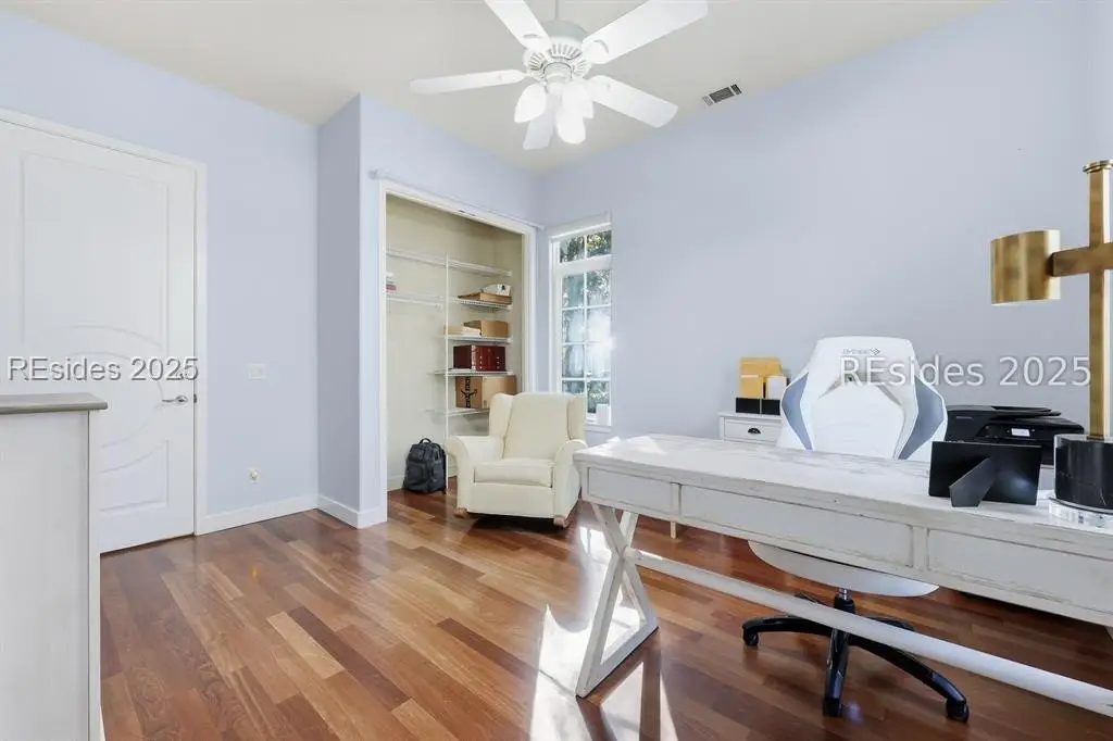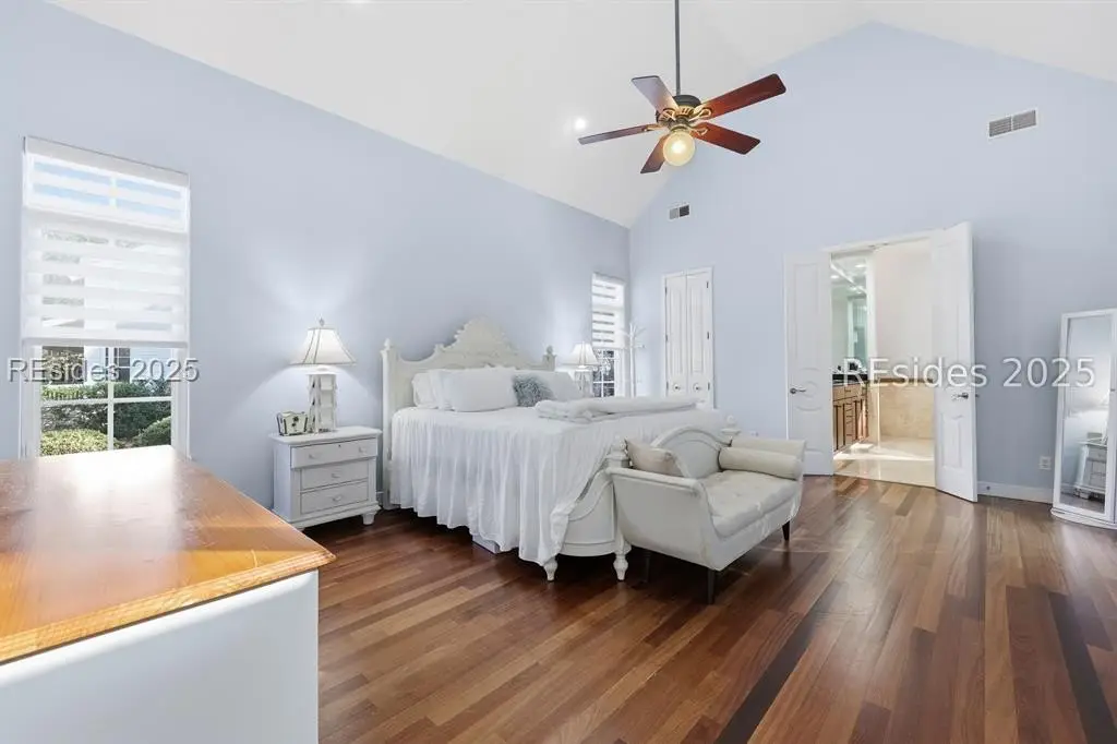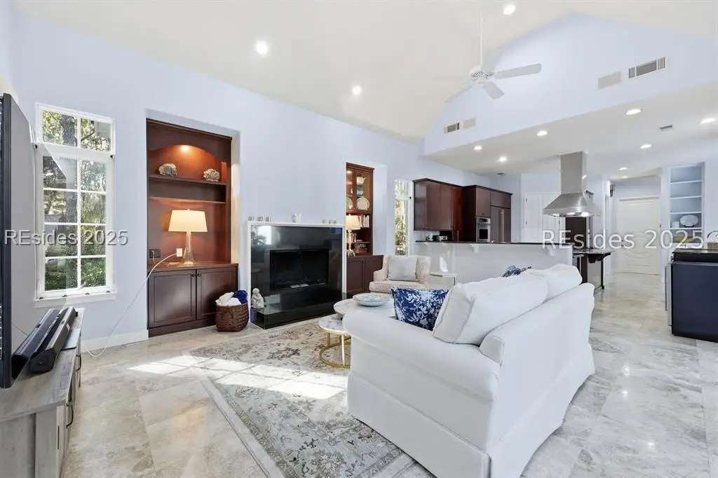 Beautifully designed and custom-built, this elegant Windmill Harbour residence captures the essence of Lowcountry luxury living. Thoughtfully planned for comfort and flow, 8 Fantail offers an exceptional blend of timeless architecture, natural light, and private outdoor living spaces.Step through the front door into an open and airy formal living and dining area, where large windows frame long views of the central courtyard and heated freeform pool. The screened-in porch provides a serene spot to enjoy morning coffee or evening breezes while overlooking this peaceful retreat.The private primary suite features cathedral ceilings, a spacious walk-in closet, and a spa-inspired bathroom with a soaking tub and separate walk-in shower. Two additional guest bedrooms share a convenient Jack-and-Jill bath, offering comfort and privacy for family or visitors.A separate guest suite and full bath are located on the opposite side of the home, ideal for extended stays. The modern chef's kitchen is a showpiece-featuring an eight-burner gas range, double wall ovens, dual Sub-Zero refrigerators, a walk-in pantry, and a cozy breakfast nook. The kitchen opens to an informal living area with cathedral ceilings, custom built-ins, and a gas fireplace-all overlooking the central courtyard and heated pool.A full pool bath and an oversized two-car garage complete the main level. Above the garage, a private guest apartment offers a living room, bedroom with en-suite bath, and two large storage closets-perfect for visitors or multi-generational living.Set within the prestigious, gated community of Windmill Harbour, home to the renowned South Carolina Yacht Club and one of the East Coast's only private lock-controlled marinas, this property offers both refined living and unmatched access to Hilton Head's coastal lifestyle.