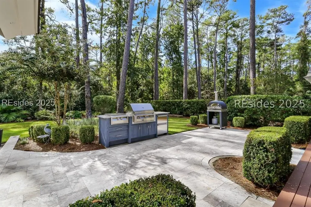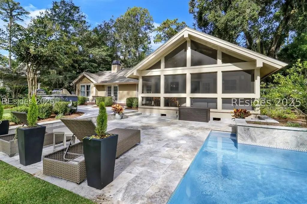 Discover coastal charm and refined craftsmanship in this beautifully reimagined 4BR/3BA home in the sought-after Club Course neighborhood of Sea Pines. Rebuilt and expanded in 2012 by Twelve Oaks Construction, this home combines Lowcountry architecture with modern luxury and the ease of all one level living.The open-concept kitchen, completely redesigned by the current owner, is a showstopper featuring all new touchstone soft-close cabinetry, quartzite countertops, and the crème de la crème appliances to include a Wolf 6-burner gas range with oven, Sub-Zero refrigerator with freezer drawers Sub-Zero wine column, and back kitchen offers additional quartzite counters, Wolf steam oven, Wolf microwave drawer, and Sub-Zero beverage center. The kitchen opens to the beautiful Great Room with tabby fireplace.The owners suite features hardwood flooring, crown molding, his/her walk-in closets, and a bath with dual marble vanities and a walk-in tiled shower. Three guest bedrooms include one ensuite with sitting area and private bath and two bedrooms sharing a stylishly updated bath. Additional features include hardie plank siding, spray foam insulation, 2017 roof, 2023 tankless water heaters, 2023 Trane 4-ton HVAC.Step outside to your private oasis where the current owner added a stunning swimming pool/spa surrounded by all new lush landscaping, outdoor lighting, screened porch, and outdoor kitchen.This meticulously updated home embodies the relaxed yet sophisticated Sea Pines lifestyle where coastal living meets timeless design.
