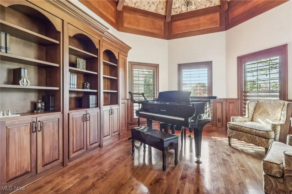 Nestled within a serene landscape, this custom-built home exudes elegance through meticulous craftsmanship & exquisite details. Upon entering you're greeted by a tremendous sweeping staircase, intricately designed woodwork, trim & molding that reflect the highest standards of artistry, spanning an impressive 7900+ sq.ft. Large pond is a picturesque centerpiece, highlighted by a soaring fountain, meandering walking path, sandy beach & charming she shed. These features transform the outdoors into a tranquil oasis. providing integration of indoor & outdoor living, dining & entertaining. Kitchen is chef's paradise, with two-tiered island, breakfast bar, high end appliances, & custom cabinetry blending functionality with style. Inviting hearth room w/ beamed ceiling & cozy wood burning fireplace all opening out to expansive terrace overlooking resort like grounds. Walk through pantry w/ ample storage & prep space lead to formal dining room w/ built in cabinets, buffet & French doors that open to outdoor courtyard for restaurant like dining. 2 story great room boasts stunning wall of windows framing breathtaking views allowing natural light to flood the space. Impressive fish tank serves as 2 sided centerpiece showcasing tropical & rare fish as serene focal point. Stunning library with decorative cathedral ceiling, rich wood built ins, & secret door to expansive primary bedroom w/ sitting area with terrace overlooking the pond. Spa-like bath, w/ walk-in shower, jetted tub & double vanities for ultimate relaxation. Convenient laundry on 2 levels. Upstairs you'll find 4 nicely sized bedrooms, 2 boast en suite baths & 2 share Jack n Jill, all with walk-in closets, ample storage & privacy. Walkout lower level is luxurious retreat featuring fully equipped bar with pizza oven, spacious theatre room, sizable workout room, 2nd office, full bath, billiards & rec area walking out to serene patio w/hot tub creating a peaceful escape. This luxurious home is truly one of a kind.