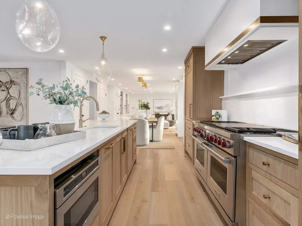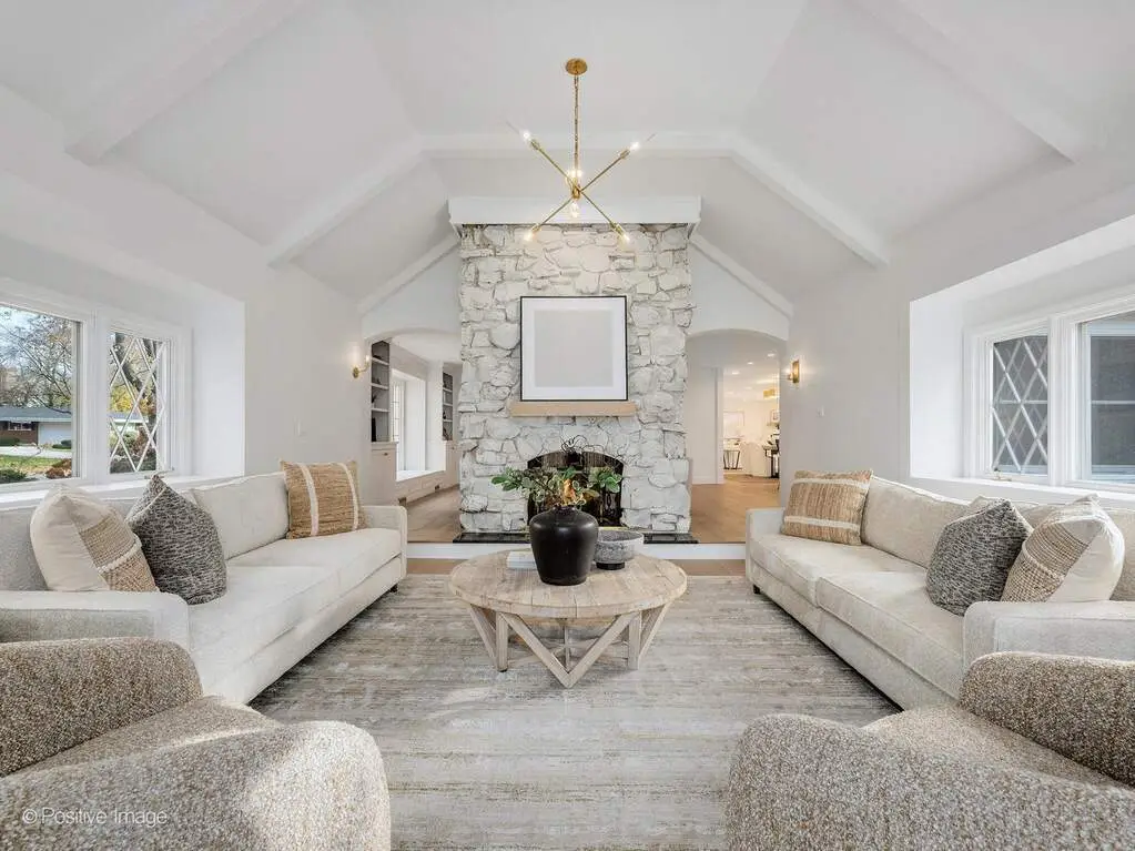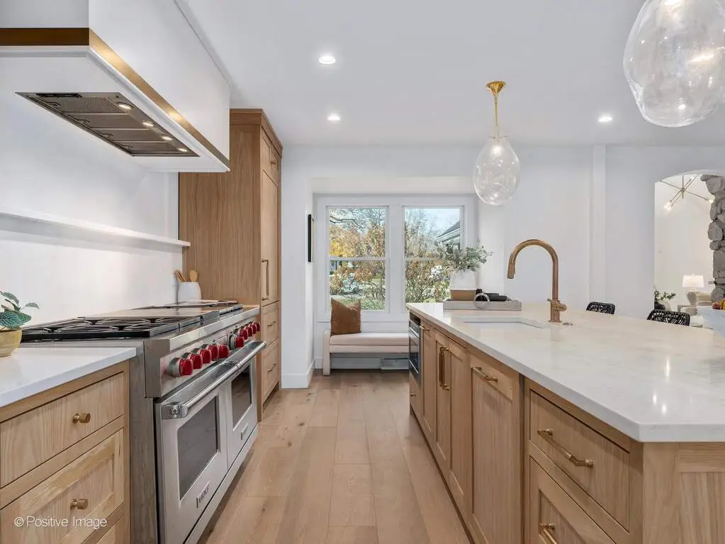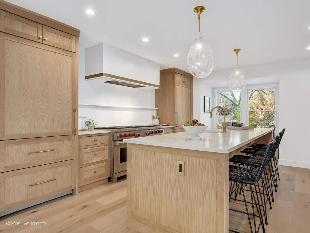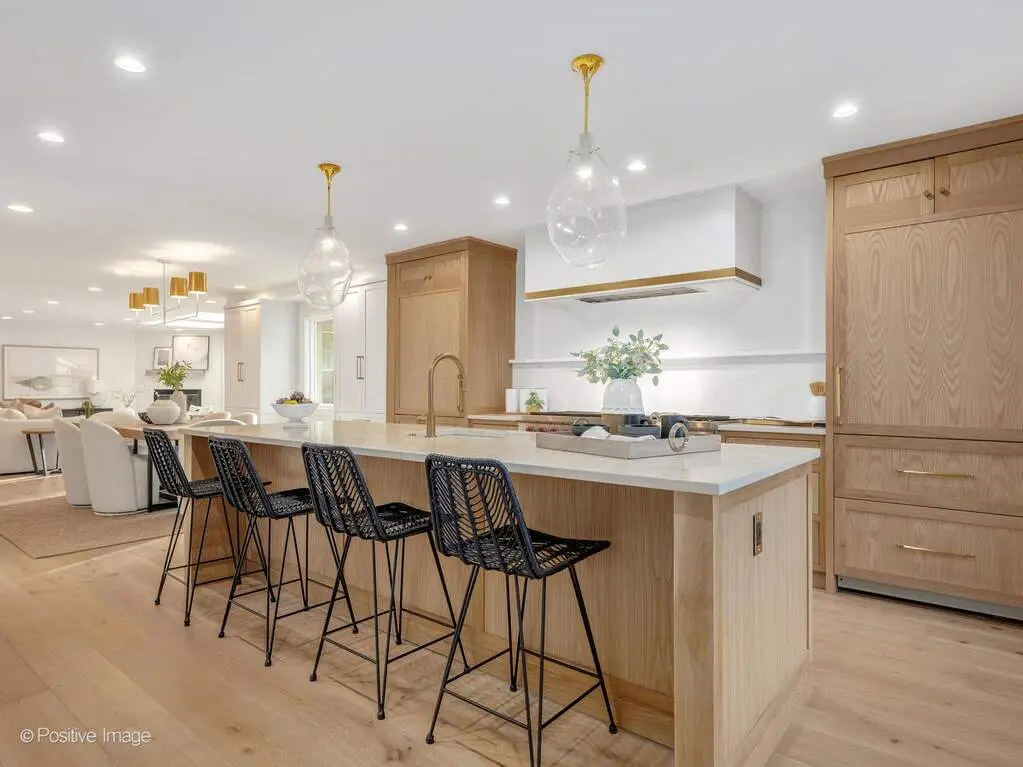 Experience California-inspired organic chic in this fully reimagined 2025 renovation by a California designer and Hinsdale native. Natural materials, warm textures, and high-end craftsmanship come together to create a home that feels elevated and deeply inviting. European white oak floors, Farrow and Ball paint, brass hardware, and Visual Comfort lighting throughout establish a refined, modern-organic aesthetic. Step inside to a calming, modern living room where a dramatic stone fireplace warmly anchors the home. This impressive architectural centerpiece is open to both the living room and the adjoining great room, which features striking vaulted ceilings and stunning windows, adding volume, natural light, and architectural lift. The space flows into the custom white oak kitchen, which opens seamlessly into a comfortable, light-filled family room. The kitchen is a true focal point, anchored by an oversized 10 foot white oak island wrapped in Taj Palazzo Orion Quartz on both the island. Custom recessed white oak cabinetry, two 36-inch Sub Zero built-in refrigerators, and a professional 48-inch Wolf dual fuel range with eight burners create a chef-level environment. The primary suite offers a serene retreat with a spacious walk-in closet illuminated by a designer chandelier. The spa-like bath features a custom inset white oak vanity, Calacatta Gold Quartz, Brizo and Kohler fixtures, and a natural pebble-stone shower floor. The second floor also includes four additional bedrooms, one of which can flex as a bonus room, office, or playroom. A gorgeous second-floor laundry room features designer tile and an oversized rattan fixture. The lower level offers 1,716 square feet of flexible living space with a full bath and an open palette ready for your family's vision. Set on a wide peninsula-style 0.34 acre lot with rare 187-foot frontage, the property offers open space, presence, privacy, and generous room to enjoy outdoor living. Exterior features include an attached garage with natural wood garage doors, elegant gas lanterns, professional landscaping, mature trees and landscape lighting. Located in the award-winning Monroe School, Clarendon Hills Middle School, and Hinsdale Central High School district. A rare, thoughtful renovation blending California warmth with Midwestern livability, beautifully designed from top to bottom.