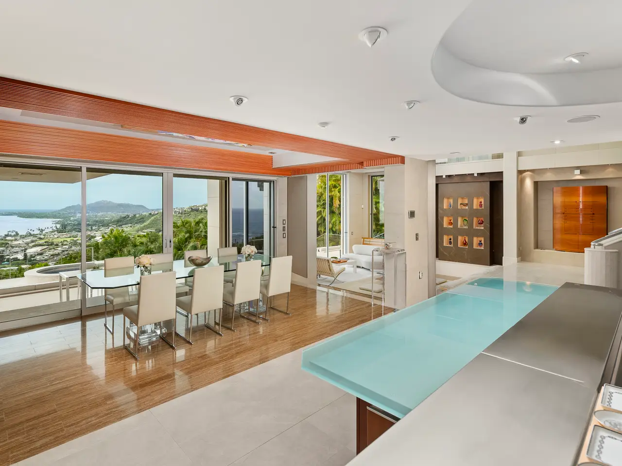 Perched on a prime hillside, Kaimana Hila offers sweeping views of Diamond Head, the Pacific Ocean, and Oahu’s lush coastline and mountains from nearly every room. Designed by award-winning architect Jeff Long, this residence combines resilient steel-and-concrete construction with high-fashion interiors crafted by artisans known for their work on ultra-luxury yachts and couture boutiques. Exquisite details like Spinneybeck leather walls, custom Italian closets by Molteni & C Dada, and seamless, vein-matched travertine marble bathrooms showcase luxury at every turn. At its heart, a Pininfarina-designed kitchen with Snaidero cabinetry and Gaggenau appliances elevates daily living and entertaining alike. Outside, an expansive limestone lanai with a saltwater infinity pool and hot tub, framed by lush landscaping and breathtaking views, creates a resort-style sanctuary. German-engineered hurricane shutters, a professional security system, and the exclusivity of Honolulu’s premier gated community, Hawaii Loa Ridge, make Kaimana Hila a true lock-and-go residence—offering unmatched luxury and refinement in Honolulu.