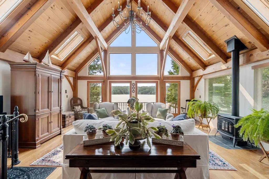 • Custom Douglas Fir Post & Beam Great Room with lake views