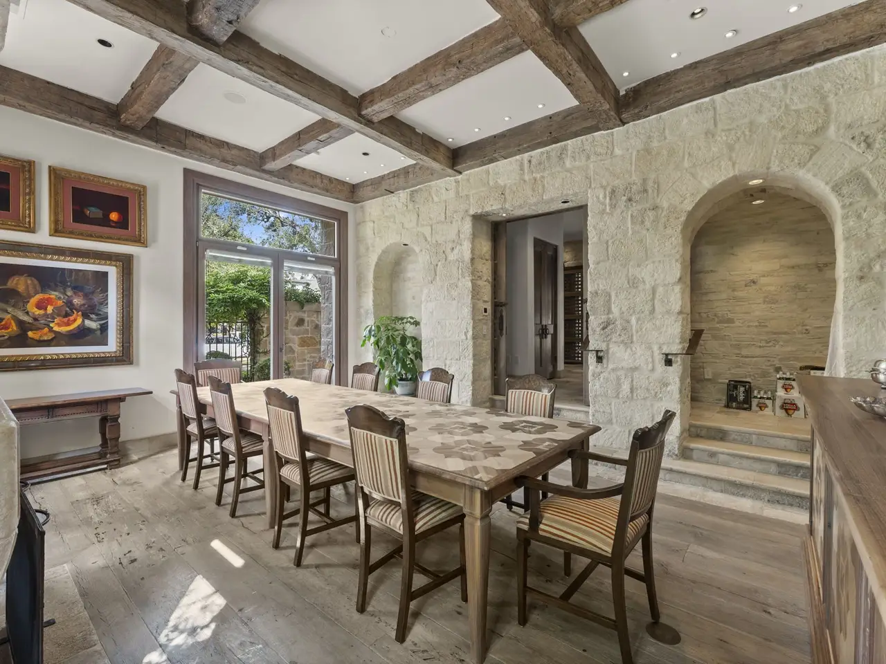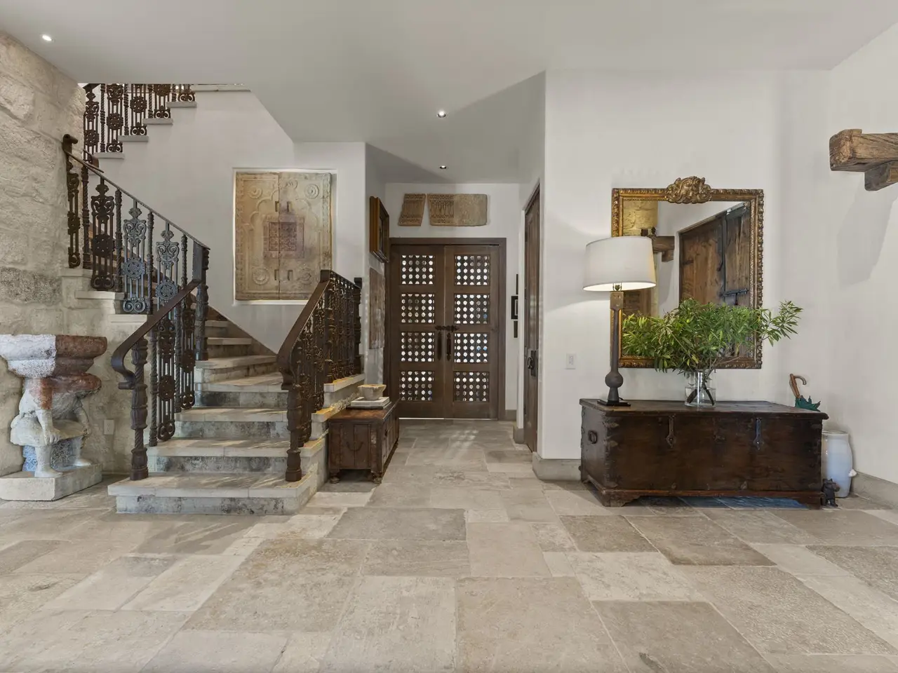 A rare opportunity to own a Tuscan-inspired masterpiece on Doliver Drive — an estate of timeless European craftsmanship and modern luxury. Enclosed by hand-built stone walls and wrought-iron gates from Italy, the home features antique marble fountains, a teak pool deck, venetian plastered walls, and custom Italian windows blending Corten steel and oak. Inside, an antique Indian door opens to floors of reclaimed marble from Provence and wide-plank French oak, with ceilings of hand-hewn beams. Four antique fireplaces from France and India anchor the living spaces. Every detail reflects global artistry — from Italian and German fixtures to Brazilian granite and hand-carved doors from Mexico and India. A true European retreat in the heart of the city, uniting old-world charm with contemporary sophistication.