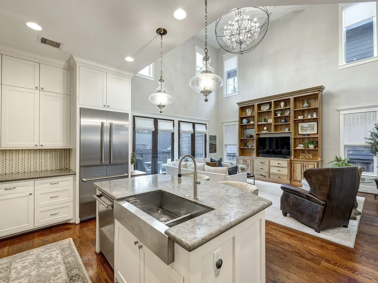 Spectacular Heights home features 4/5 bedrooms-4 baths, pool + primary bedroom down. Fully fenced. Hardwood floors, stunning light fixtures and plantation shutters/window treatments. Gourmet kitchen offers granite counters, island, s/s appliances and walk-in & butler pantries. Family room with vaulted ceiling is the perfect spot to enjoy everyday living. Dining room is set for holiday gatherings. Front living room is an ideal space to enjoy quiet conversations. Large study is a true home office. Primary bedroom suite with tray ceiling and sitting area is well-appointed with a spa-like bath with double sinks, soaking tub, walk-in shower and 2 two walk-in closets. Climate controlled wine cellar can house 300+ bottles. Upstairs includes a secondary bedroom with en suite bathroom, 2 other secondary bedrooms, hallway bath, gameroom with wet bar + media room. Backyard oasis with pool/spa, pergola/deck. Two car oversized attached garage. Extra off-street front parking w/ automatic gate.