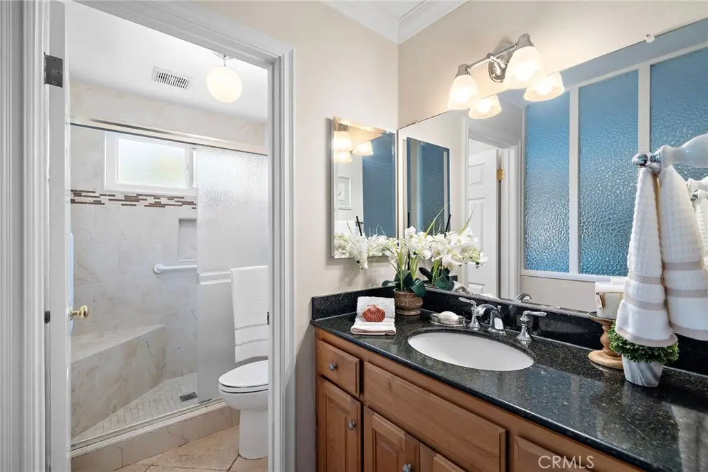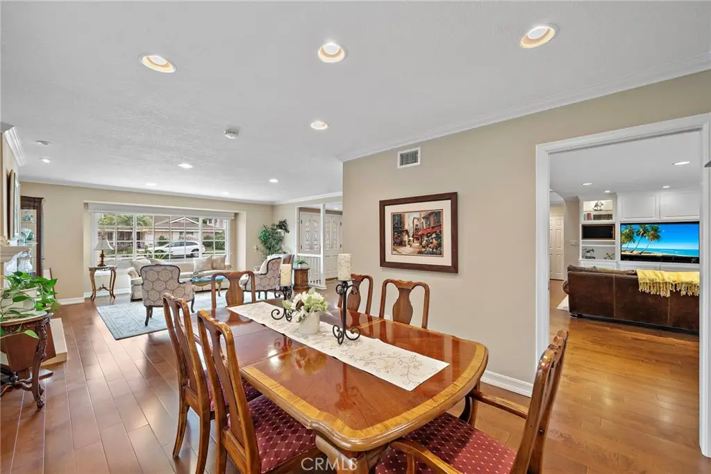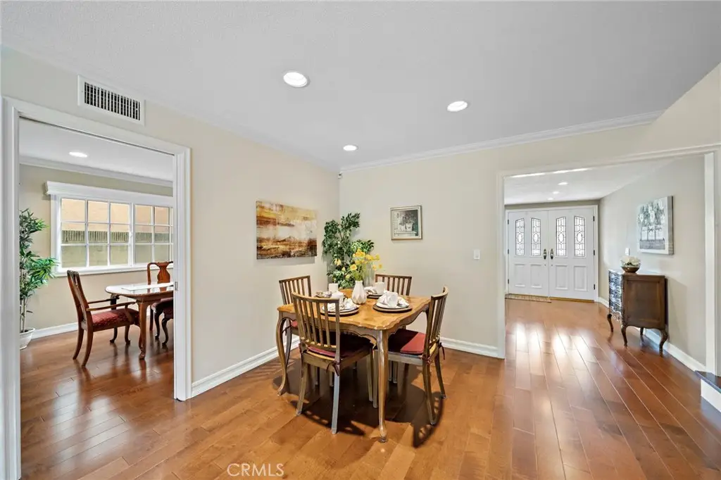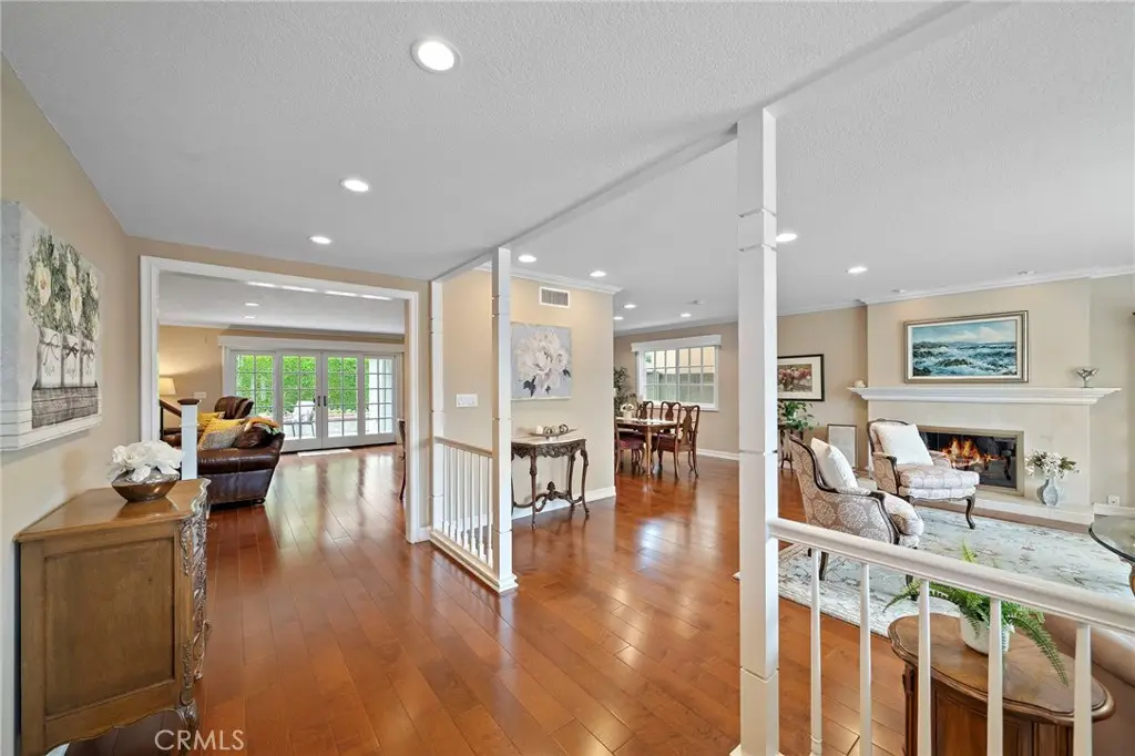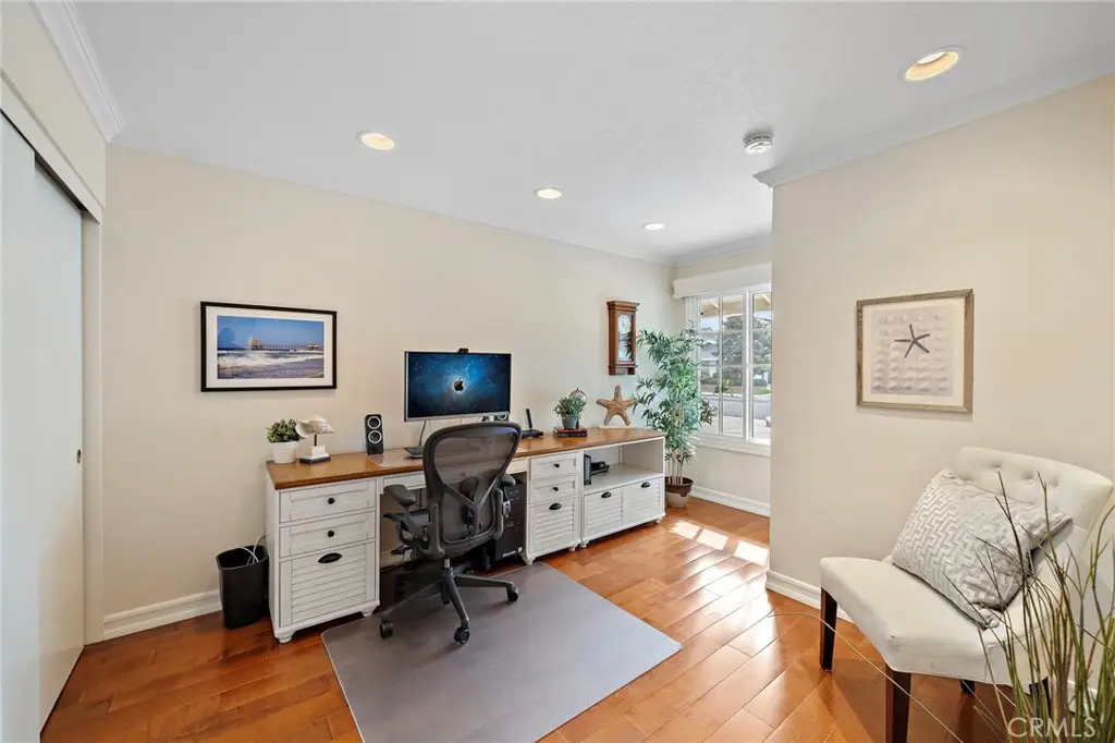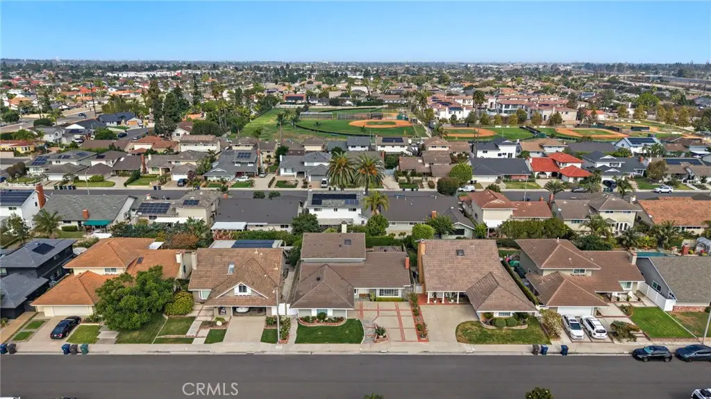 Located Just Moments From The Neighborhood Park And Bike Trail, This Stunning Residence Offers 5 Bedrooms, 3 Bathrooms, And Over 2,800 Sq. Ft. Of Thoughtfully Designed Open Concept Living Space -- Including A Primary Suite Conveniently Located On The Main Level. The Downstairs Showcases Custom Hardwood Flooring, Recessed Lighting, Crown Molding, and French Dual Pane Windows, French Doors, and Custom Silhouette Blinds. This Magnificent Estate-Style Home Boasts Gorgeous Curb Appeal with Brick Hardscape and Professional Landscaping. Double Entry Doors Open to a Formal Foyer, Elegant Formal Living Room with Marble Fireplace and Formal Dining Room which Flows Seamlessly into the Large Family Room with a Cozy Raised Hearth Fireplace, Custom Built-In Entertainment Center, and Breakfast Nook. The Gourmet Kitchen Has Been Professionally Expanded And Remodeled With Granite Countertops, Subway Tile Backsplash, Soft-Closing White Shaker Cabinetry, Stainless Steel Appliances, Skylights, And A Custom Island With Bar Seating. A Large Bay Window Overlooks The Garden, Flooding The Space With Natural Light. Also On The Main Floor Are Two Highly Desirable Guest Bedrooms And A Full Bath with Dual Sinks. Upstairs, You'll Find Two Oversized Bedrooms, One with Built-In Desk, and A Full Guest Bath with Dual Sinks. Additionally there is a Gigantic Walk-In Storage Closet which Could Almost be a Bonus Room. Additional Highlights Include Dual-Pane Windows Throughout, Central Air Conditioning And Heating, Copper Plumbing, Raised Panel Interior Doors, Mirrored Closets, And Direct Access To A Fully Finished Garage Complete With Abundant Storage, A Workbench, Pull-Down Attic Access, And Epoxy Flooring. Conveniently Located Near Beach, Shopping, Parks, And Award-Winning Schools, This Home Truly Reflects Pride Of Ownership.