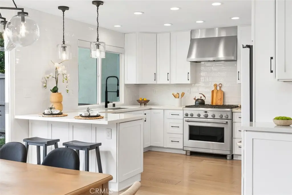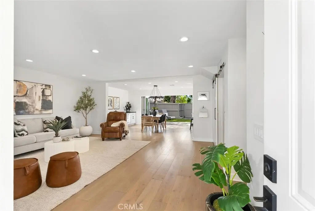 Beautifully remodeled down to the studs in 2021, this 3-bedroom, 3-bath single family attached home showcases high-end finishes from that renovation, including a quartz-topped built-in buffet with under-counter dual refrigeration, full home automation, new HVAC and ducting, new windows, recessed lighting and designer fixtures, and soft-close drawers and cabinets. Current upgrades include brand-new carpet, custom roller shades, epoxy garage floor, Noritz tankless water heater, and new built-in quartz-topped cabinetry that frames a sleek, modern tiled electric fireplace. The chef's kitchen boasts quartz countertops, breakfast bar, premium GE Cafe appliances, and a walk-in pantry with an additional lighted storage area under the staircase. The open, light-filled layout features beautiful hardwood flooring and flows through a 12-foot accordion glass door to a serene private backyard, perfect for indoor-outdoor entertaining. All bedrooms feature vaulted ceilings and abundant natural light. The primary suite includes a walk-in closet, dual vanities, and a large walk-in shower, while the downstairs bathroom also offers a spacious walk-in shower. Additional highlights include a gated private front patio with potential for a room addition connecting to the garage, overhead garage storage with utility sink and laundry hookups, and ADU potential within this Beachwalk community. The home is ideally located near one of the four additional satellite pools located throughout the neighborhood. Set on a quiet cul-de-sac with plentiful guest parking, residents enjoy the community's Jr. Olympic-sized saltwater pool, spas, saunas, lush greenbelts, sand volleyball courts, and newly renovated clubhouses. Access includes an automated gated entrance from 17th Street as well as non-gated guest access from Goldwest Street. Just minutes from the sand, Pacific City, top-rated schools, and all the amenities of Downtown Huntington Beach, this home delivers resort-style living and modern coastal elegance.