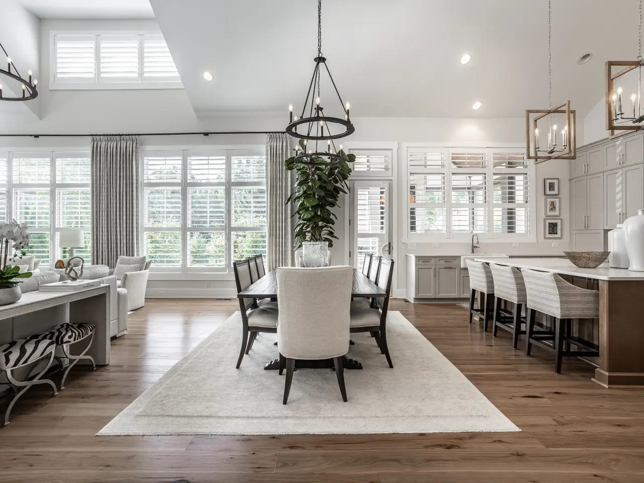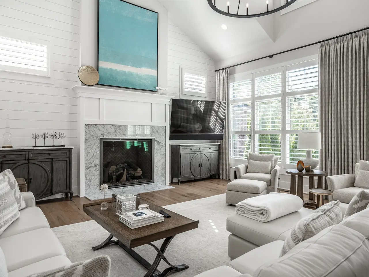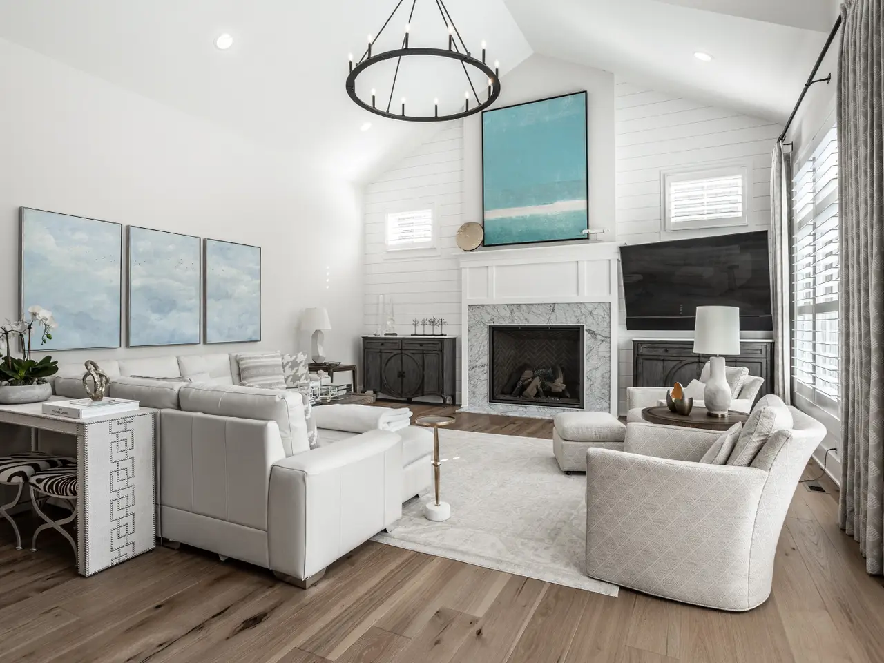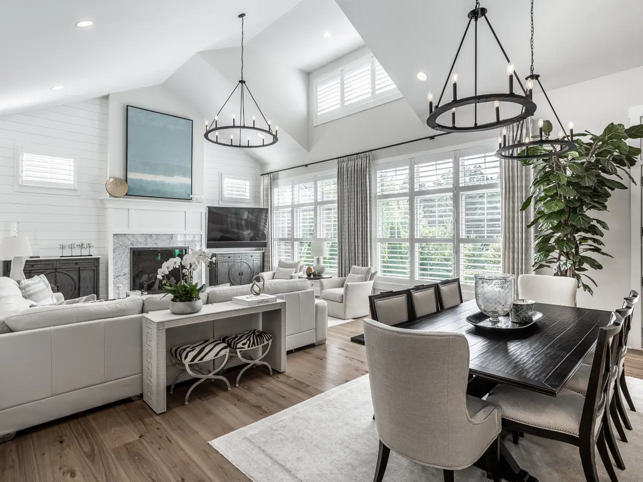 Soaring vaulted ceilings and striking gas fireplace