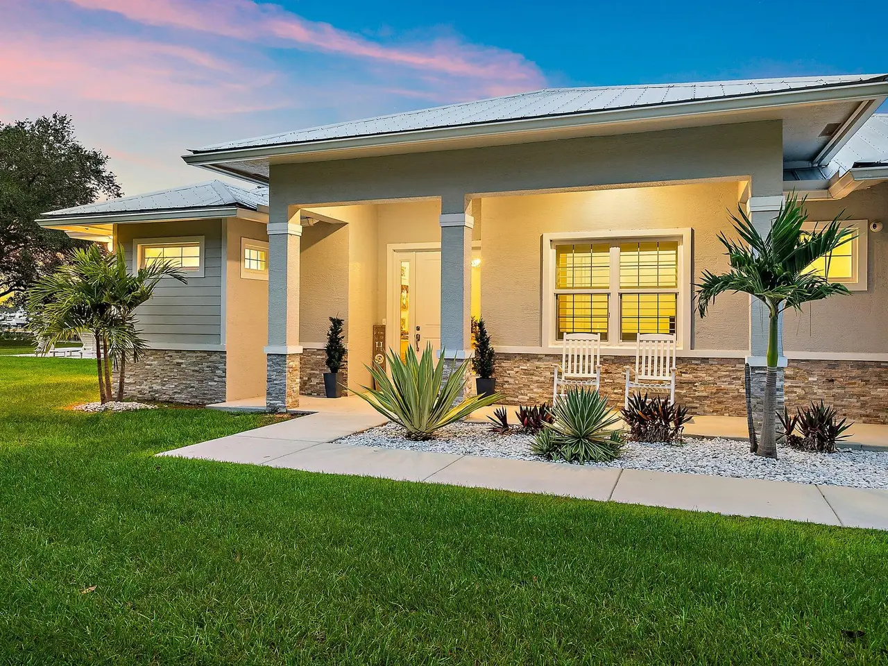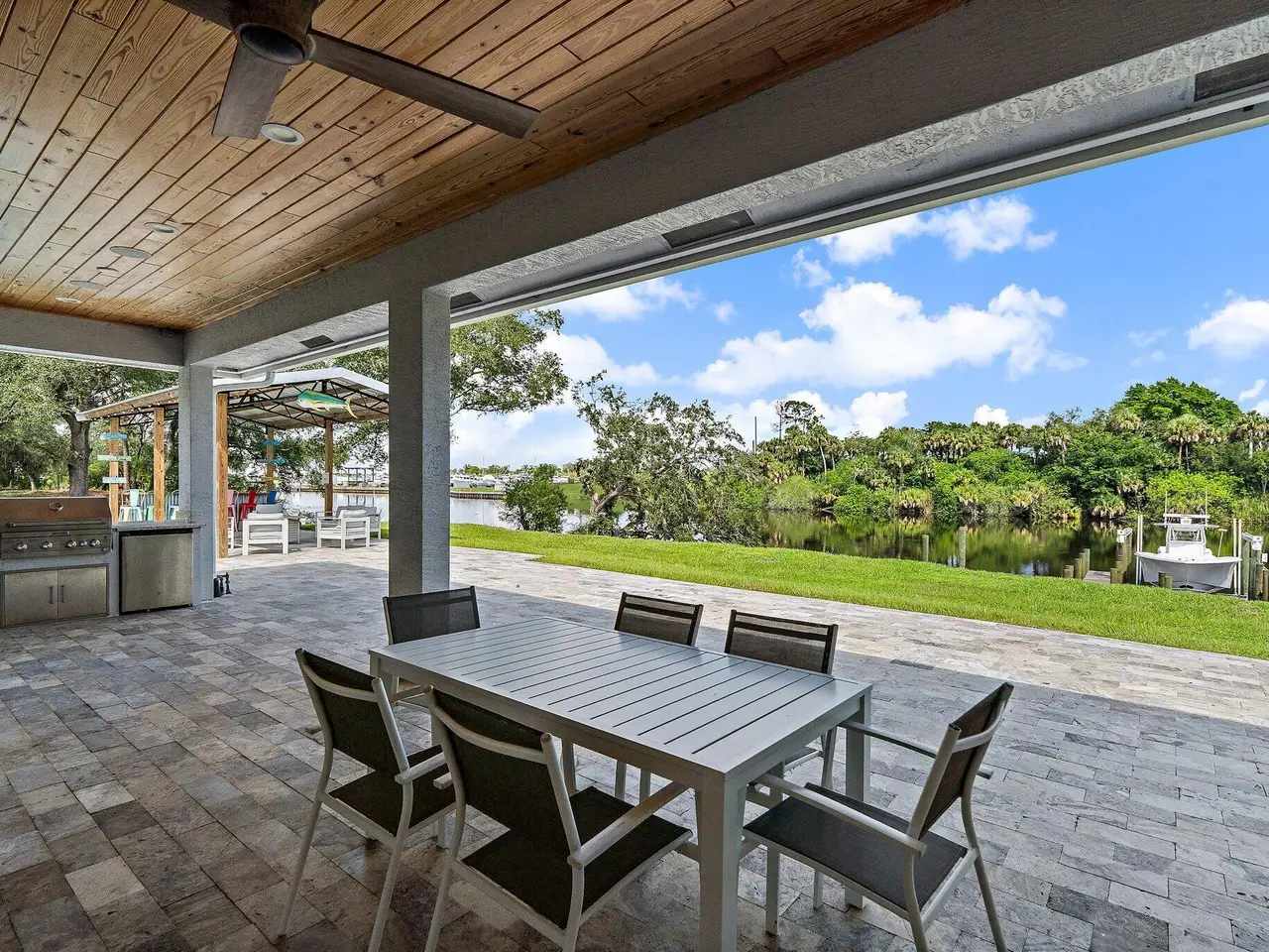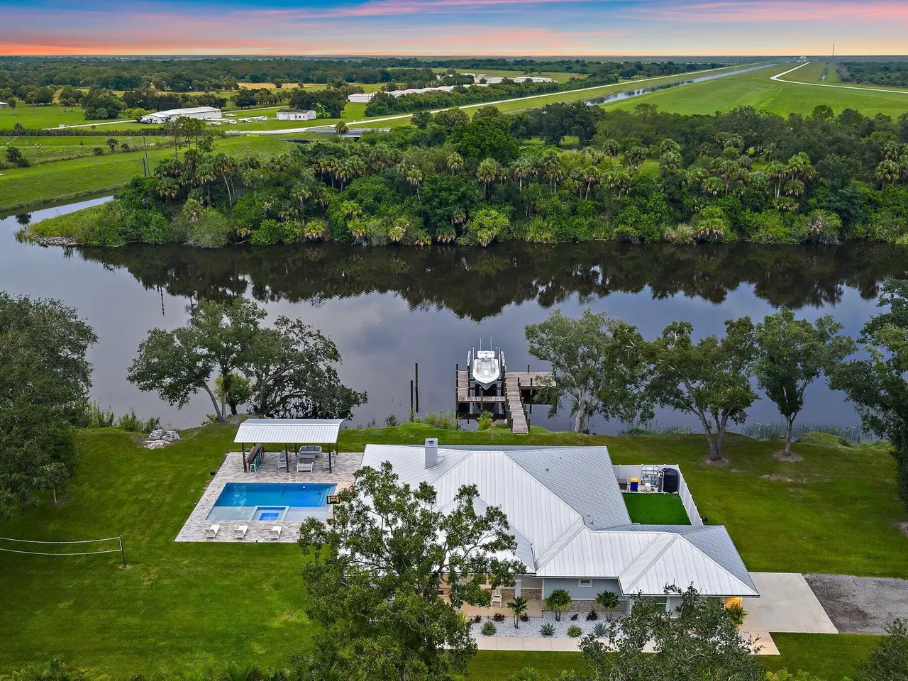 Welcome to your private waterfront retreat on the St. Lucie River. This newly constructed, CBS-built residence in Indiantown, Florida offers the perfect blend of luxury, serenity, and recreation. With 2,833 square feet under air (4,088 total), the home is thoughtfully designed with four bedrooms, three baths, and exquisite finishes including wood-look tile flooring, plantation shutters, impact windows and doors, a metal roof, and soaring 12-foot coffered ceilings beneath a 10-foot beam roof. The chef's kitchen is a showpiece, featuring a seating island, wet bar, and walk-in pantry, complemented by a formal dining room for entertaining. Retreat to the spacious master suite, where a glamorous spa-like bath and custom built-in closets provide everyday indulgence.
