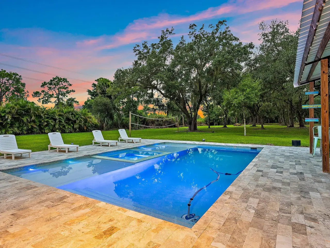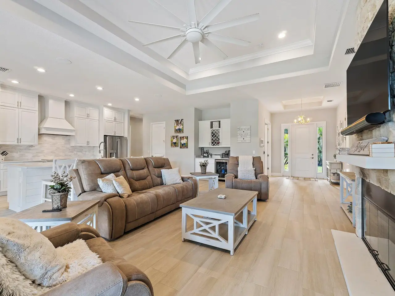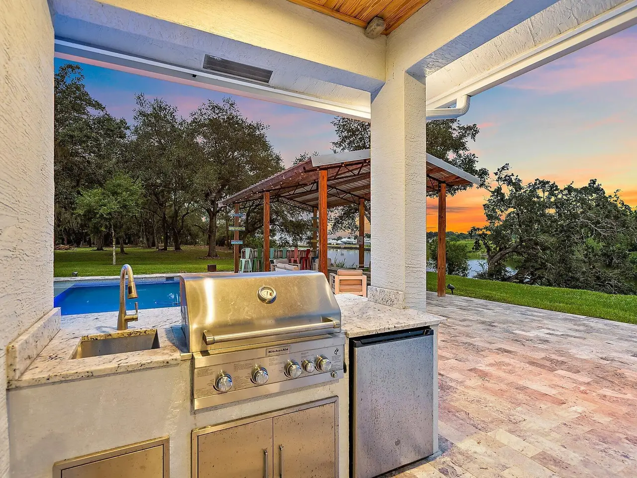 Welcome to your private waterfront retreat on the St. Lucie River. This newly constructed, CBS-built residence in Indiantown, Florida offers the perfect blend of luxury, serenity, and recreation. With 2,833 square feet under air (4,088 total), the home is thoughtfully designed with four bedrooms, three baths, and exquisite finishes including wood-look tile flooring, plantation shutters, impact windows and doors, a metal roof, and soaring 12-foot coffered ceilings beneath a 10-foot beam roof. The chef's kitchen is a showpiece, featuring a seating island, wet bar, and walk-in pantry, complemented by a formal dining room for entertaining. Retreat to the spacious master suite, where a glamorous spa-like bath and custom built-in closets provide everyday indulgence.