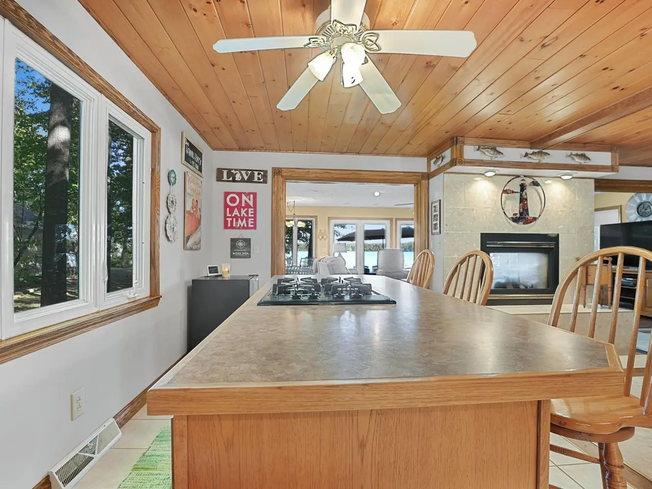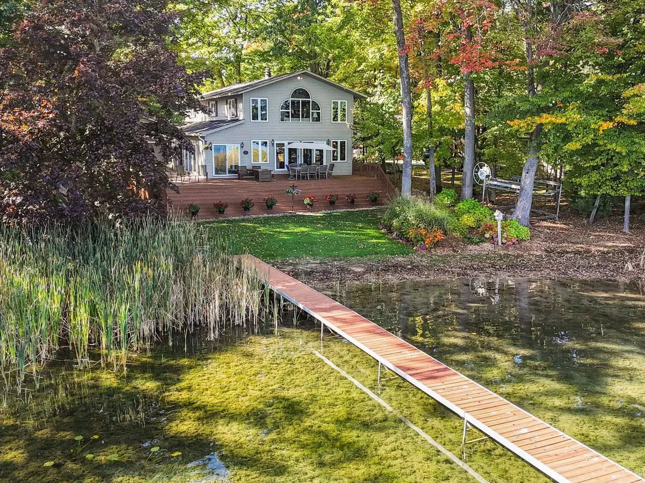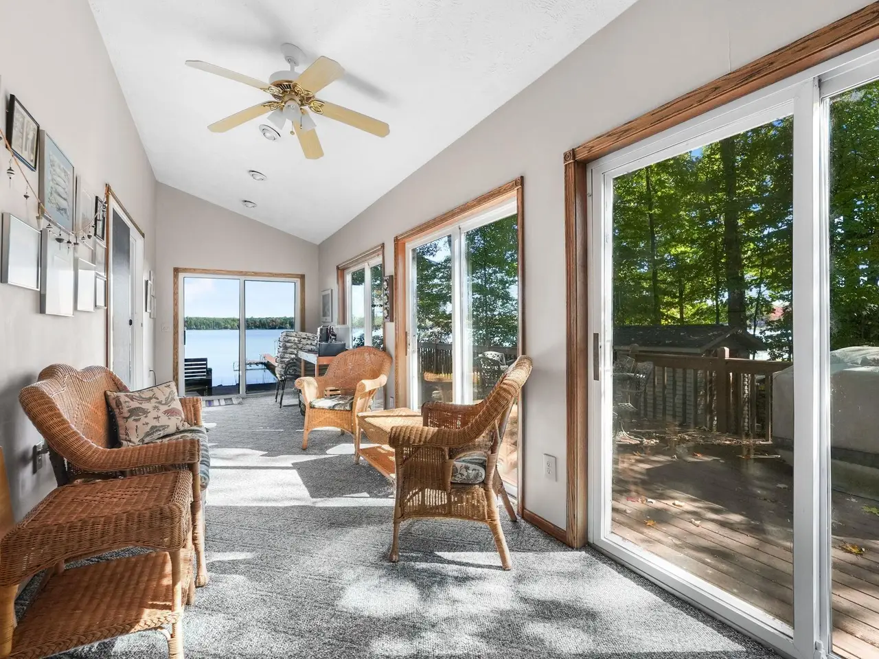 An entertainer's dream! This home boasting over 3,600 square feet with private, direct, level frontage on Green Lake has room for all of your family and friends. Gorgeous wood floors invite you into the warm living room with stunning lake views, and a two-sided fireplace to keep you warm during the cooler months. Open the double french doors to the expansive wrap-around deck to bring the outside in, and increase your spacious living area even further! On the other side of the fireplace is a large dining room with enough space for a huge table - plenty of room for everyone during the holidays. The kitchen is conveniently located a few steps away, and even has a second cooktop and island for when you have multiple chefs at work, or just want to be closer to your guests. The main floor is rounded out with a bedroom and ensuite bathroom, powder room, and fabulous sun porch. Upstairs you'll find a massive primary bedroom with the best lake views in the house, cozy gas fireplace, and attached office. Two additional bedrooms, a bathroom with jetted tub and shower, and laundry room make the second floor just as spacious as the first. Between the house and the garage are 2 finished and heated bonus rooms - One is a multi-purpose room great for crafts and games, and the other has closets galore and has been used as a bunk room for additional guests. You will never run out of storage space in this extra-deep attached and insulated 3-car garage! The tall doors allow storage for campers, boats, and seasonal toys, plus there is easy access via stairs to a large attic area. The brand new roof and newer furnace will ease your mind and save you money. Start planning for next summer now, and schedule your showing today!
