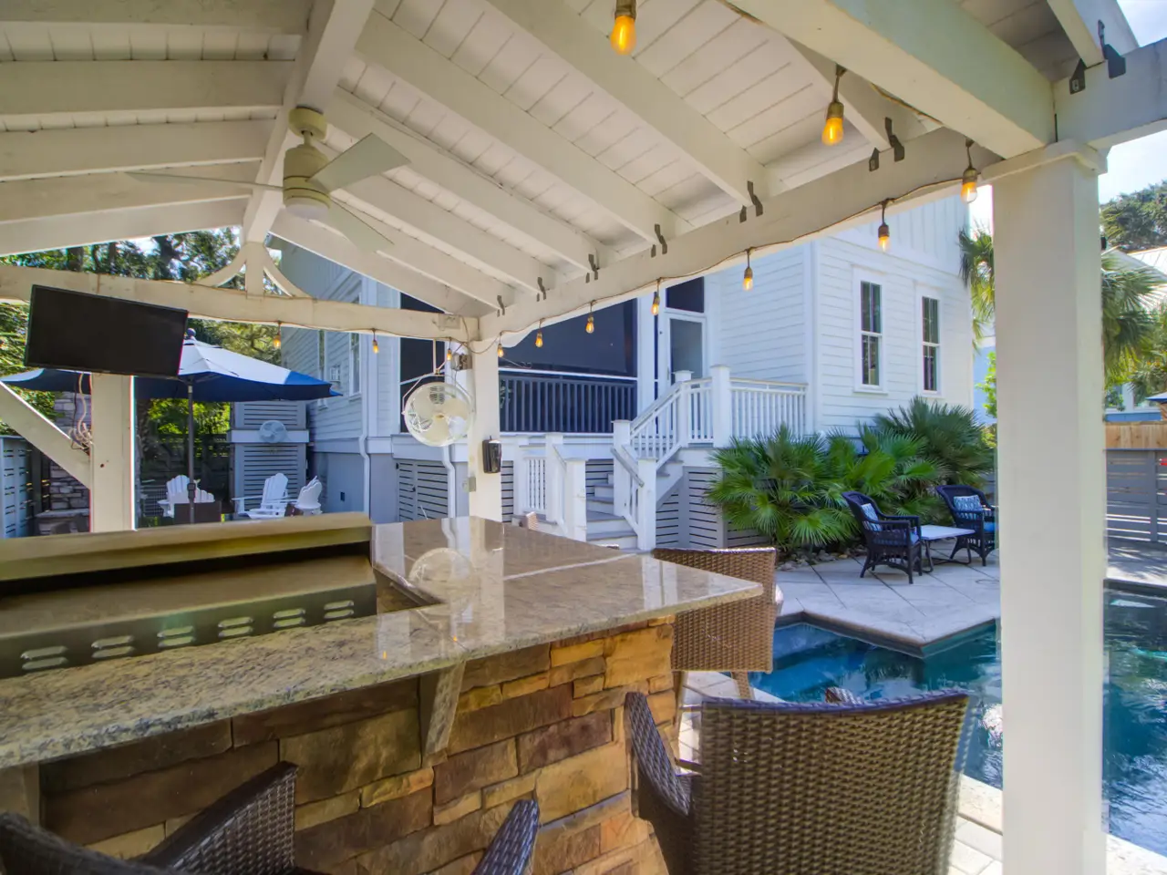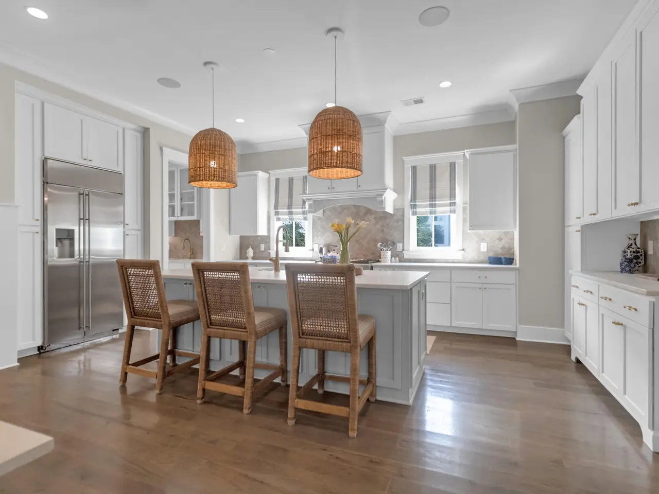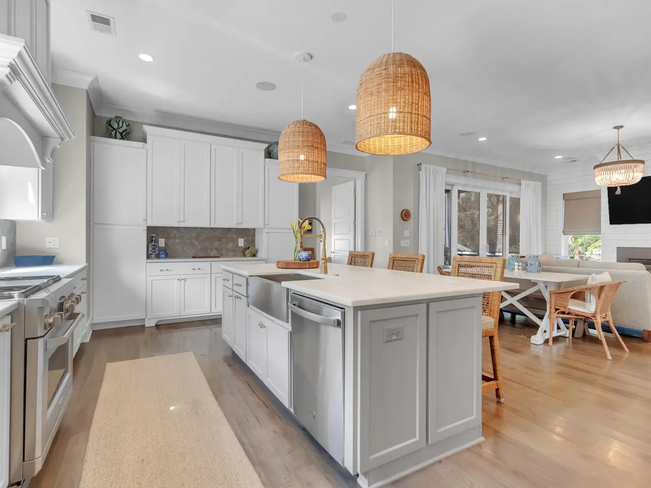Coastal Luxury with Pool & Beach Access This 5-bedroom, 4.5-bath home combines refined design with thoughtful functionality, just steps from the sand. The open floor plan showcases rich hickory flooring, abundant natural light, and attention to detail throughout. At the heart of the home is the spacious kitchen with marble counters, abundant cabinetry, gas range, a butler's pantry with sink and beverage station that seamlessly flows into the family and dining areas. The first floor also features a private study/office, a separate dining room, and one of two expansive primary suites--ideal for multigenerational living. Upstairs, you'll find the second primary suite plus additional bedrooms for family and guests. The 2nd level also features an open area for gathering,a laundry room withplentiful storage and laundry sink. All of the guest bedrooms feature walk-in closets. One of these has a private bath the other two share a nicely done hall bath. The upstairs primary offers a handsome coffered ceiling, double walk-in closets and a well appointed bath. Then, just step outside where outdoor living takes center stage with a fabulous oasis featuring an in-ground pool, covered patio with a built-in grill, refrigerator, dining bar, tv, and an additional patio area with a true wood-burning fireplacperfect for entertaining year-round. The oversized detached garage includes finished space above, offering endless possibilities for an office, gym, playroom, or studio. All this, with convenient beach access (just through the back gate and less than a block away), makes this property the ultimate blend of elegance, comfort, and coastal convenience.