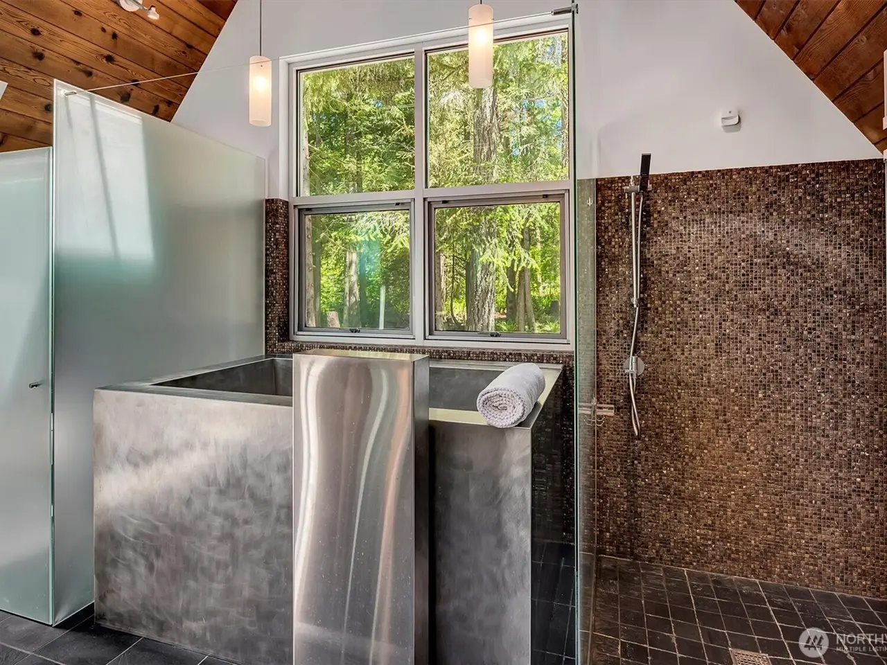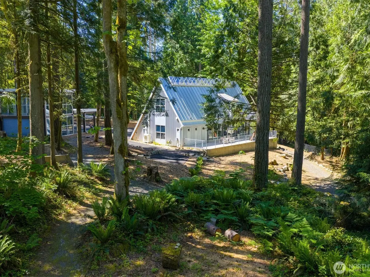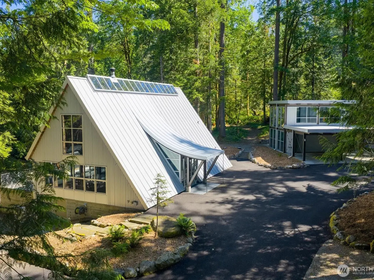 A dramatic steel-and-glass A-frame designed by renowned Sandler-Kilburn Architects, this awe-inspiring home is a bold expression of modern design set on over an acre of serene, wooded landscape. Striking and sophisticated, the home blends industrial elements with the warmth of natural materials. Inside, custom walnut cabinetry frames a sleek, contemporary kitchen with new cabinetry & refrigeration, while a Tulikivi soapstone fireplace anchors the living space with sculptural elegance. The primary suite offers a luxurious escape, featuring a stainless steel Japanese soaking tub for ultimate relaxation. A detached steel-and-glass garage or studio includes a separate meter. 3 heat sources and covered parking for 4 cars. Skylights and EV charger!