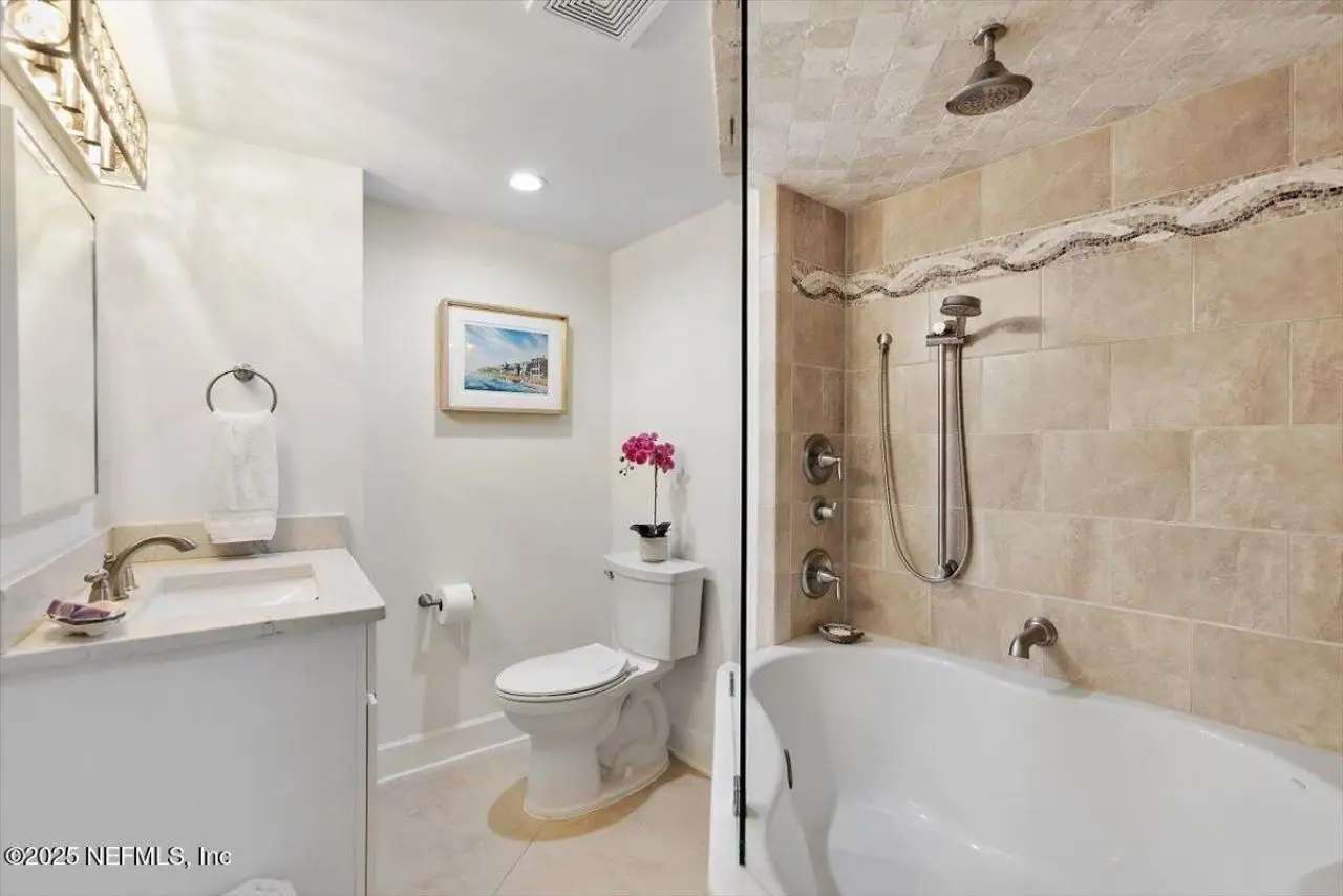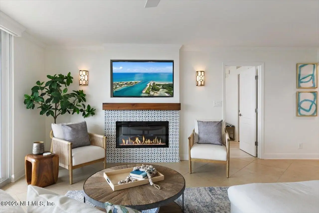 Beautifully appointed 2BR/2BA condo w/40' balcony with sunrise & sunset views. Enjoy beach & downtown Jax fireworks & the Blue Angels without leaving your balcony! Floor to ceiling glass doors w/automated shades. Living rm w/custom FP. Kitchen w/GE Profile SS appl, glass back splash & quartz. Dining w/glass front buffet & b'fast bar. Outdoor dining & sitting area to take in ocean breezes. King primary suite w/large walk-in custom closet, additional closet, bath w/walk-in shower, custom niches, & double vanity w/quartz. Hall closet for storage. Queen BR w/closet. Stacked W/D in unit. Guest bath w/large soaking tub & rain head shower. Designer touches throughout. HOA dues include fitness cntr, (2) pools, grill area, bike storage, building ins, water & sewer, trash, grounds maintenance & on-site property mgmt. $7 million restoration completed May 2025 & assessment PIF. SELLER REQUIRES pre-approval or POF letter to tour this home.