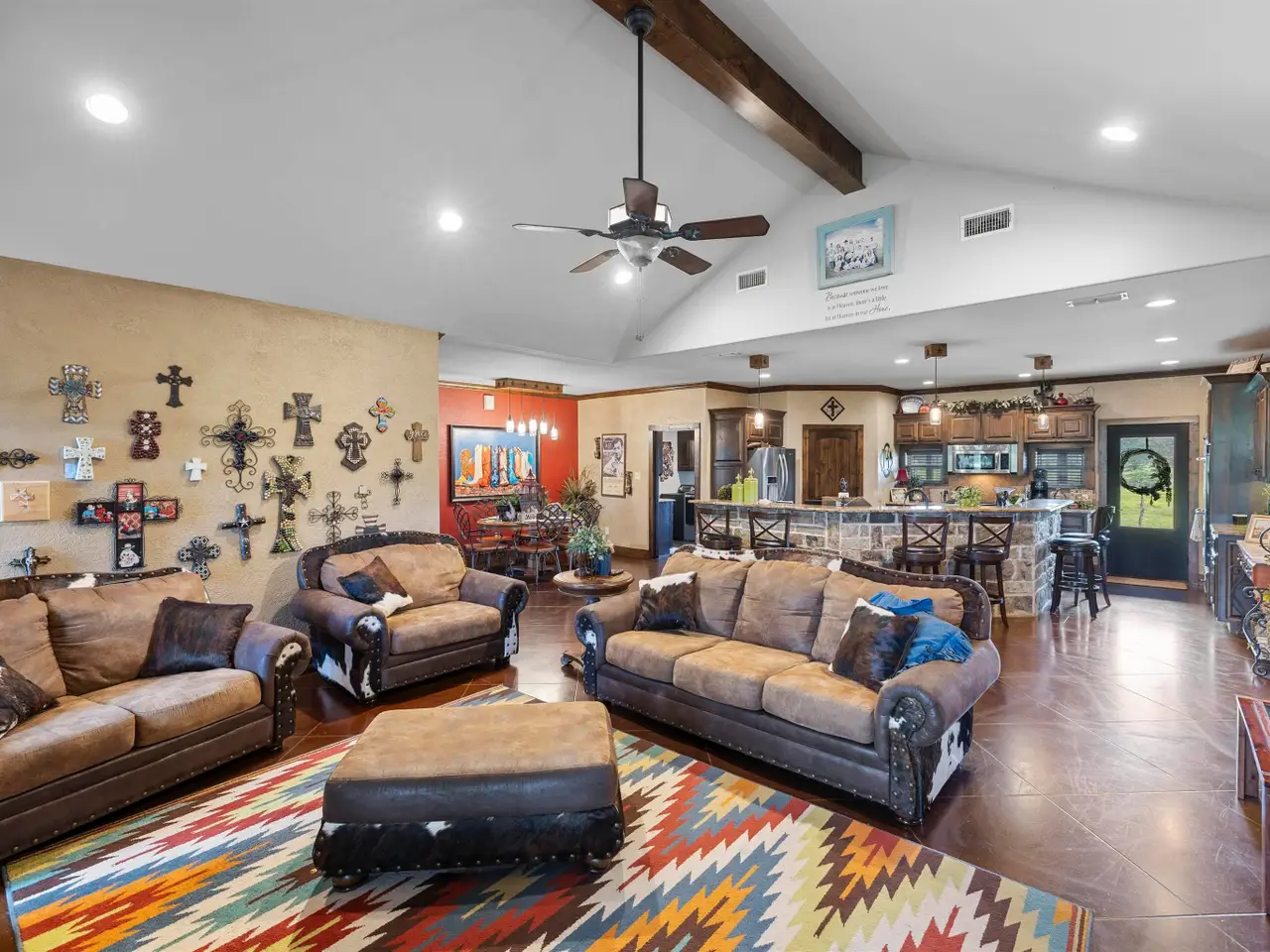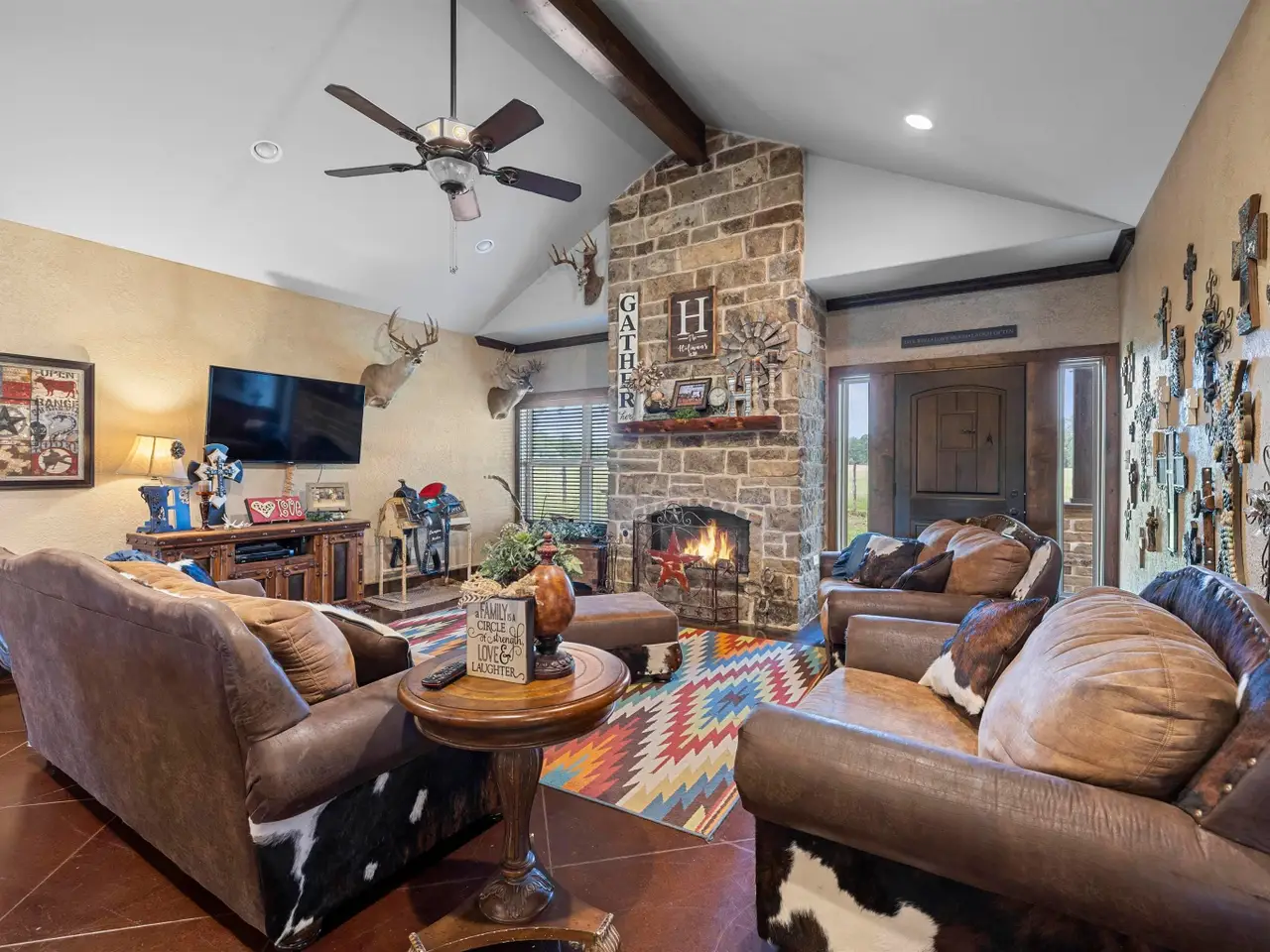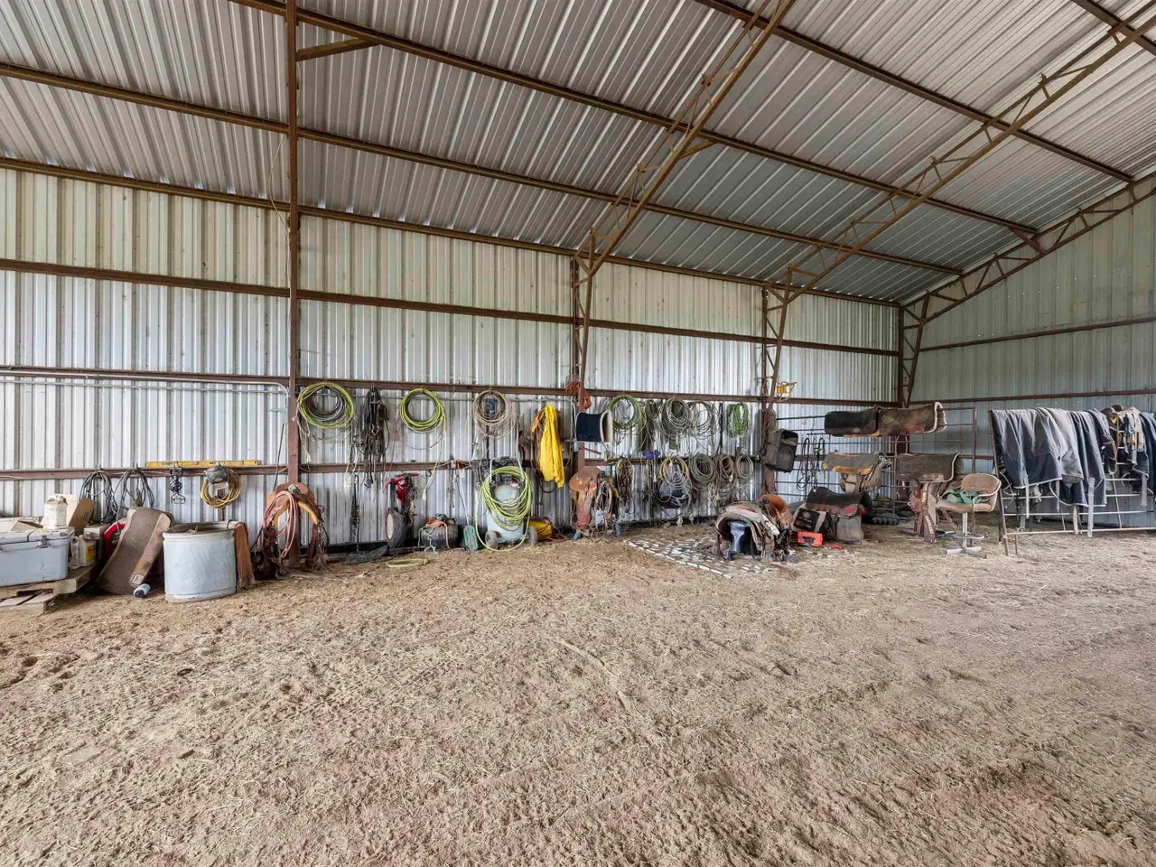 Nestled on an expansive 81.77 acres, this stunning custom ranch-style home features an inviting open concept layout with a split bedroom arrangement offering the perfect blend of elegance and rustic charm with 3 spacious bedrooms, 2 bathrooms, a dining room and an office. You'll find beautiful stone accents throughout including a cozy wood-burning and gas fireplace that serves as a focal point in the living area. Stained concrete floors flow seamlessly throughout providing a modern yet warm feel. The spacious kitchen is equipped with stainless steel appliances, including an icemaker, double ovens, and a convenient coffee bar. The mudroom and dedicated laundry area offer a convenient entry point from just behind the kitchen, providing an ideal space for transitioning from outdoors. The master suite includes 2 separate walk-in closets and a generous sized bathroom space with an oversized shower. The second and third bedrooms are joined with a jack-in-jill bath including separate vanities for better functionality. Outside, the vast acreage is a true paradise, featuring 3 stocked ponds that invite relaxation and recreation. The landscape features improved pasture with high quality grasses including 4 separate grazing pastures with cross fencing and small traps with cover. A small creek gracefully runs through the landscape, adding to its natural beauty and providing additional water for the livestock. A well-equipped barn and lighted roping arena cater to equestrian enthusiasts offering 3 stalls, working pens and a wide alley. The barn also has an RV hookup for your guests and a well nearby that provides water for your animals. This place is horse and cattle ready! Located just 6.5 miles from town, this ranch-style home combines tranquility with accessibility, making it a perfect retreat for those seeking a serene lifestyle. Don't miss out on this incredible opportunity to live the ranch life you've always dreamed of!