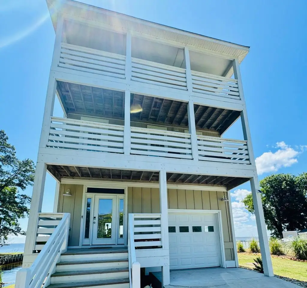 Beautiful coastal waterfront home with views of the Albemarle Sound, North River and ICW! Enjoy Phenomenal sunsets every day to wind down on your back deck! Completely renovated in 2022 with all-new electrical, plumbing, HVAC, kitchen, baths, lighting, flooring, appliances and paint. The first floor could be a game room with a guest en-suite/ in-law suite... with a sound front deck. The second floor has an open floor plan with living, dining, kitchen, pantry, fireplace, 1/2 bath and sound front deck. The third floor has the owner's en-suite water side, a private deck with awesome views and a large walk-in tiled shower, laundry room, two bedrooms and hall bath. Storage area under home for all your water toys. Fish, swim, boat... right from your back yard. Minutes from the Outer Banks, just across the bridge. Straight commute to VA... all at your convenience, but you'll never want to leave this amazing waterfront home!