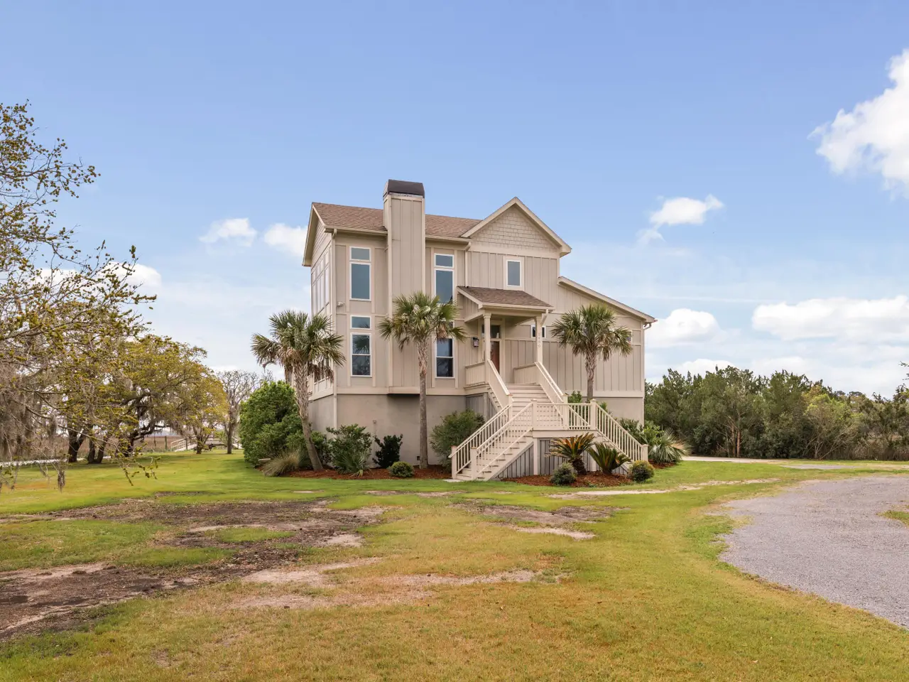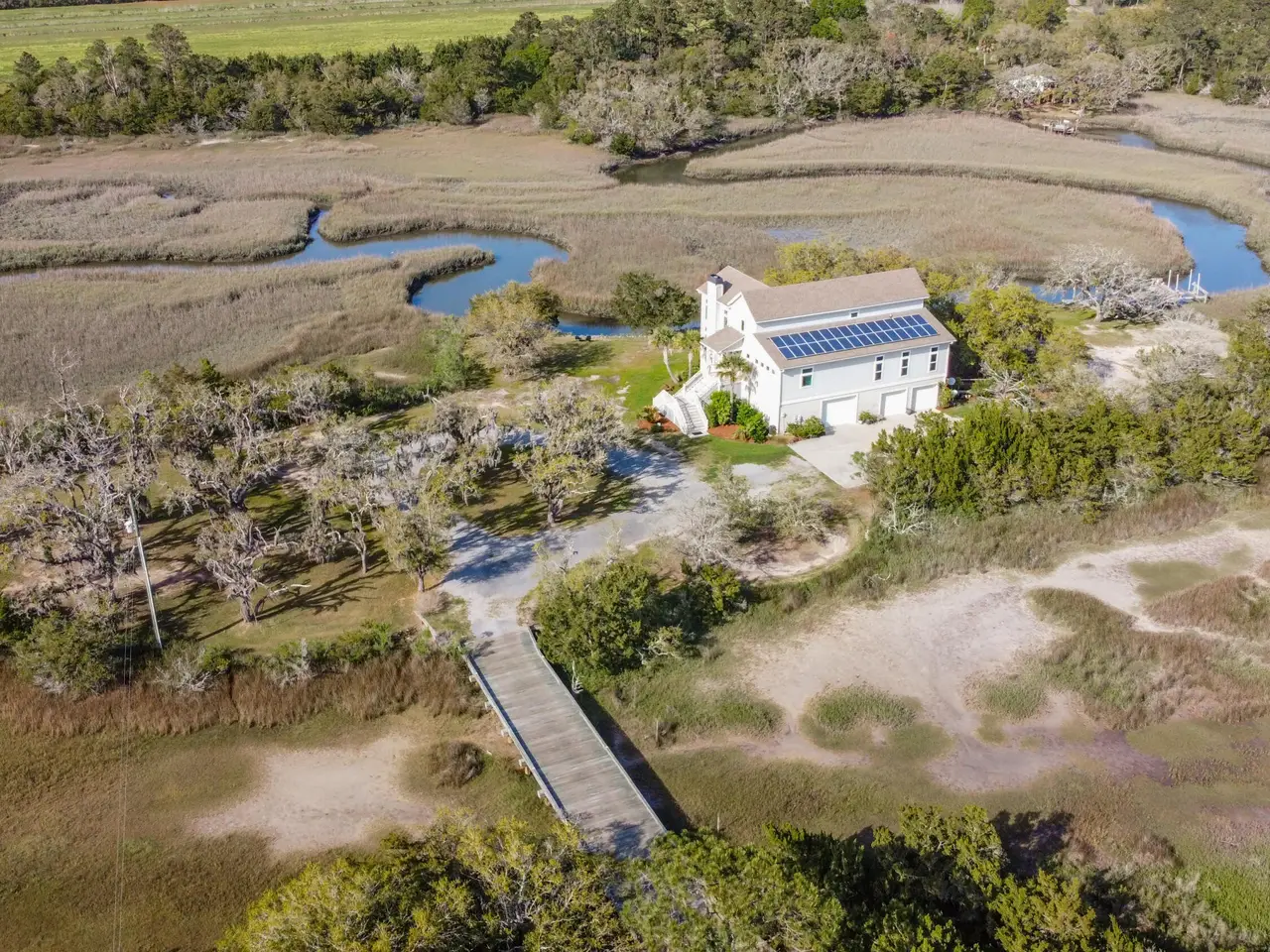 A rare chance to own a private island retreat in Charleston's breathtaking Lowcountry! This custom-built Lowcountry estate, completed in 2014, offers an unparalleled blend of Southern charm and modern luxury. Situated on 7.2 serene acres with panoramic 360 degree Stono River and Abbapoola Creek views, this home is a sanctuary of peace and privacy. A private drive leads you past 5 acres of planted pine timber to this secluded haven, complete with its own .4 acre tidal saltwater pond that is full of redfish, where nature and elegance intertwine effortlessly. Inside, the open-concept living area is a showstopper - cathedral ceilings with floor-to-ceiling windows that frame the ever-changing marsh landscape. The heart of the home is the kitchen, meticulously designed for both functionality and style, featuring a massive granite island with seating. Enjoy stunning views from your kitchen windows, where dolphins often glide by, a daily reminder of nature's magic. The owner's suite is a retreat of its own, with a spa-like en suite bath with a soaking tub, and two spacious walk-in closets. Two additional bedrooms are upstairs, each with ensuite baths, that provide ample space for family and visitors. Feel the salt-kissed air and listen to the gentle rustle of the marsh grasses as you unwind on the screened in porch. The deep-water dock is equipped with electricity, water, and a 13,000 pound boat lift - ideal for launching kayaks, paddleboards, or heading out for a day on the water. The oversized three-car garage offers abundant storage for vehicles, golf carts, boats, and all your Lowcountry lifestyle essentials. This property is thoughtfully designed for durability and peace of mind, featuring elevated construction for enhanced flood protection, storm-resistant materials, and a granite revetment to help mitigate shoreline erosion. Additional premium upgrades include a fully owned solar panel system, offering significant energy savings while promoting sustainability. A robust 20-ton-per-axle bridge ensures secure access for all vehicle types, including emergency services and heavy-duty equipment - ideal for future improvements such as a pool installation. Located just 15 minutes from Freshfields Village shopping and dining, and a short drive to the pristine beaches of Kiawah Island, this one-of-a-kind property offers the perfect balance of seclusion and convenience. This is Lowcountry living at its finest - a rare blend of natural wonder, refined living, and endless adventure.