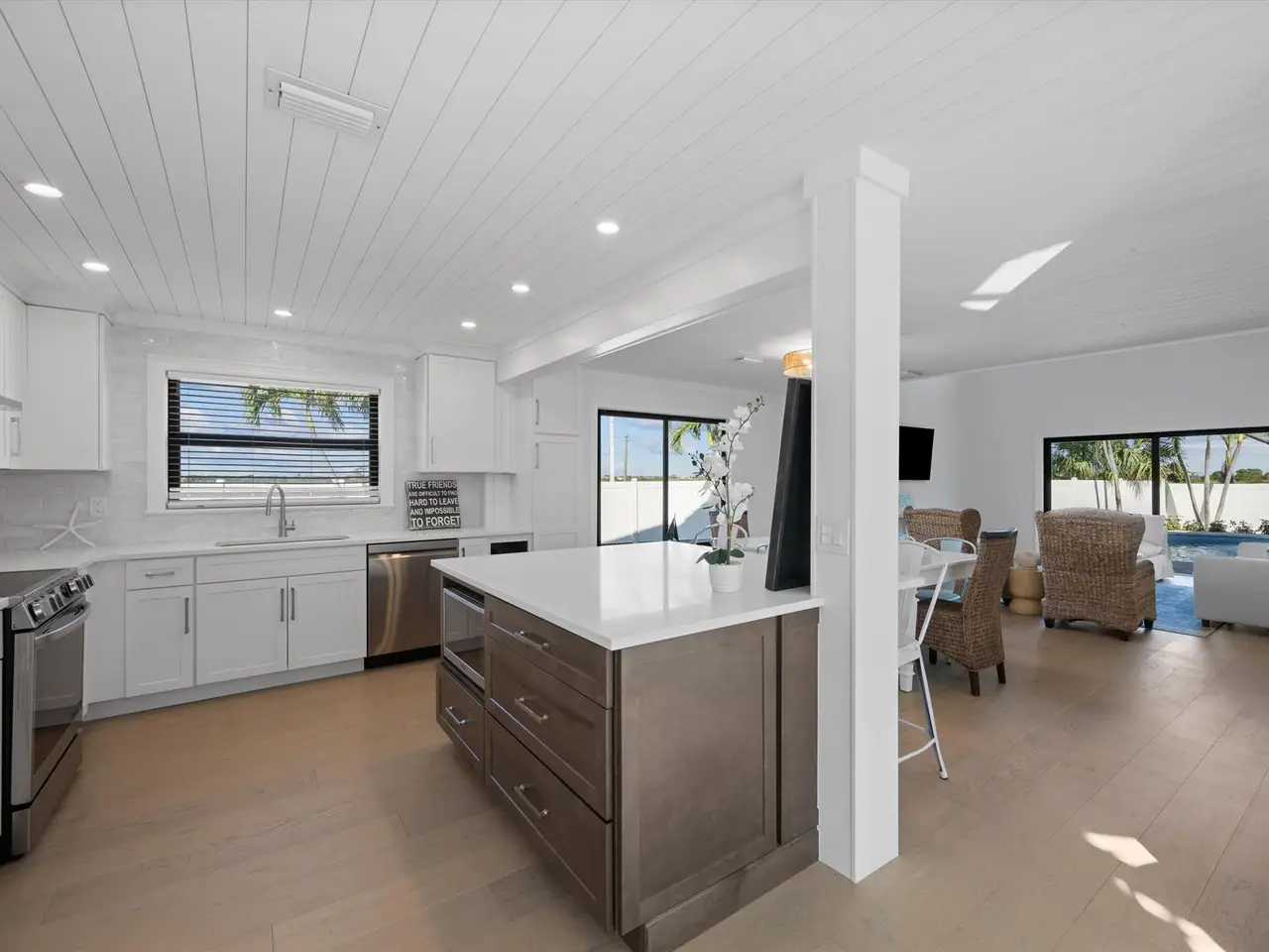 Just moments from the sand in the coveted coastal enclave of Juno Beach, this beautifully reimagined 4-bedroom, 3.5-bath residence combines modern sophistication with relaxed beachside living. Set on a high-elevation lot approximately 35' above sea level, the property showcases lush, manicured landscaping, expansive outdoor living spaces, and a sparkling heated pool ideal for year-round enjoyment.The heart of the home is a stunning newly designed modern kitchen, highlighted by an oversized quartz island, custom cabinetry, and premium appliance package. The open layout unfolds into a bright and airy great room and dining area, framed by large sliders that open to the private backyard oasis -- great for effortless entertaining. SEE MORE