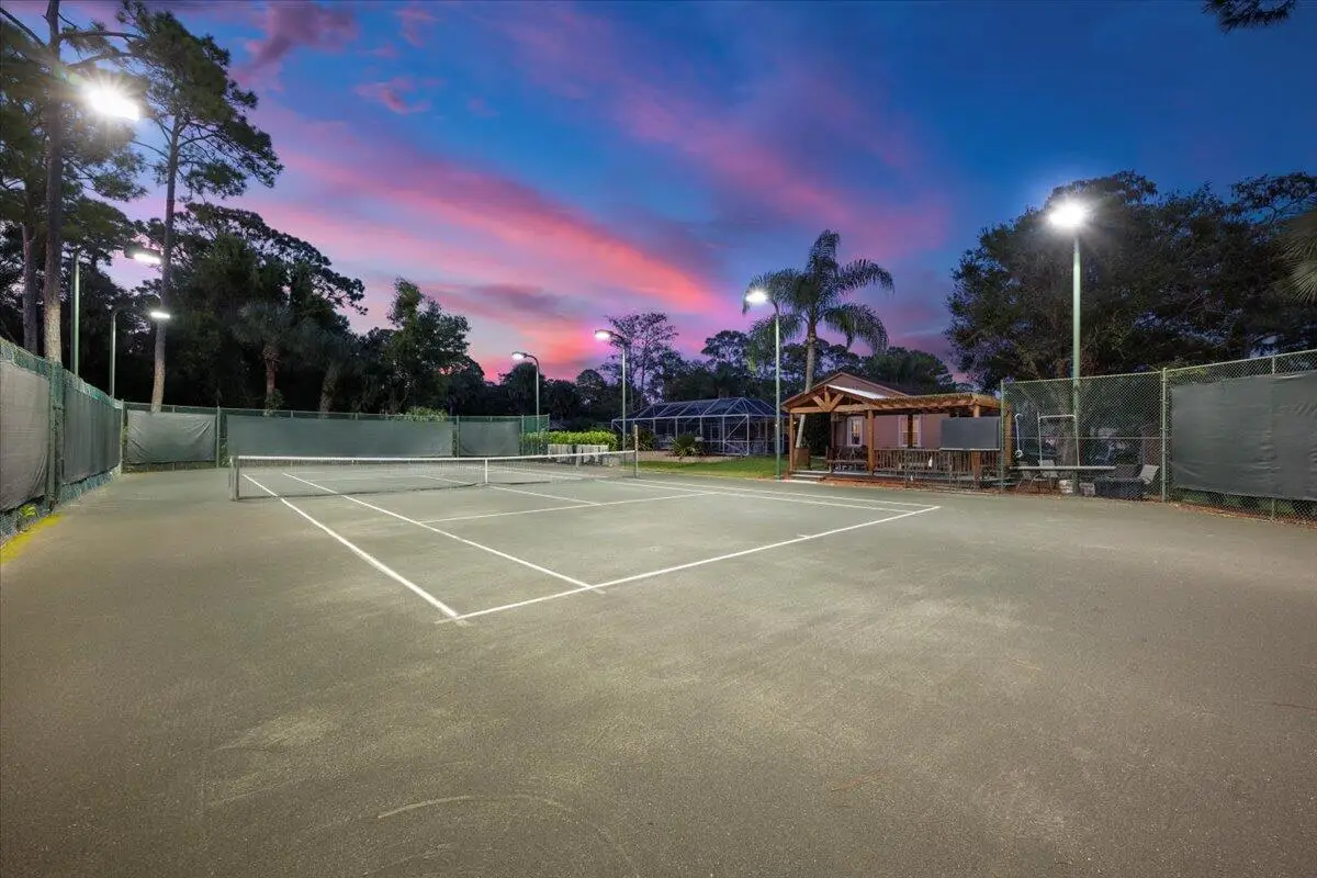 Private Tennis Court! Is tennis your dream? Then this is your dream come true--the ball is in your court! Set at the end of a quiet, paved cul-de-sac is a beautifully landscaped 1.04 acre lot with landscape lighting and a cobblestone driveway. This distinctive 3-bedroom plus den, 3-bath residence is a private paradise for tennis lovers and outdoor enthusiasts. Play every day on your private, regulation-size, Har-Tru (clay) tennis court with eight professional 1,000-watt metal-halide lights (newer ballasts and bulbs) for evening matches and a 10-foot fence on 3 sides for optimal play. An automatic above-ground sprinkler, fed by well water, keeps the court in peak condition. Between sets, relax in the stunning 10' x 20' cedar gazebo with Trex flooring, ceiling fan, power, lighting