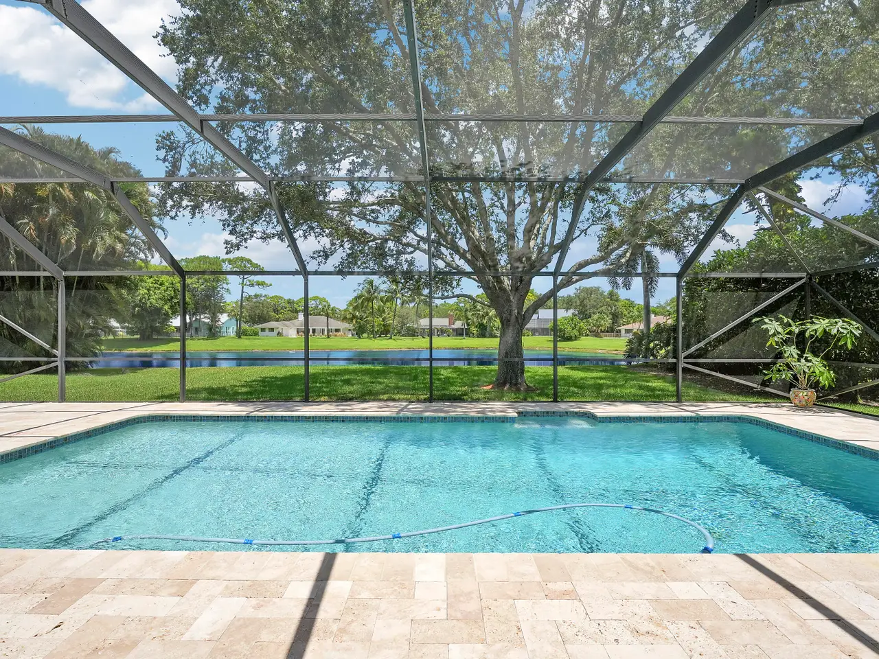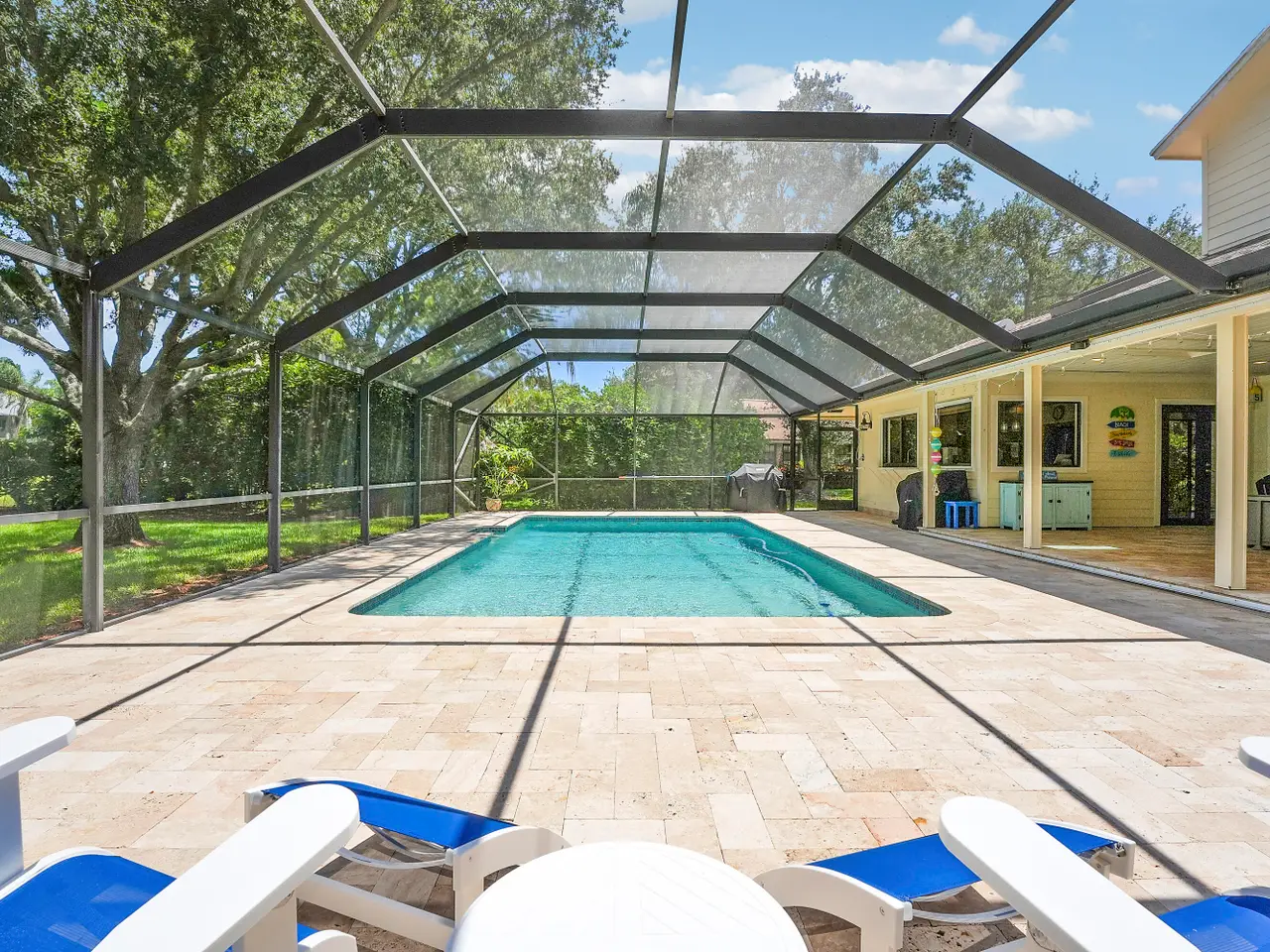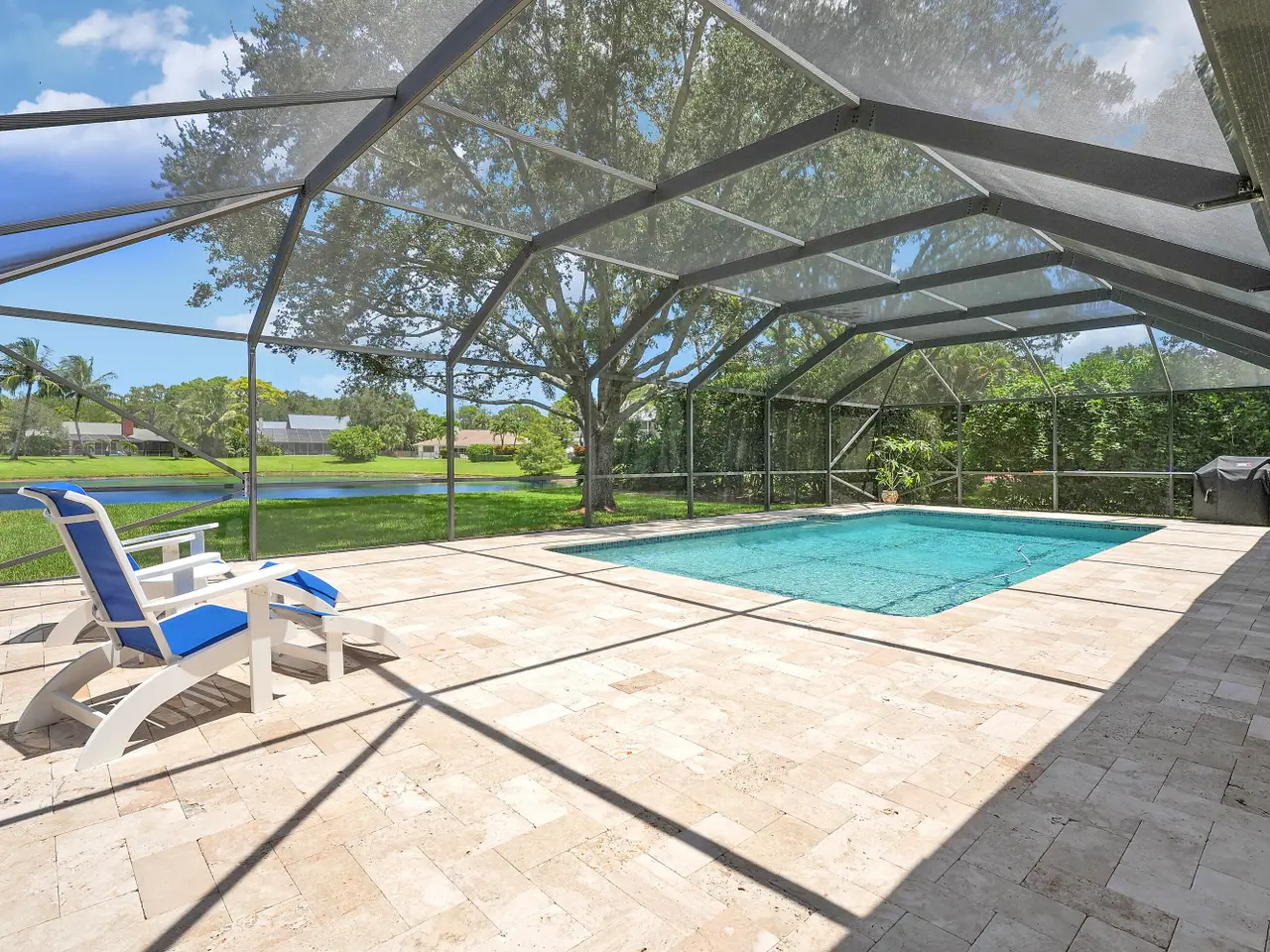 - Screened-in pool with glass tile accents