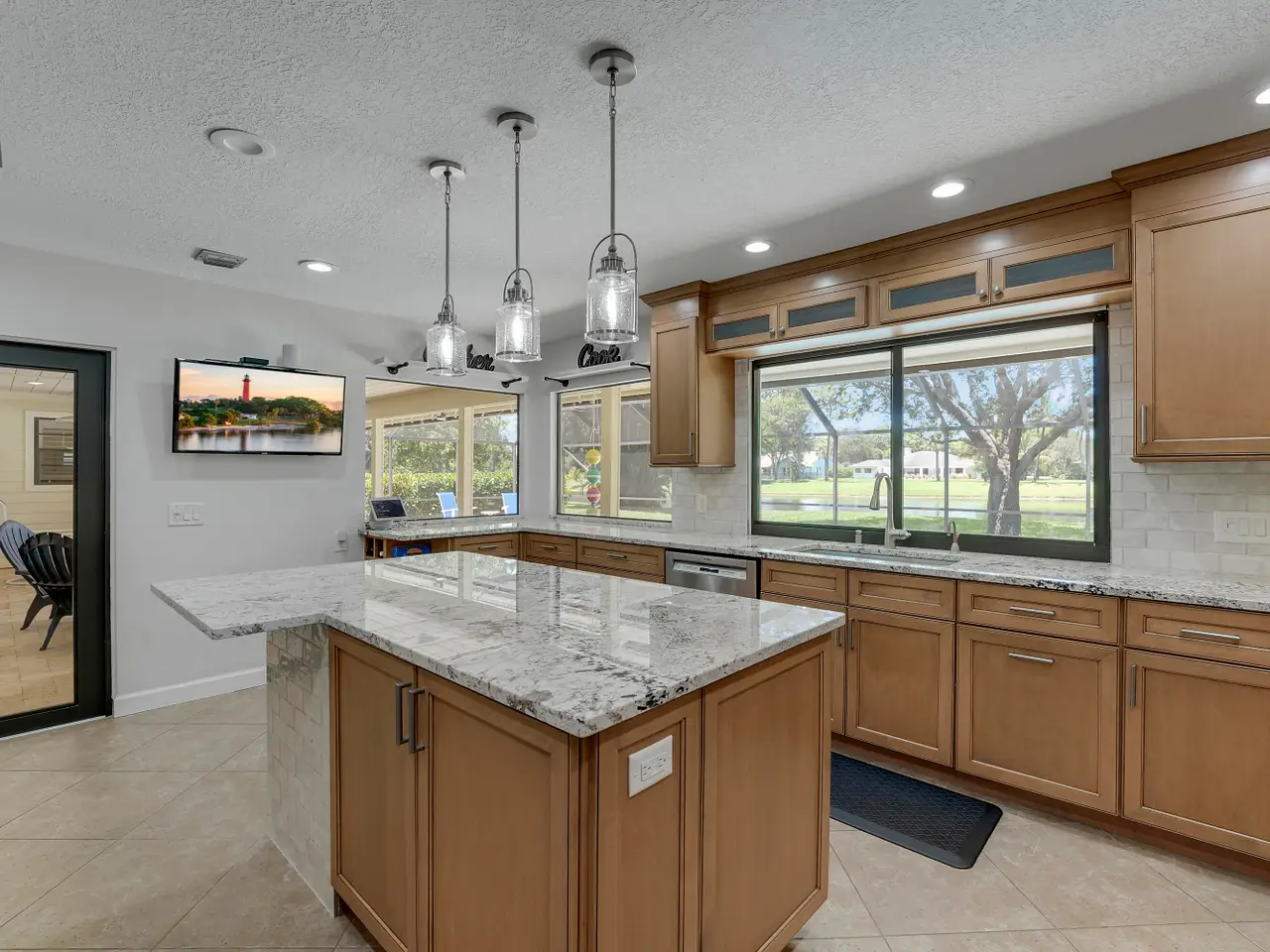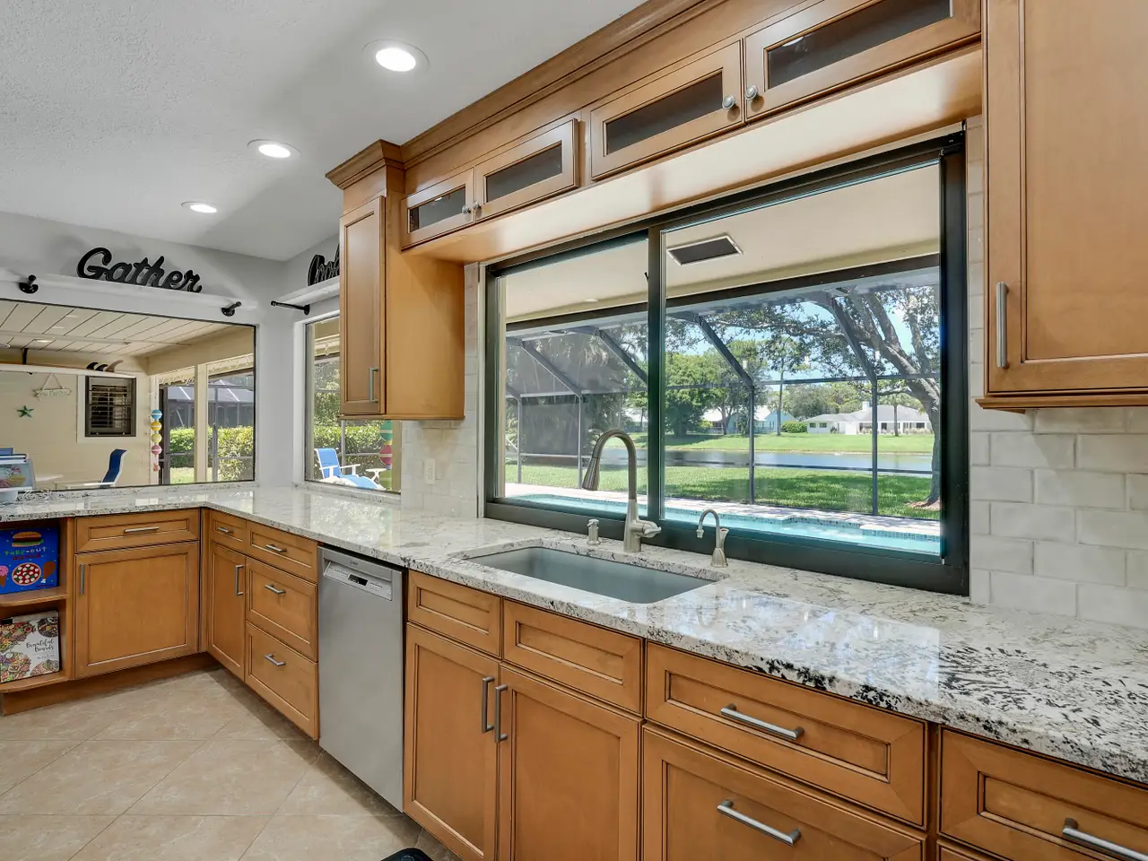 Lakefront Living in the Heart of Jupiter. Welcome to this well appointed 4 bedroom, 2-bath home (4th bedroom is a versatile loft), offering nearly 2,500 square feet of open-concept living on a half-acre lakefront lot. Soaring ceilings and abundant natural light create an airy, inviting atmosphere throughout. The spacious kitchen is a chef's dream, featuring a large island with granite countertops, newer stainless-steel appliances including a double wall oven -- perfect for entertaining. The split-bedroom floor plan ensures privacy, with generously sized rooms and thoughtful design. Step outside to your private oasis: a screened-in pool with glass tile accents, a new saltwater system, and light pavers that surrounds the pool and extends into the covered patio with custom wood paneled ceiling