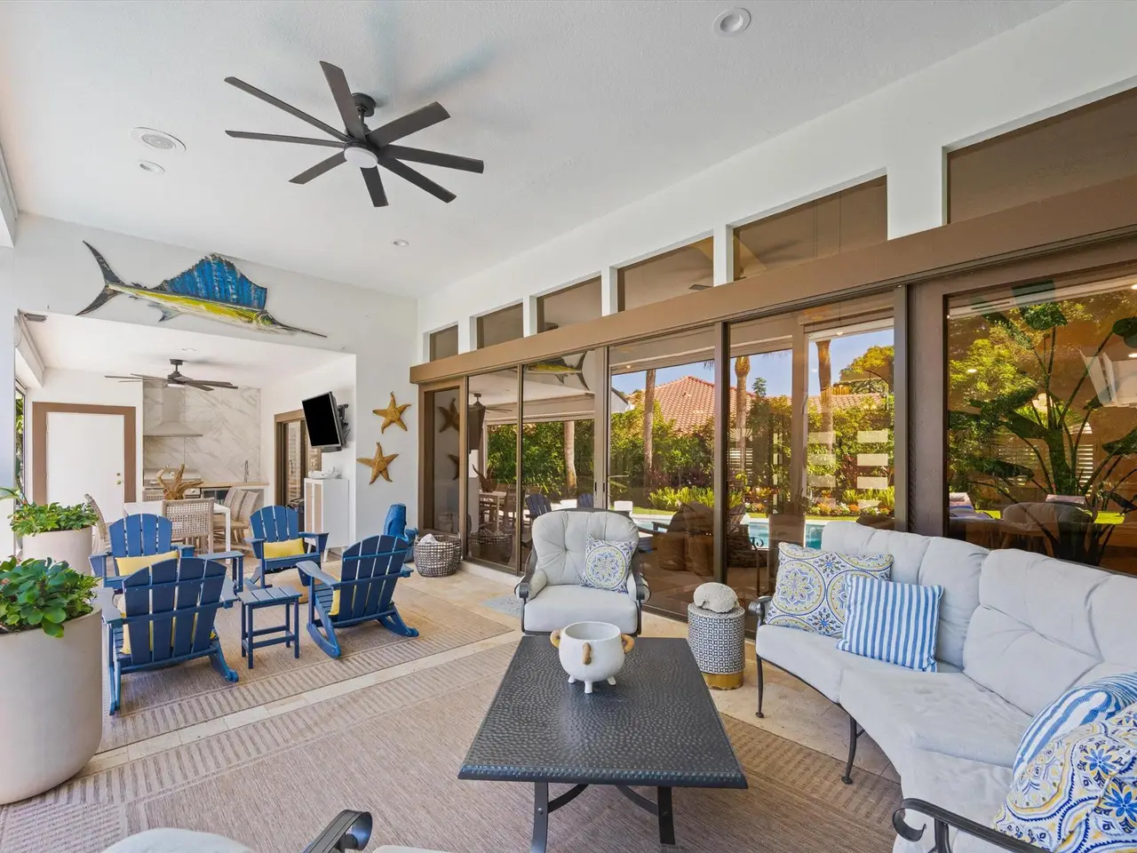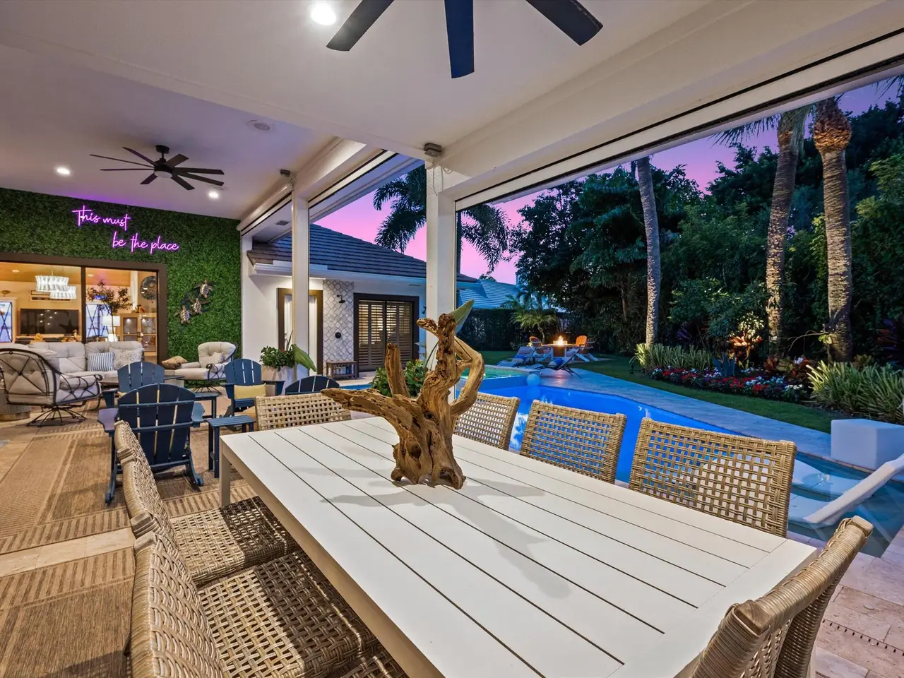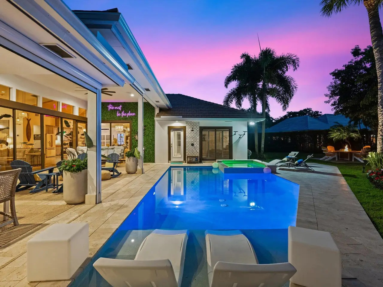 Resort-style living in Heritage Oaks.Located behind the 24-hour manned gates of one of Jupiter's most picturesque neighborhoods, this completely renovated single-story home blends elegant design with relaxed coastal living. Just minutes from the beach and across from the river, the residence features a new double front door, all-new designer lighting, plantation shutters, custom closets, and wide-plank flooring.The kitchen shines with a full-height vent hood, new hardware, and added island outlets. Expansive glass doors retract into the wall, opening to a private , fenced backyard with travertine pool deck, heated pool & spa, upgraded outdoor kitchen, and covered lanai with remote screens. With new landscaping, lighting irrigation, and a tiled roof, this home delivers turnkey luxury.