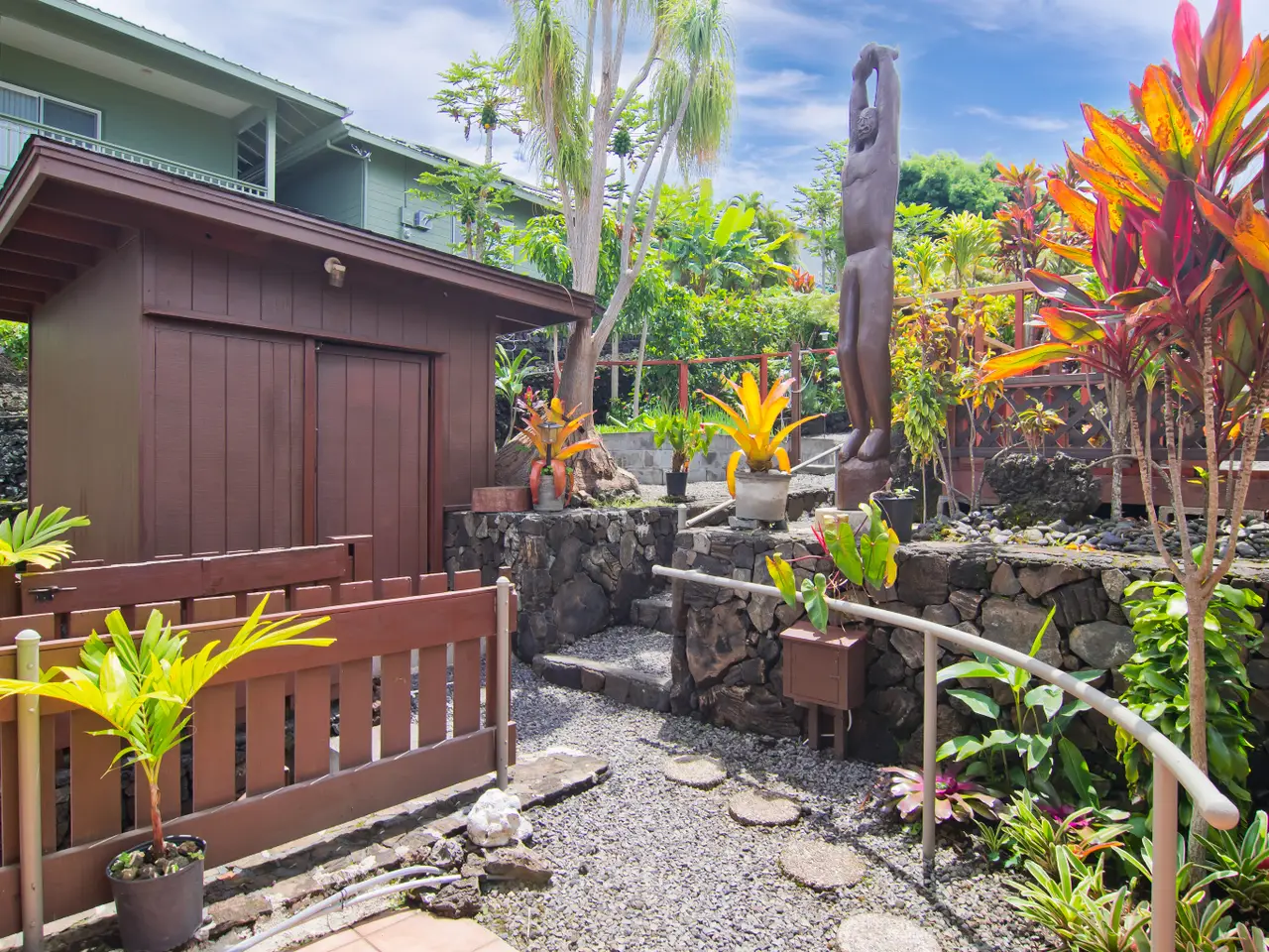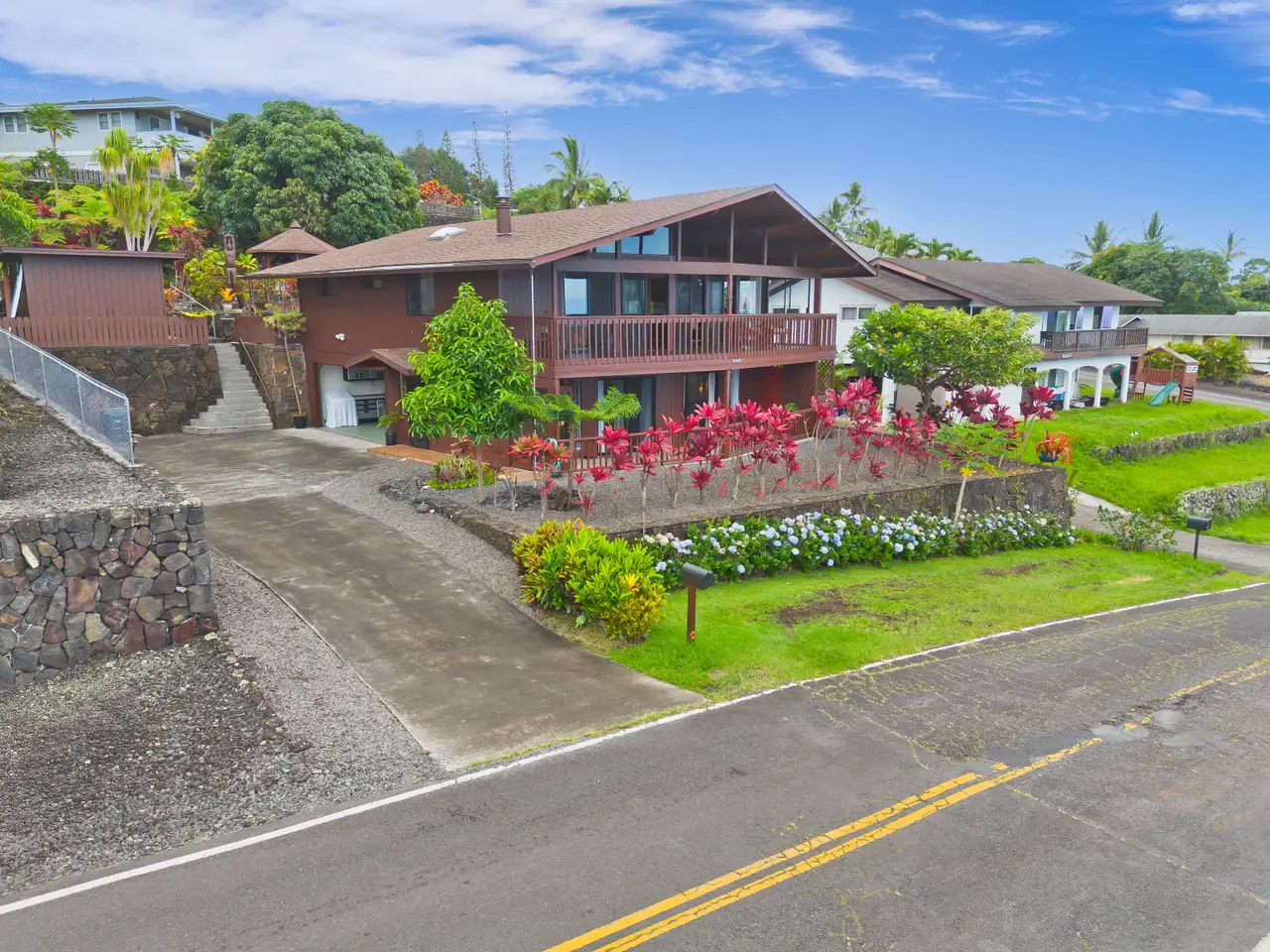 Welcome to 73-4327 Oneone Street—an exceptional property offering panoramic ocean views, vibrant gardens, and versatile living spaces in one of North Kona’s most established neighborhoods. The main level features 2 bedrooms and 1 bath, with vaulted tongue-and-groove ceilings, rich parquet flooring, and a cozy fireplace for those cool winter evenings. Step out onto the expansive lanai to enjoy ocean views & breezes and year-round sunsets. The ground level features a spacious open room, kitchenette, full bath and a covered lanai with its own ocean view. Currently an active rental, this space offers excellent income potential, multigenerational flexibility, or the perfect work-from-home setup. Outdoors, the beautifully landscaped grounds include terraced gardens, wide level walkways, and an abundance of tropical flora. Garden enthusiasts will appreciate the raised veggie bed and variety of edibles—papaya, mango, cacao, coffee, pineapple, and herbs—alongside ornamental and exotic flowers that will inspire the creative florist. A covered gazebo, outdoor kitchen, large tool shed, and separate entrance to the primary bedroom complete the backyard sanctuary. The garage includes the laundry facilities, built-in cabinetry, and a generously sized storage room. Conveniently located in desirable Kona Palisades, just minutes away from: * Kona International Airport * Costco * Honokohau Harbor * Kona’s Gold Coast beaches * Kailua Village * World-class resorts and golf courses Whether you're looking for a full-time residence, part-time retreat, or investment property, this home offers an ideal blend of lifestyle, location, and potential. Some areas may benefit from upgrades, but the setting and layout are full of promise.