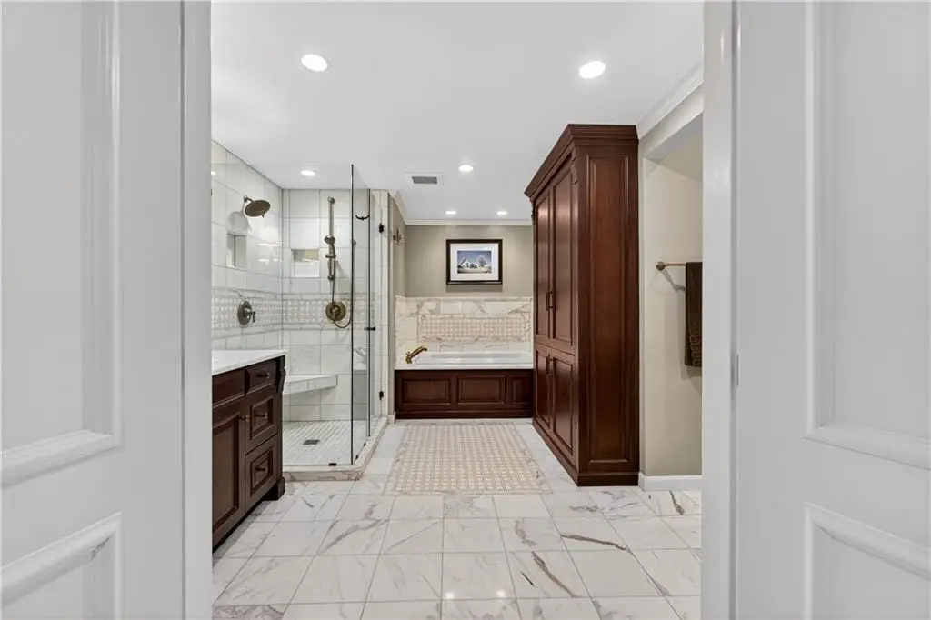 Beautifully renovated traditional home on large, newly landscaped lot. This stunning property features an inviting center hall floor plan with an amazing new fireplace in the great room and fresh interior & exterior paint throughout. The white, light-filled kitchen is a chef’s dream with all new stainless steel appliances, including double ovens, sleek quartz countertops, and a seamless flow into the family room and brand-new screened-in porch. Upstairs, the primary suite is a luxurious retreat with all new Calacutta gold marble in the bath, separate custom vanities, a large soaker tub, spa-like shower, and generous walk-in closet. Spacious secondary bedrooms and updated baths complete the upper level. Bonus flex space between bedroom 3 & 4 for playroom or additional sleeping quarters. The newly finished lower level offers more living space with a cozy family room featuring stunning moldings, a wet bar, and an updated 1/2 bath, ideal for game nights and watch parties. Recent upgrades to the exterior include a resurfaced circle drive, new deck, new garage doors, fresh landscaping, new sprinkler system, and a new French drain. Bonus - updated electrical and plumbing, and whole-house generator for peace of mind. This home is truly move-in ready with thoughtful updates at every turn, perfect for entertaining and everyday living!