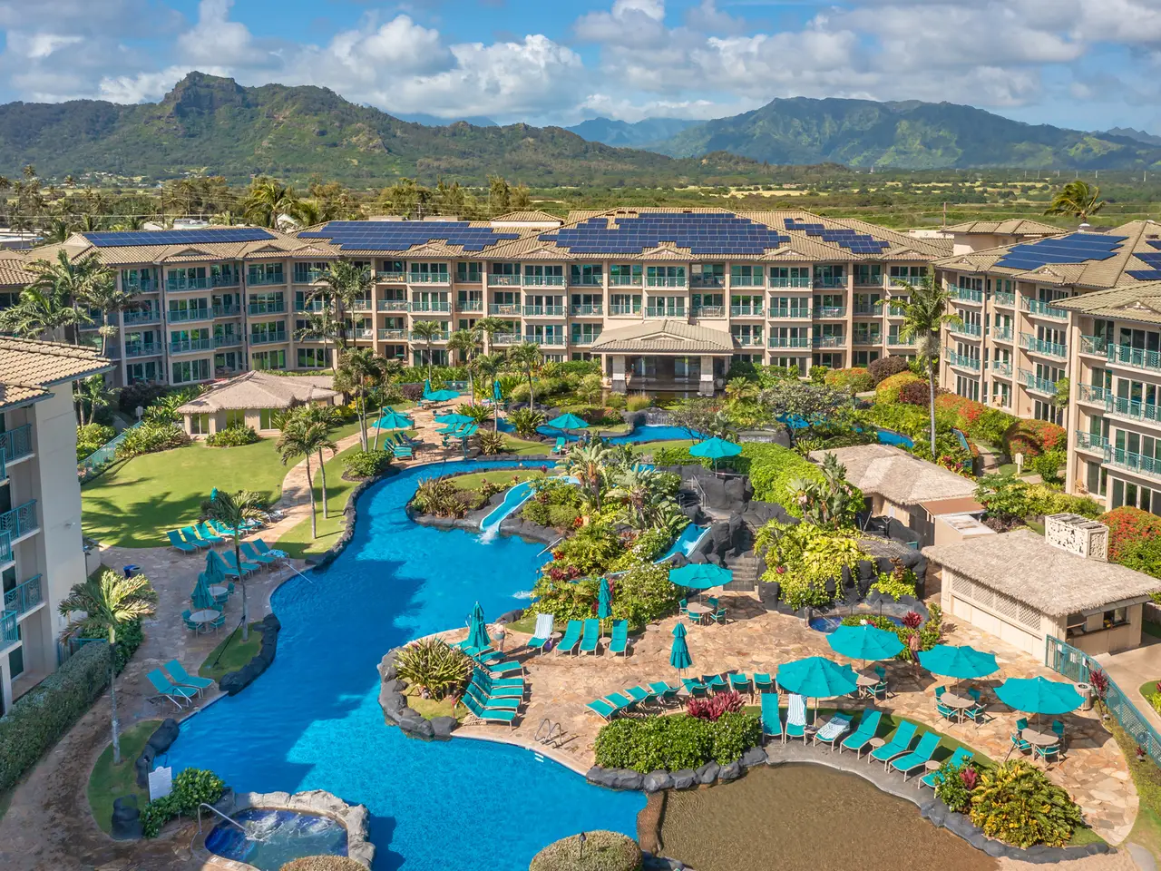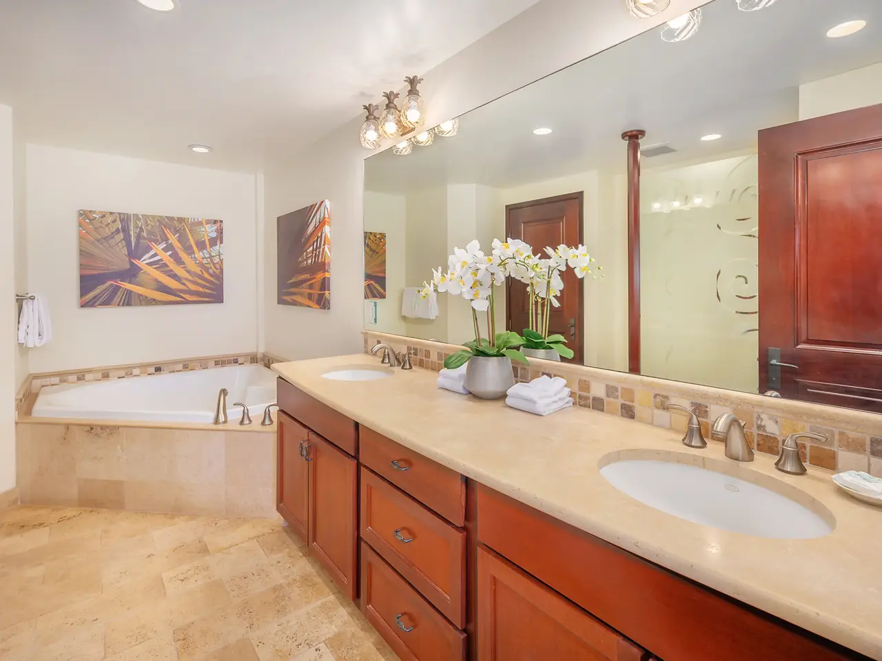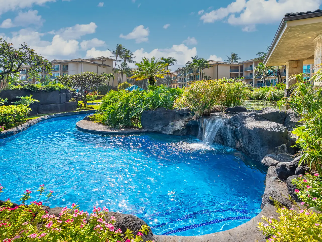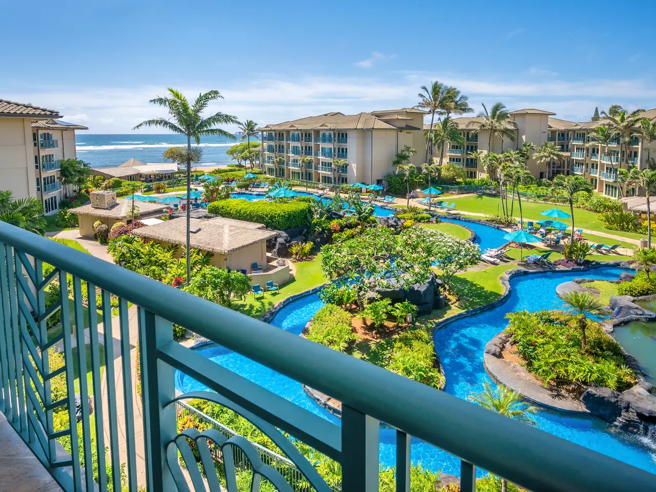Beautiful two bedroom, three bathroom, pool and ocean view penthouse unit at the Waipouli Beach Resort. This top floor unit is one of twelve two bed/three bath penthouse units with an interior facing view of the lazy river pool to enjoy beautiful water views by day, as well as a romantic view of the lit pool and grounds by night. This 1,158 square foot unit features a chef’s kitchen with top-of-the-line appliances including a Sub-Zero refrigerator, Wolf glass cook top, oven, dishwasher, granite counter tops, African Mahogany cabinets, and Peruvian travertine stone floors. Enjoy the comfort of central air conditioning, a large living/dining area with a flat-panel screen television, recessed accent lighting, a pull-out queen sofa, a comfortable lanai space for your morning coffee and outdoor dining, a full-size stacked washer and dryer, and the convenience of being a short distance from the elevator. The primary suite offers a king bed, a mounted flat-panel screen television, and an ensuite featuring double sinks, a soaking tub with folding shutters for a pass through view of the pool, and a separate shower. The guest suite offers a queen bed, a mounted flat-panel screen television, and an ensuite with double sinks, and a soaking tub. The third guest bathroom features a shower. Waipouli Beach Resort is a luxury oceanfront resort on the Coconut Coast of Kauai, featuring a two-acre pool with lazy river, 2-water slides, waterfalls, and a sandy bottom hot tub. Enjoy the morning sunrise, walks on the beach, the beautifully landscaped grounds, an onsite concierge, a fitness center, and Oasis on the Beach for oceanfront dining. Area conveniences includes Starbucks and Safeway across the street, and within close proximity to many great shops, dining, and activities. Enjoy as your primary or secondary residence, or as an active Vacation Rental.