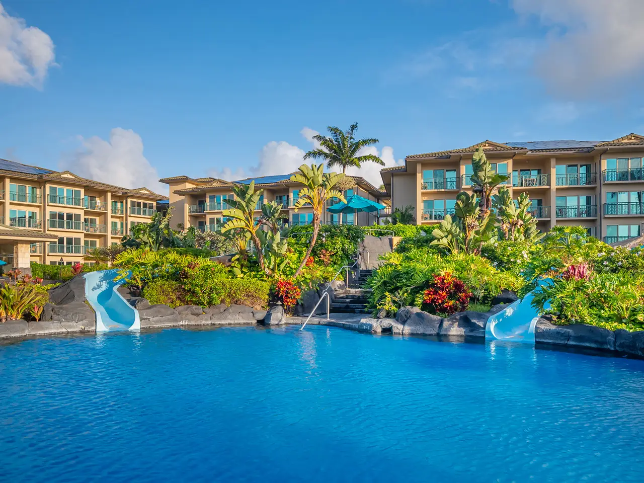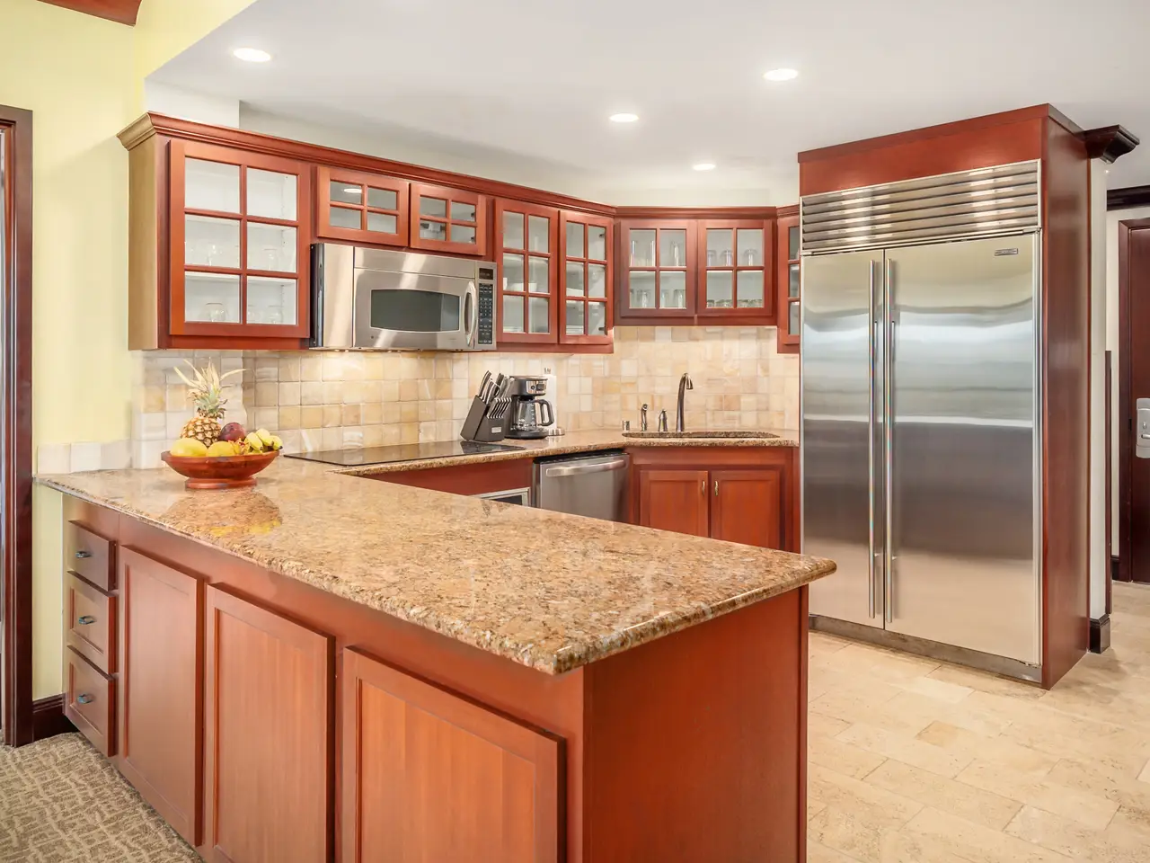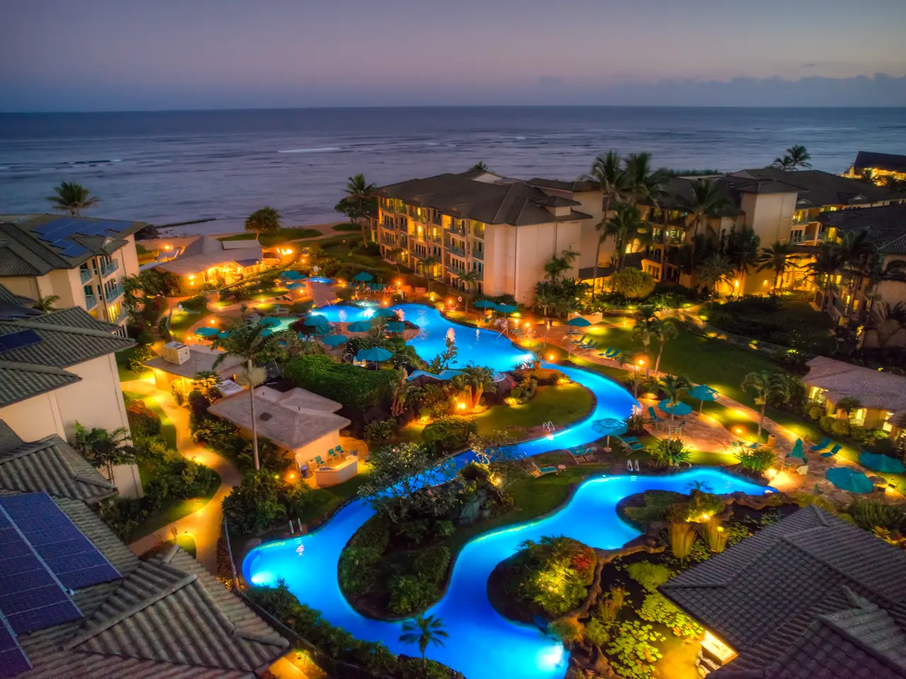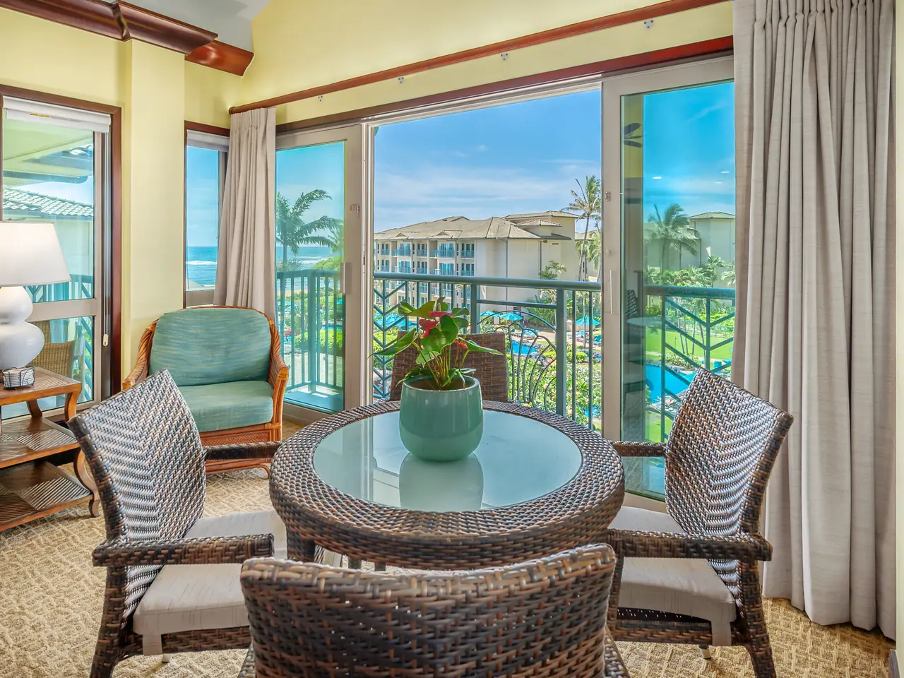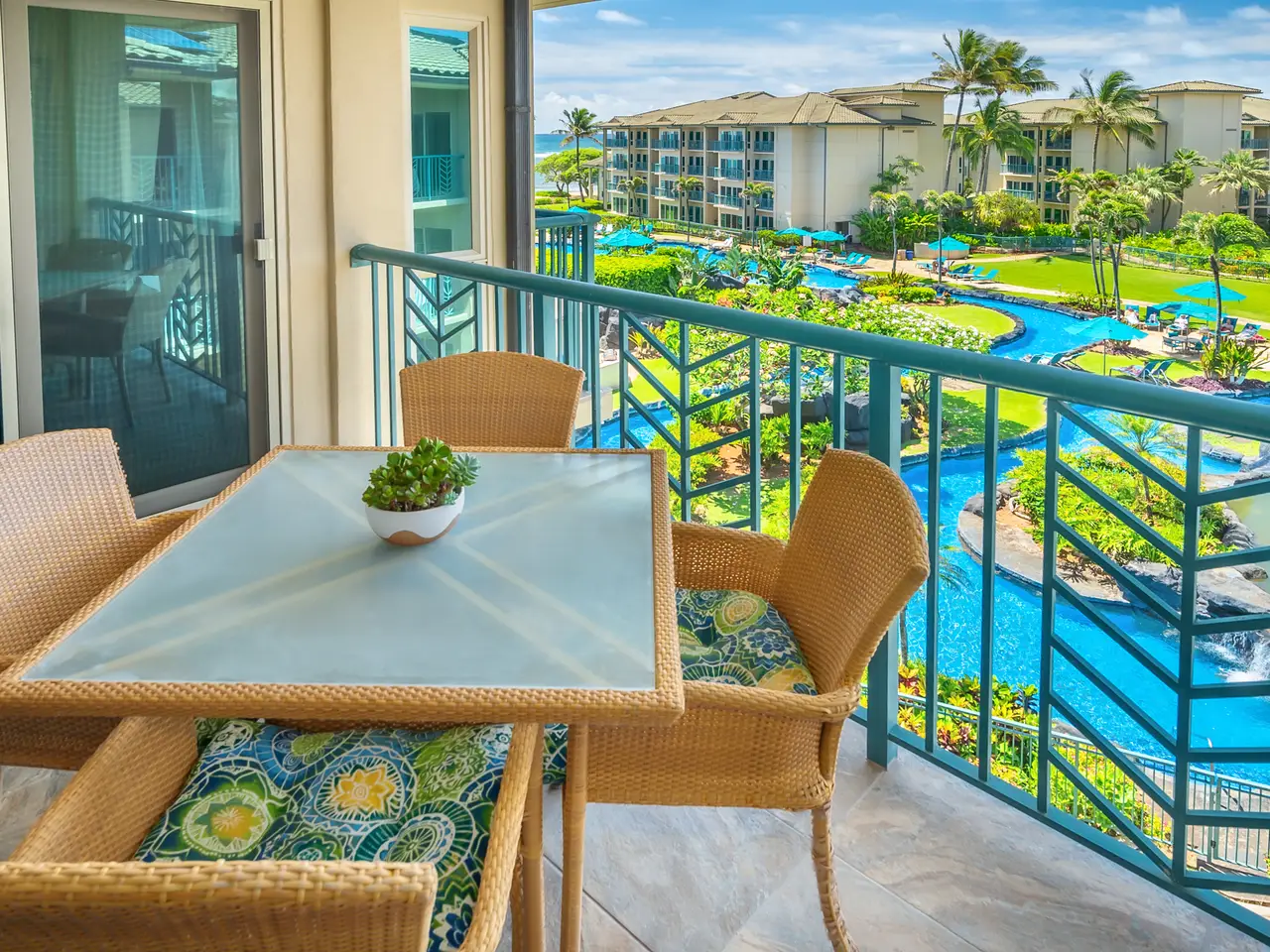 Beautiful two bedroom, three bathroom, pool and ocean view penthouse unit at the Waipouli Beach Resort. This top floor unit is one of twelve two bed/three bath penthouse units with an interior facing view of the lazy river pool to enjoy beautiful water views by day, as well as a romantic view of the lit pool and grounds by night. This 1,158 square foot unit features a chef’s kitchen with top-of-the-line appliances including a Sub-Zero refrigerator, Wolf glass cook top, oven, dishwasher, granite counter tops, African Mahogany cabinets, and Peruvian travertine stone floors. Enjoy the comfort of central air conditioning, a large living/dining area with a flat-panel screen television, recessed accent lighting, a pull-out queen sofa, a comfortable lanai space for your morning coffee and outdoor dining, a full-size stacked washer and dryer, and the convenience of being a short distance from the elevator. The primary suite offers a king bed, a mounted flat-panel screen television, and an ensuite featuring double sinks, a soaking tub with folding shutters for a pass through view of the pool, and a separate shower. The guest suite offers a queen bed, a mounted flat-panel screen television, and an ensuite with double sinks, and a soaking tub. The third guest bathroom features a shower. Waipouli Beach Resort is a luxury oceanfront resort on the Coconut Coast of Kauai, featuring a two-acre pool with lazy river, 2-water slides, waterfalls, and a sandy bottom hot tub. Enjoy the morning sunrise, walks on the beach, the beautifully landscaped grounds, an onsite concierge, a fitness center, and Oasis on the Beach for oceanfront dining. Area conveniences includes Starbucks and Safeway across the street, and within close proximity to many great shops, dining, and activities. Enjoy as your primary or secondary residence, or as an active Vacation Rental.