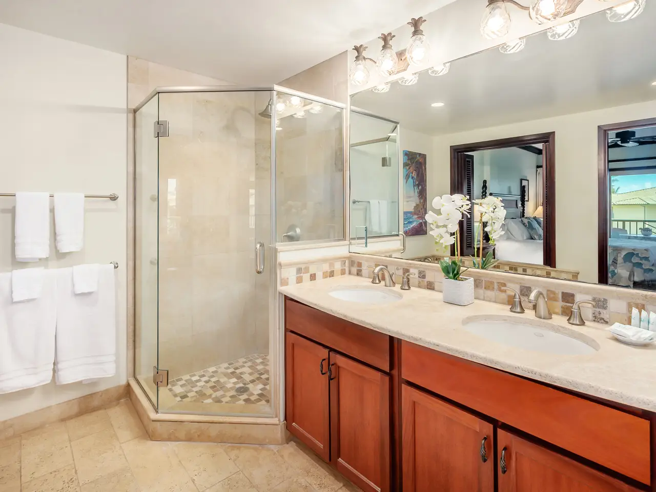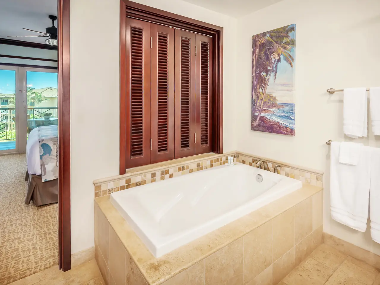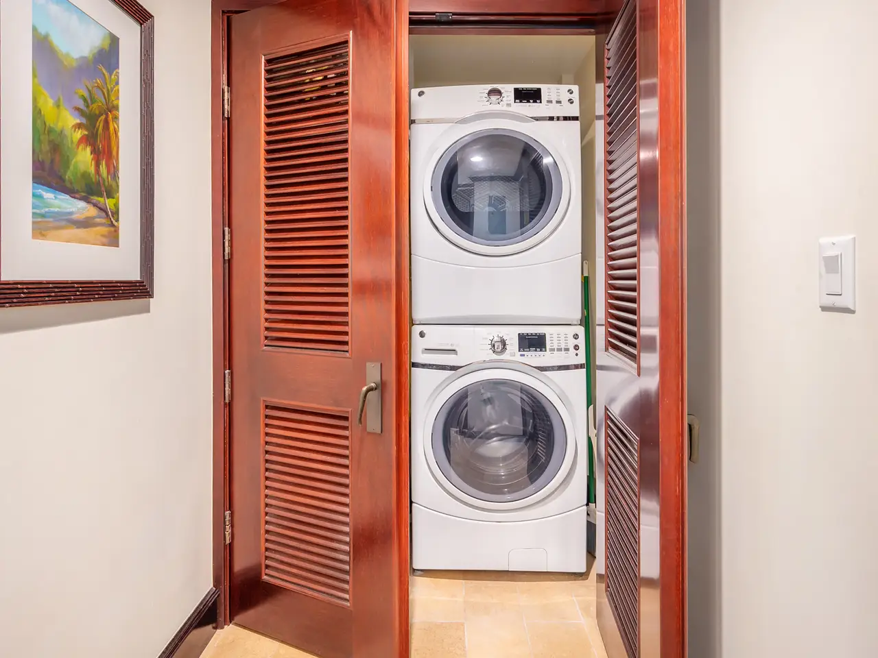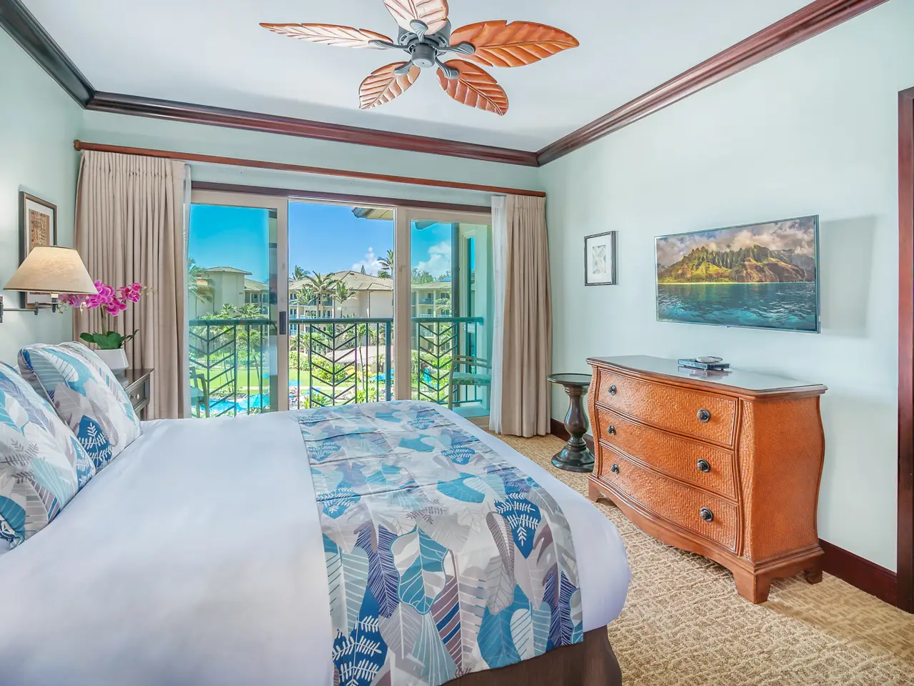 Beautiful two bedroom, three bathroom, pool and ocean view penthouse unit at the Waipouli Beach Resort. This top floor unit is one of twelve two bed/three bath penthouse units with an interior facing view of the lazy river pool to enjoy beautiful water views by day, as well as a romantic view of the lit pool and grounds by night. This 1,158 square foot unit features a chef’s kitchen with top-of-the-line appliances including a Sub-Zero refrigerator, Wolf glass cook top, oven, dishwasher, granite counter tops, African Mahogany cabinets, and Peruvian travertine stone floors. Enjoy the comfort of central air conditioning, a large living/dining area with a flat-panel screen television, recessed accent lighting, a pull-out queen sofa, a comfortable lanai space for your morning coffee and outdoor dining, a full-size stacked washer and dryer, and the convenience of being a short distance from the elevator. The primary suite offers a king bed, a mounted flat-panel screen television, and an ensuite featuring double sinks, a soaking tub with folding shutters for a pass through view of the pool, and a separate shower. The guest suite offers a queen bed, a mounted flat-panel screen television, and an ensuite with double sinks, and a soaking tub. The third guest bathroom features a shower. Waipouli Beach Resort is a luxury oceanfront resort on the Coconut Coast of Kauai, featuring a two-acre pool with lazy river, 2-water slides, waterfalls, and a sandy bottom hot tub. Enjoy the morning sunrise, walks on the beach, the beautifully landscaped grounds, an onsite concierge, a fitness center, and Oasis on the Beach for oceanfront dining. Area conveniences includes Starbucks and Safeway across the street, and within close proximity to many great shops, dining, and activities. Enjoy as your primary or secondary residence, or as an active Vacation Rental.