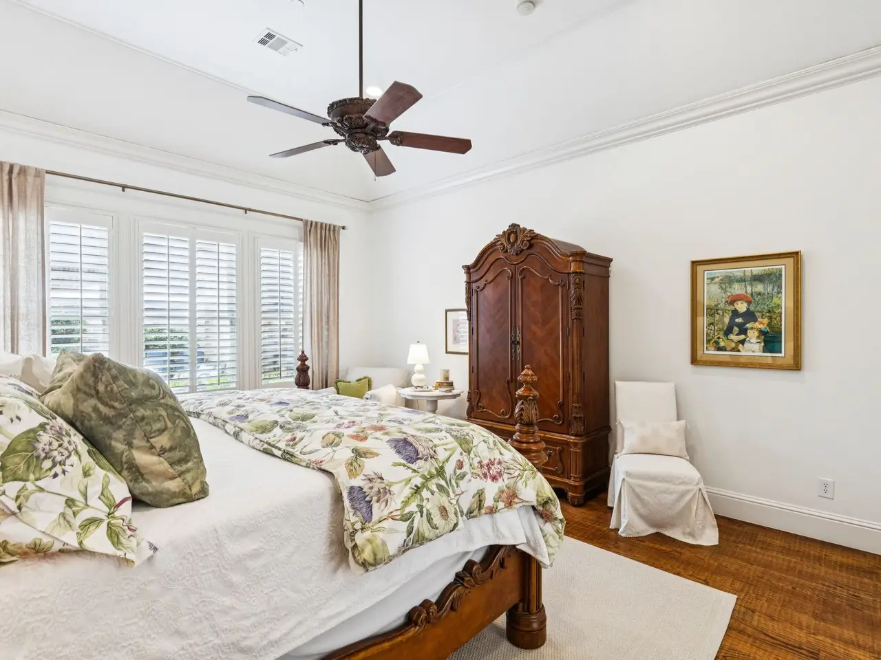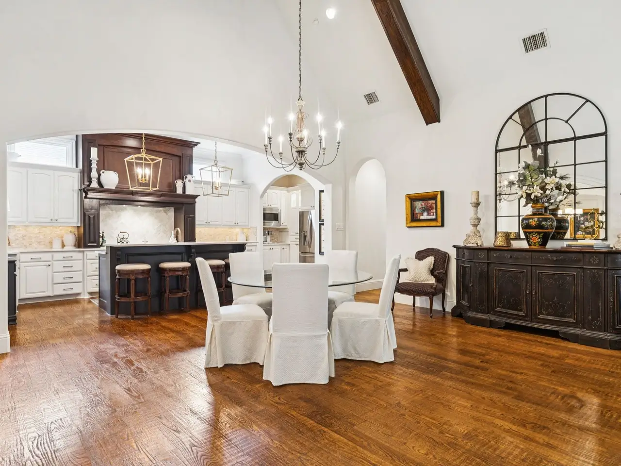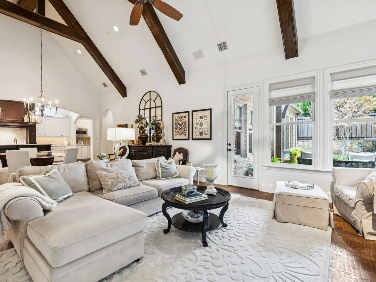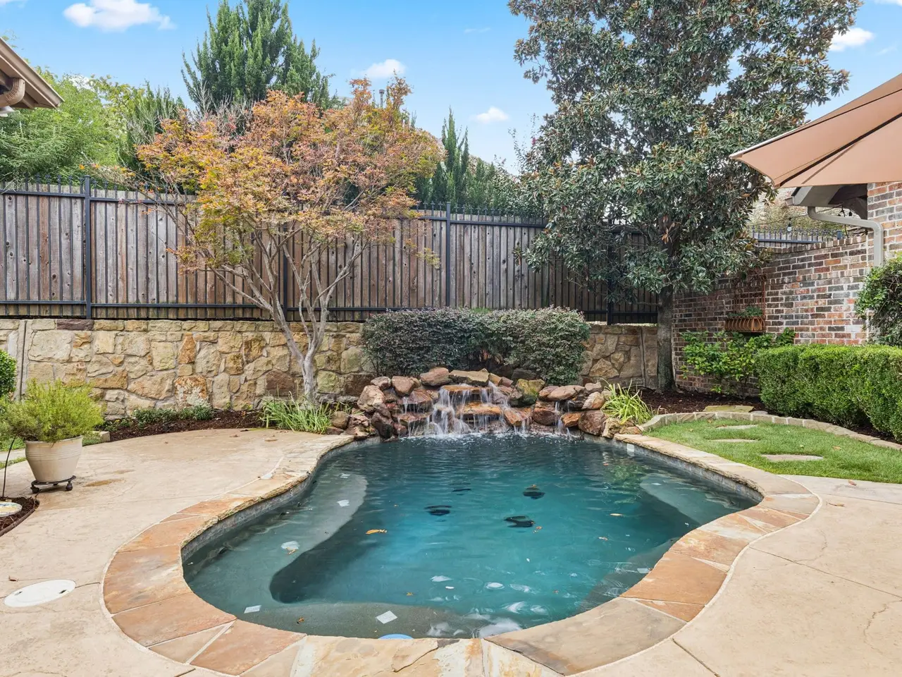Refined Elegance and Resort Living is found within the exclusive gated Estates of Lyndhurst. Nestled on a quiet cul-de-sac, this custom single-story home blends timeless craftsmanship with modern updates and elegant outdoor living. Enter along a gated, landscaped courtyard with the sounds of a gentle fountain and through a custom, hand carved wooden front door. Inside, you're welcomed by an elegant foyer with a barrel ceiling, tumbled marble inlay & hand-scraped hardwood floors that extend seamlessly throughout. The formal living has vaulted ceilings, exposed wood beams, and a dramatic floor-to-ceiling stone fireplace flanked by custom built-ins. The dedicated study is rich with custom woodwork, built-in bookshelves, and ceiling beams, overlooking the pool and bathed in natural light. The fully custom designer kitchen features quartz countertops, a ceramic farmhouse sink, a coffee bar, lighted glass cabinet toppers, top-tier appliances, a built-in bar and a custom wood mantel over the gas range. The formal dining room is framed by elegant wood trim, a decorative alcove, and French doors to a private patio with a tranquil fountain, perfect for entertaining. Each of the three bedrooms offers privacy and comfort. Primary Suite features a tray ceiling, views of the pool and plantation shutters. The renovated spa bath boasts brushed Arctic White marble, a soaking tub, quartz dual vanities, a statement chandelier and a custom walk-in closet. Secondary Bedrooms offer custom high end finishes and en suite bathrooms. The private backyard is a resort-style escape, centered around a 5,500-gallon Claffey pool with water feature. Entertain effortlessly with a tiled porch, stone wood-burning fireplace with gas hookup, built-in gas grill, and TV-ready mantle for outdoor viewing. Enjoy the benefits of a gated, boutique custom neighborhood with manicured lawns and a strong sense of community. A private residents-only park sits just across the street, while Milestone Park's walking trails are just steps away.