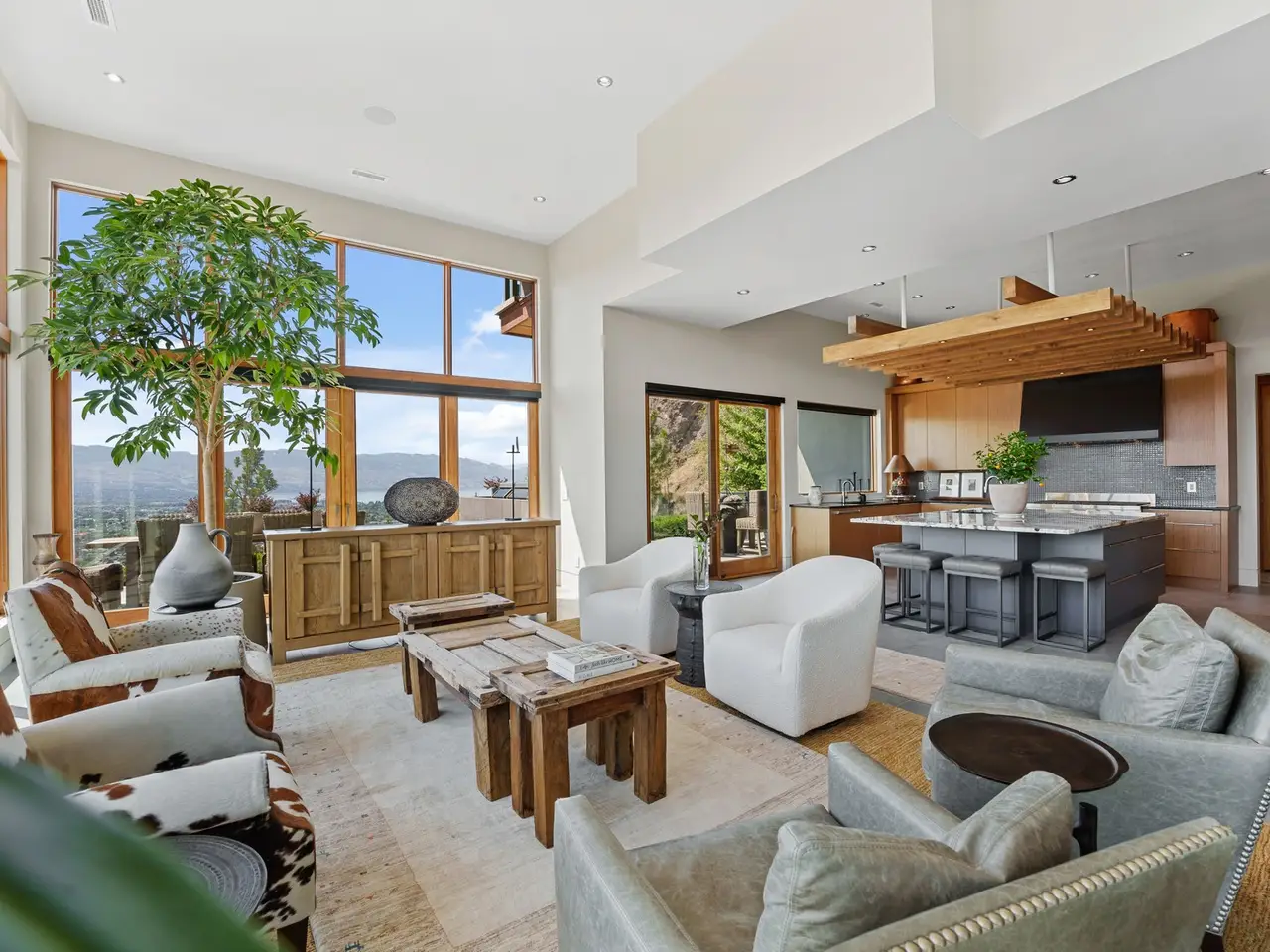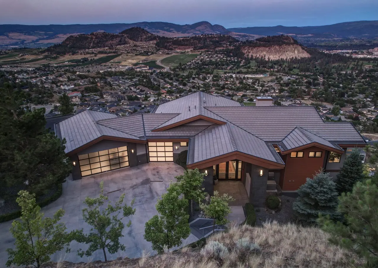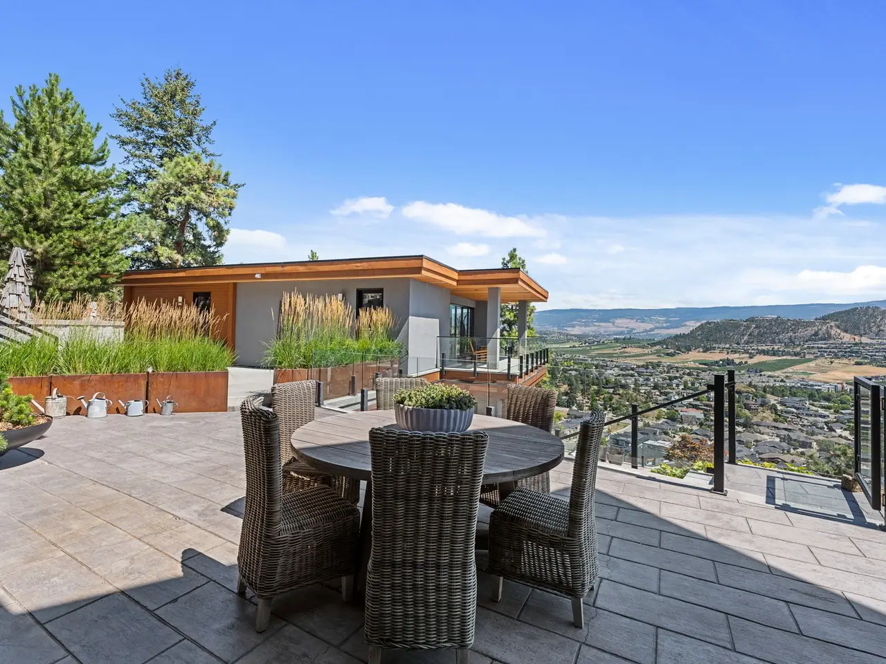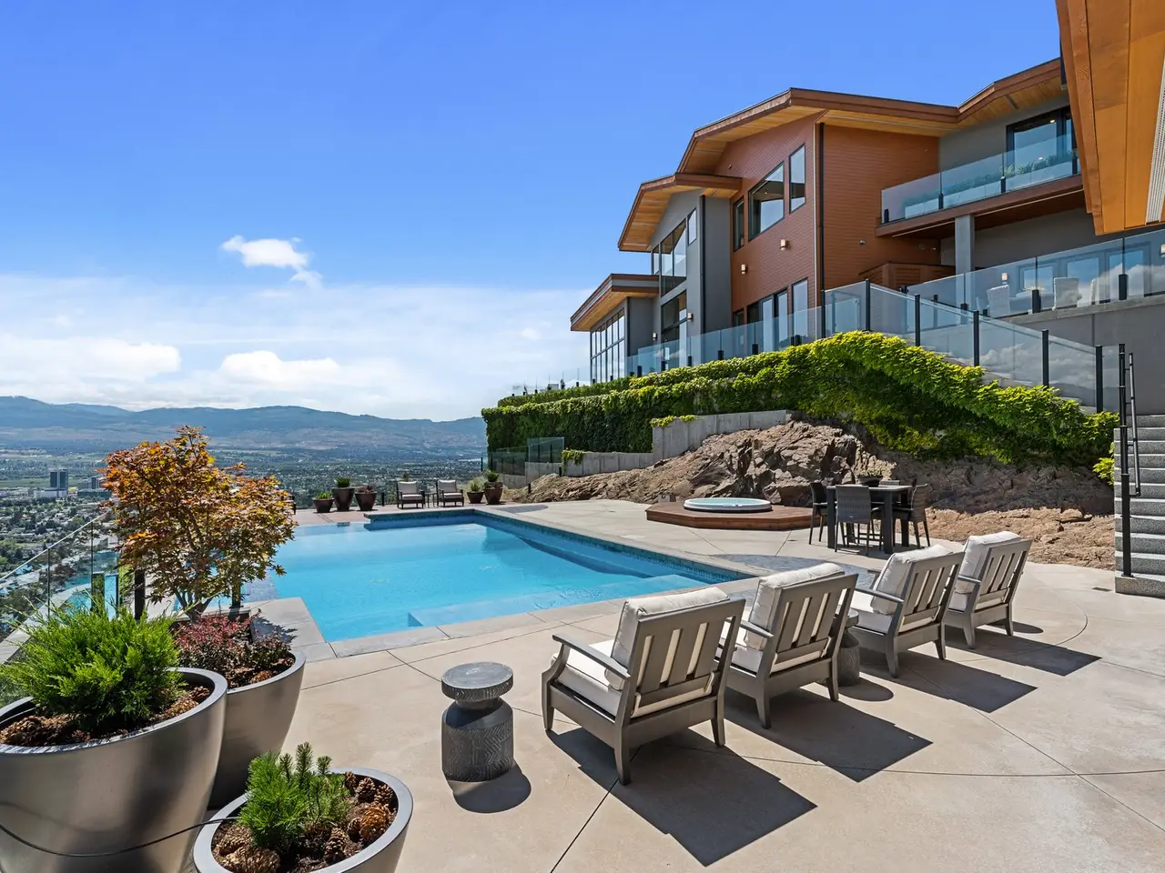 Listed by Unison Jane Hoffman Realty | Private lavish compound, located in the exclusive and desirable gated community of Highpointe, features an approx. 5700 sq. ft. main house and a detached luxury guest house, gym with infrared sauna, and office space. This architectural “landmark” has been recently re-modelled by Team Construction and current owners who had a vision to create warm and inviting spaces. Tasteful interiors were re-designed with $1.7 M spent in high-quality renovations; no expense has been spared from the mechanical to SMART Home technology. Open concept living areas with high ceilings and expansive windows capture panoramic views. The stunning kitchen and butler’s pantry makes a statement with granite countertops, professional appliances, custom wood cabinetry and a cedar beam feature above the island. On the upper level, indulge in luxury from the primary retreat with its own private lake view balcony, a custom walk-in closet and a spa-inspired ensuite. Opportunity to host “legendary” parties poolside with the wall of doors opening to the poolside kitchen accommodations. Ease of access to all levels with the recent addition of an elevator. Expanded triple garage plus extra parking. Amazing trail system and park just a quick walk from the front door. Rare private 2.6 acre setting to enjoy the captivating views of the valley, and the backdrop of the bluffs from the golf course to the lake and twinkling city lights.