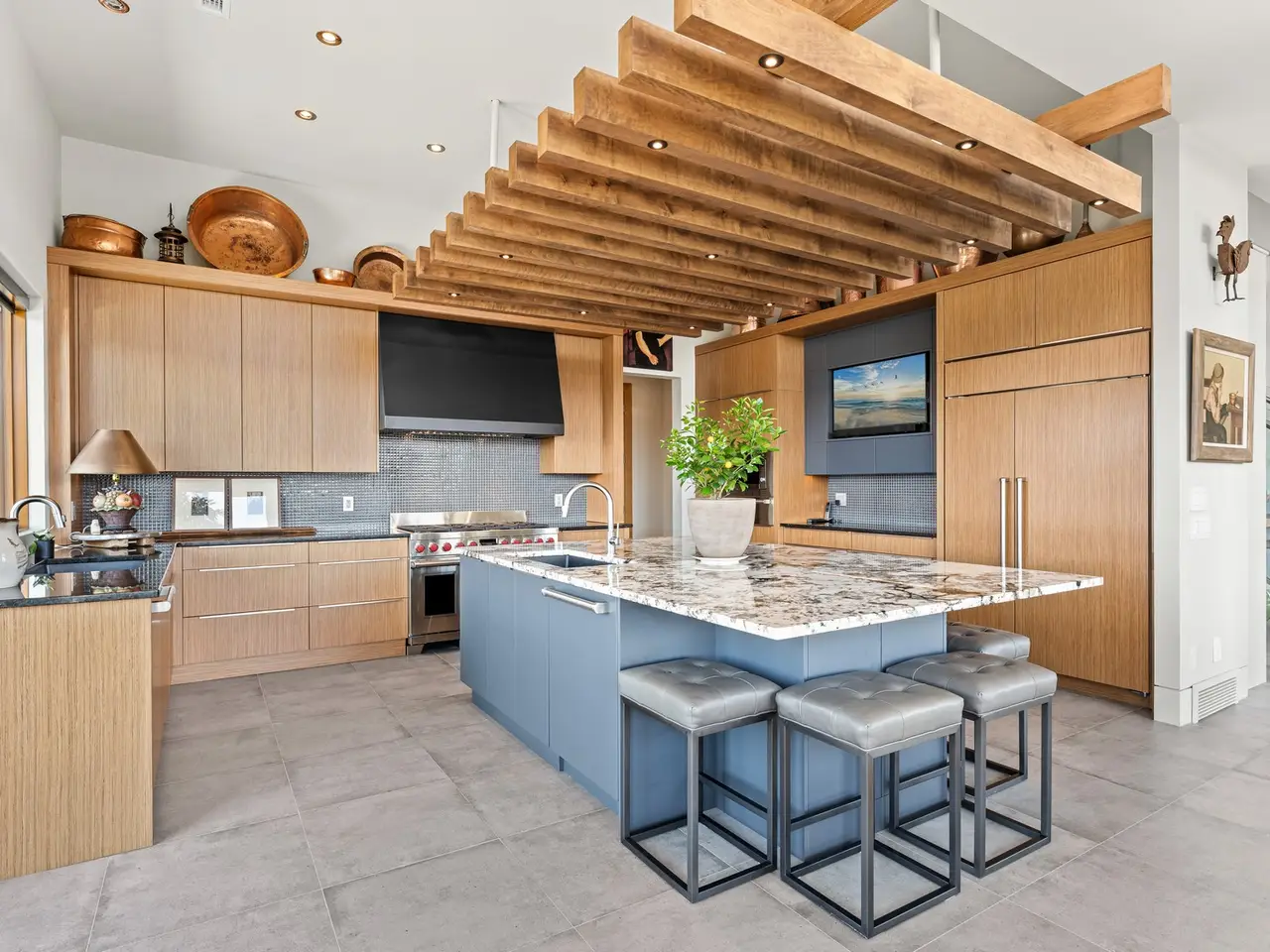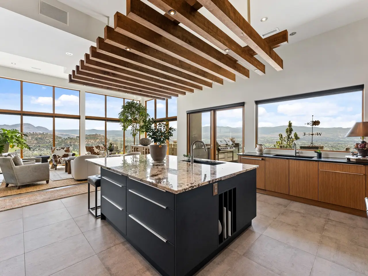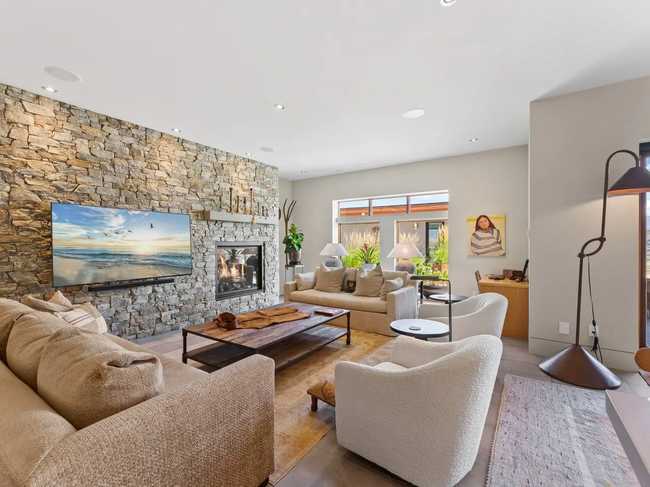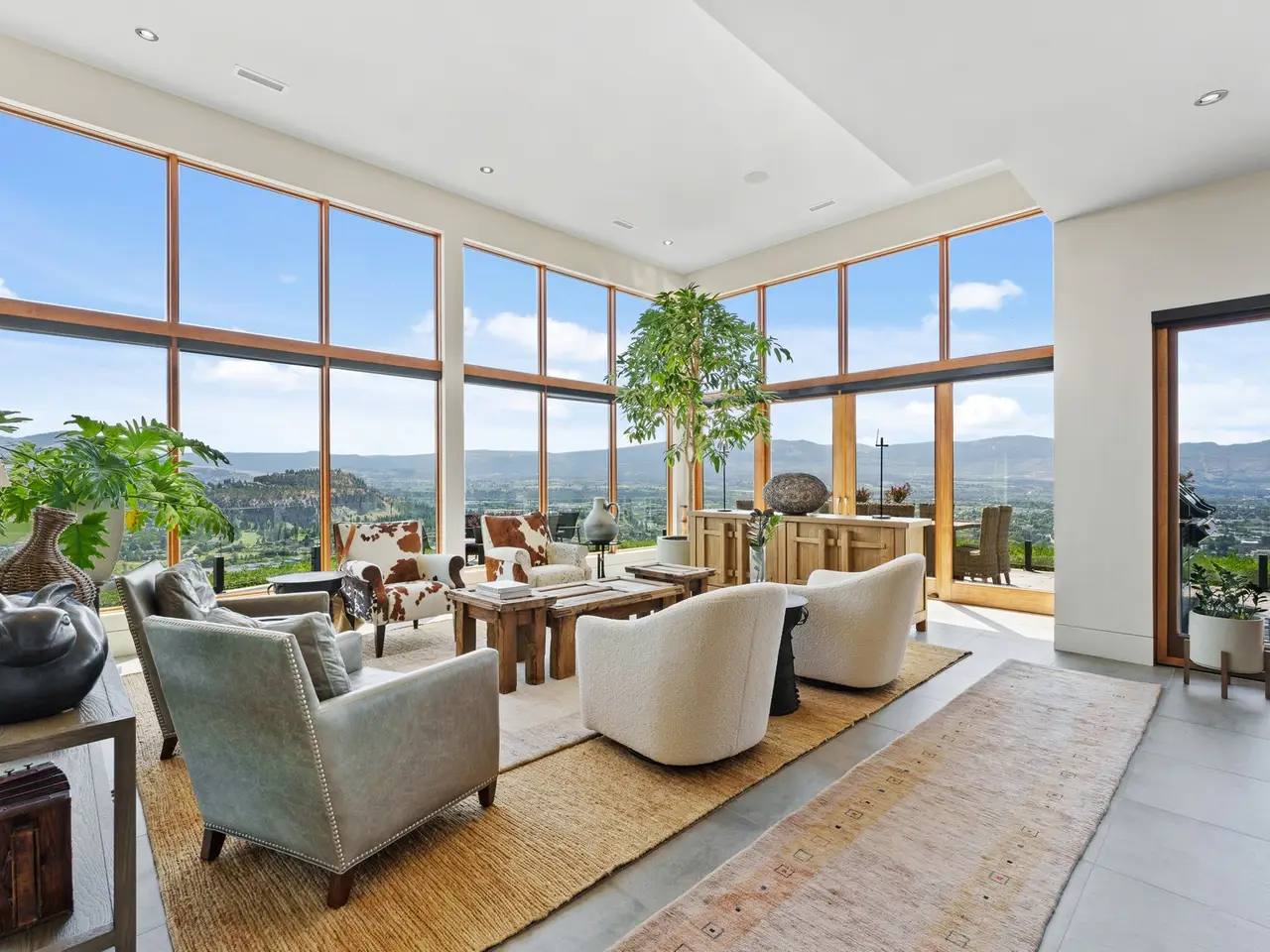 Listed by Unison Jane Hoffman Realty | Private lavish compound, located in the exclusive and desirable gated community of Highpointe, features an approx. 5700 sq. ft. main house and a detached luxury guest house, gym with infrared sauna, and office space. This architectural “landmark” has been recently re-modelled by Team Construction and current owners who had a vision to create warm and inviting spaces. Tasteful interiors were re-designed with $1.7 M spent in high-quality renovations; no expense has been spared from the mechanical to SMART Home technology. Open concept living areas with high ceilings and expansive windows capture panoramic views. The stunning kitchen and butler’s pantry makes a statement with granite countertops, professional appliances, custom wood cabinetry and a cedar beam feature above the island. On the upper level, indulge in luxury from the primary retreat with its own private lake view balcony, a custom walk-in closet and a spa-inspired ensuite. Opportunity to host “legendary” parties poolside with the wall of doors opening to the poolside kitchen accommodations. Ease of access to all levels with the recent addition of an elevator. Expanded triple garage plus extra parking. Amazing trail system and park just a quick walk from the front door. Rare private 2.6 acre setting to enjoy the captivating views of the valley, and the backdrop of the bluffs from the golf course to the lake and twinkling city lights.