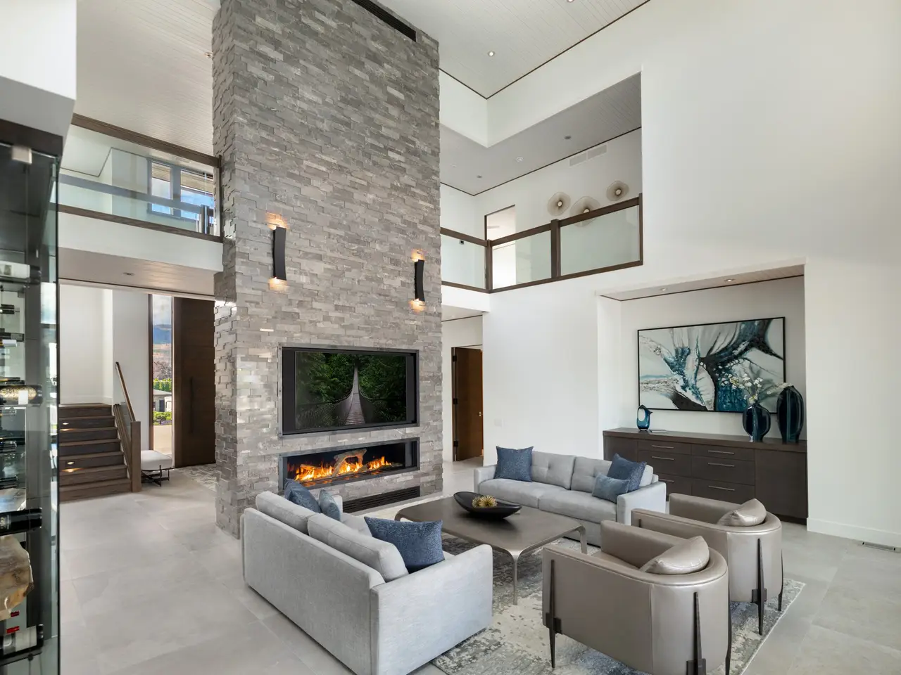 Listed by Unison Jane Hoffman Realty | Custom SanMarc home on desirable Thacker Drive in Lakeview Heights. This property boasts exceptional attention to detail that is sure to impress. Expertly designed, it offers a remarkable layout inside & out for everyday living while maintaining its allure as a modern masterpiece. From nearly every room & the backyard, enjoy expansive, unobstructed Okanagan Lake views. A solid wood 12-ft pivot door welcomes you to the foyer with a 20-ft marble tiled entry wall leading to the catwalk on the 2nd level, connecting the 2 wings of the home. The great room boasts 23-foot ceilings, floor-to-ceiling windows, & an 80-inch linear gas fireplace. Gourmet kitchen with Carolyn Walsh-designed cabinetry, waterfall edge island, professional appliances & a window that fully retracts, creating a passthrough to the outdoor kitchen. Glass-enclosed 75+ bottle temperature-controlled wine room. Sliding doors on the main level open to a remarkable outdoor retreat: saltwater pool with auto cover, synthetic lawn, Jacuzzi hot tub, outdoor kitchen, $12K sound system, covered patio with glass ceiling. Luxurious main floor primary with pool access, spa-inspired 5-piece ensuite with views of the lake, heated floors, custom closet, and a linear gas fireplace. Main floor living with elevator that accesses all three floors. Upstairs offers 4 large bedrooms, all with ensuites, and 2 featuring private lake view patios. Laundry on both levels. Oversized 3-car garage with built-ins, custom cabinetry, and prewired for EV.