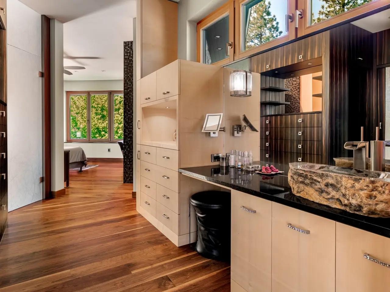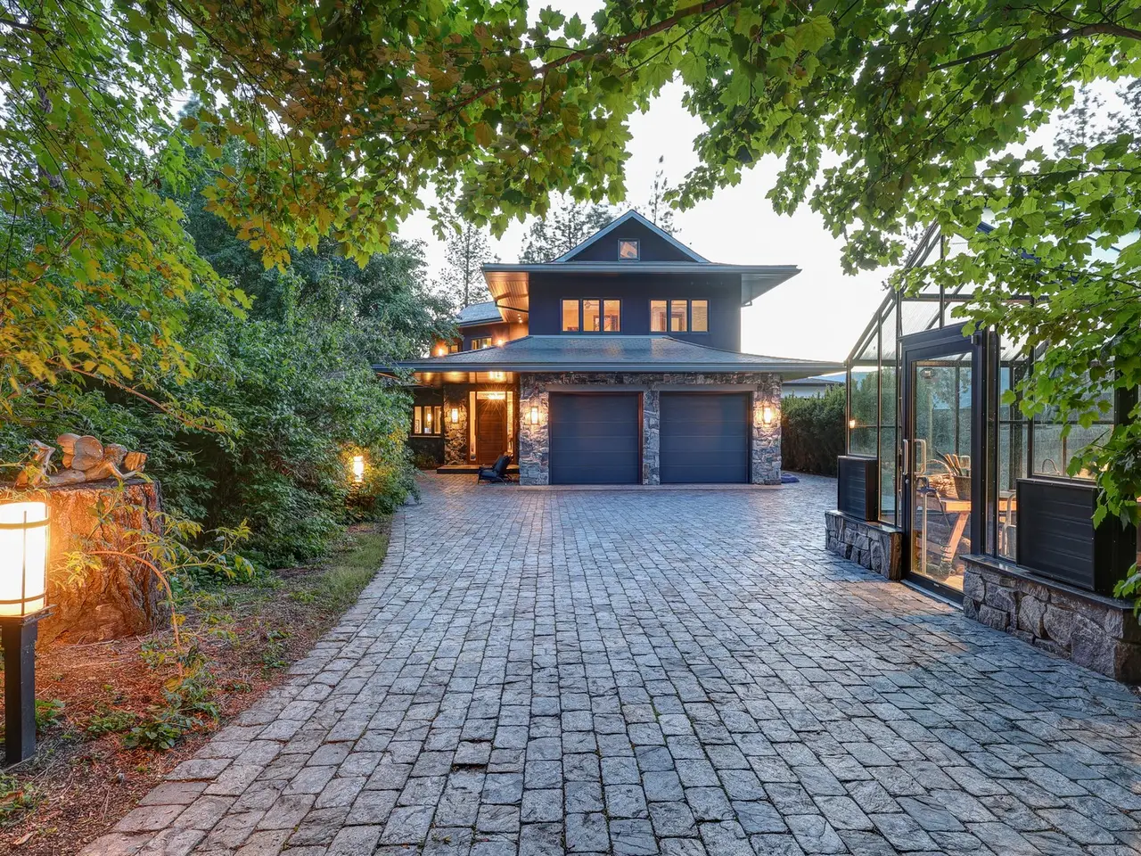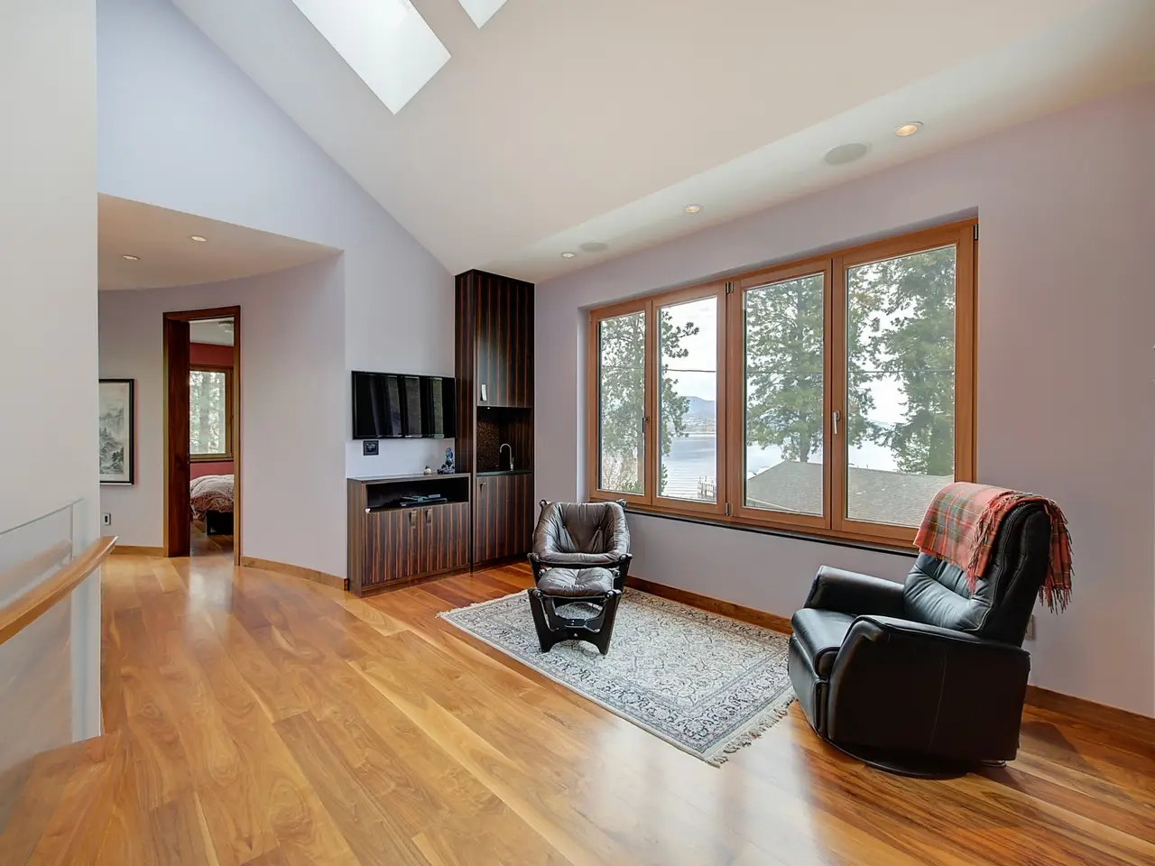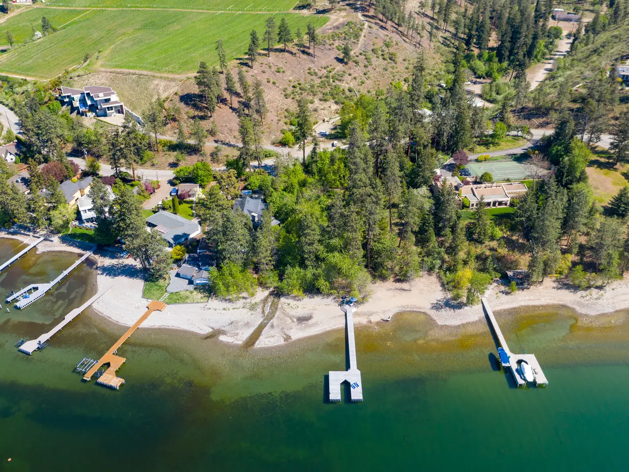 Listed by Unison Jane Hoffman Realty | Tranquil Waterfront and Creekside Retreat. This gorgeous custom home is situated on a private 1.22 acre property along the shores of Okanagan Lake and offers 185 feet of water frontage. Lebanon Creek borders the property to the south. Designed by Architect Everest Lap and interior design by Ines Hanl this home is an energy efficient oasis “connecting back to the earth.” Meticulous attention to detail and design is found throughout the over 4,600 sq. ft. residence with every room taking full advantage of the lake and forest views, bringing the outdoors in. Exterior has been finished with Kettle Valley granite and incorporates seamlessly into the surroundings. Natural materials span the home with custom rock and tile work, rich wood cabinetry, and beautiful walnut floors. Upon entry you’ll notice the soaring 29 ft. ceilings in the kitchen creating a grand space for hosting and entertaining. The high-end kitchen features a curved island, custom Sycamore and Walnut veneer wood cabinets with professional appliances that will delight any chef. Living room was designed to hold a grand piano with a panel of 5 windows that accordion to the patio to allow for an unparalleled indoor to outdoor living experience. Backyard offers a swim spa and hot tub that are both privately nestled into the landscape. Well-designed and constructed wharf system at the beautiful expansive shoreline. For those seeking a tranquil retreat with seamless access to the waterfront this is the ideal property!