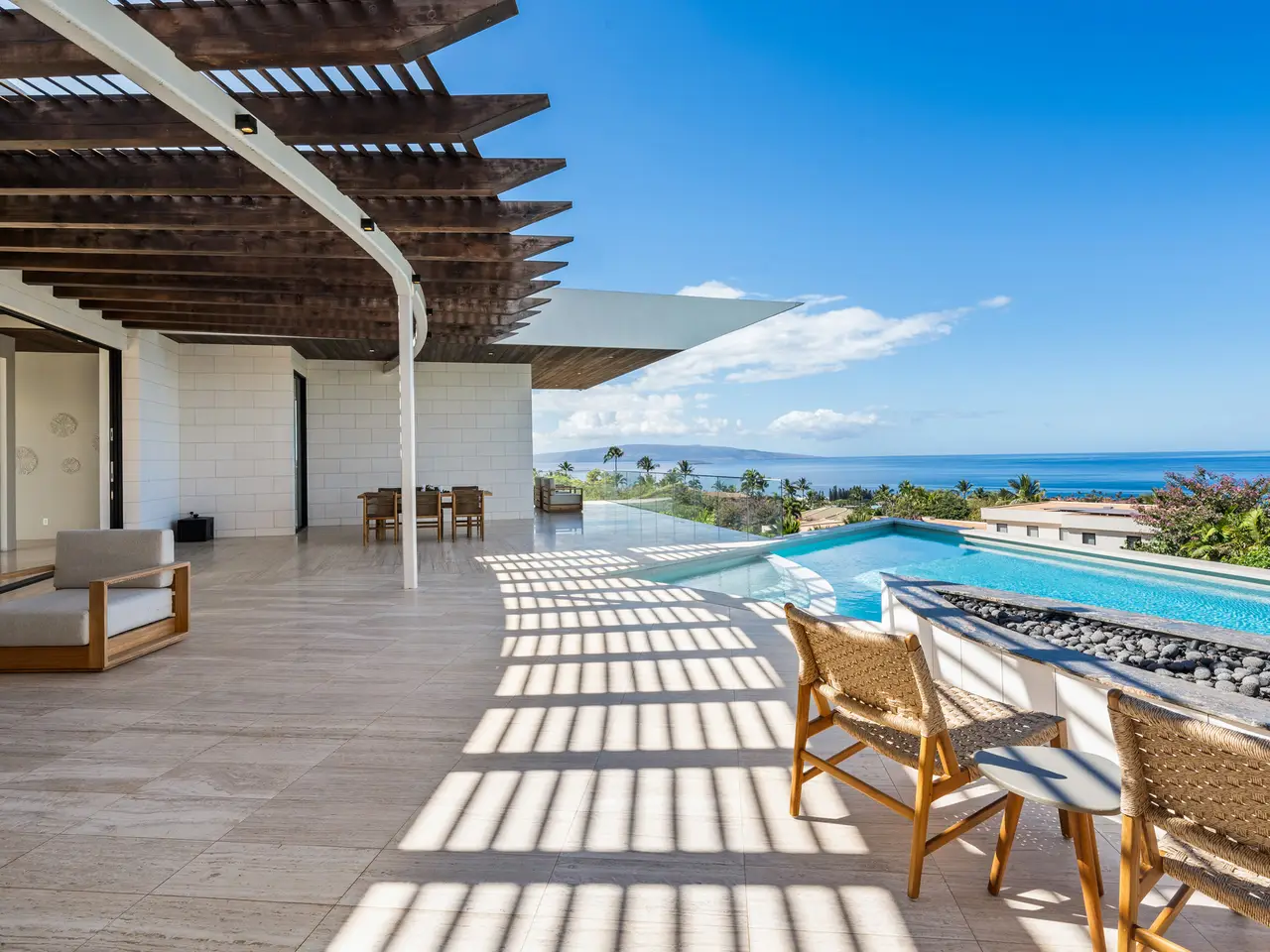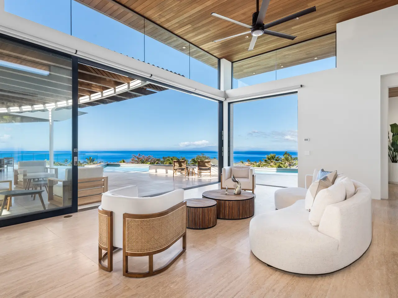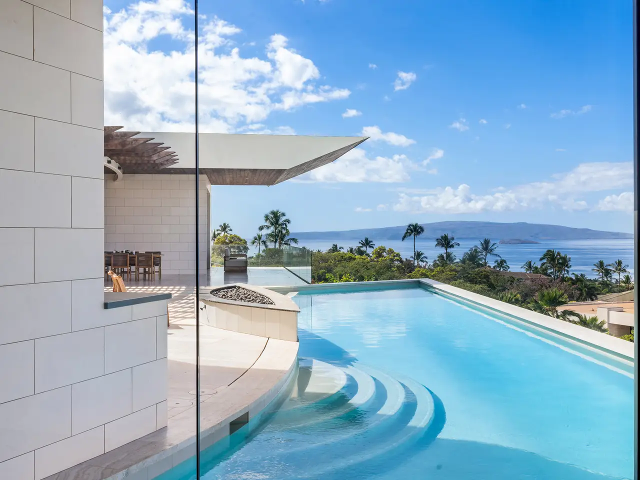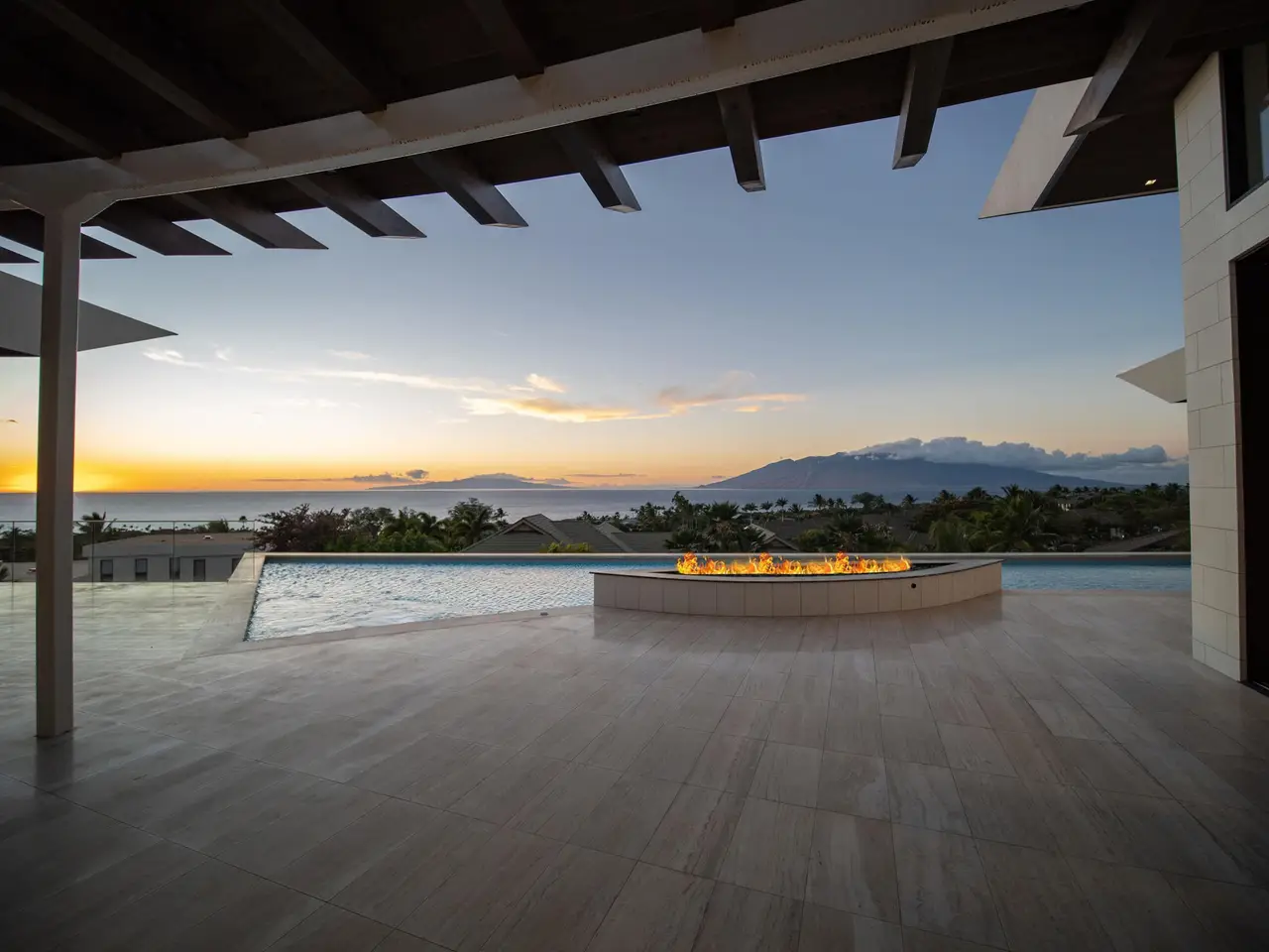 Atop the exclusive and private enclave of homes at The Ridge at Wailea, sits a masterpiece of modern architecture and design. A select few will experience the spectacular ocean views and the artistic flare of this residence as a livable sculpture. As you enter a large, covered entry, the striking black magma stone surrounds a tropical courtyard with a modern gate revealing an impressive steel and stone spiral staircase that welcomes you to another level of luxury and into another dimension of living. From the moment you enter this 5,000+ sq. ft. property, you will be struck by the floor-to-ceiling wall of windows and doors, filling the home with natural light and breathtaking views from south of Molokini to the majestic West Maui Mountains. Designed by Guy Dreier Designs and built by Trend Builders, the modern flair of this 4 bedroom, 4.5 bath estate is enhanced by sculptural shapes, dramatic lines, and organic spaces. Seamless integration of the expansive indoor and outdoor spaces serves to further enhance the open-air, island lifestyle. The remarkable layout features multi car parking and garage, media, living, dining areas, guest bedrooms with private lanais, and 2 master wings. The south wing has an exquisite master and spa-like bath, indoor/outdoor showers, a walk-in closet, and coastal views from a private lanai, an office/guest suite, laundry room, and elevator for privacy from the main living area. The north wing has a gracious master suite with expansive ocean views, indoor/outdoor shower, walk-in closet, poolside lanai, and the open-air kitchen for premier entertaining. With a large island, pantry, sunken bar with intimate seating areas, Miele wine unit, and other high-end appliances, the lavish chef’s kitchen offers guests an elegant entertaining experience. At the heart of this ultra-contemporary oasis is an outdoor lanai featuring a stunning Avant Gard pool with spa, gas fire pit for cozy evenings, a built-in barbecue, and the ultimate outdoor dining and entertaining area. Featuring sleek finishes, soaring high ceilings, Quartzite slab stone counters, Poliform systems throughout, this home has been designed with the highest attention to detail creating an air of sophistication. This is the perfect balance of single level living and contemporary comfort setting this home apart from rest. Listing Broker has a recorded interest in the property and is licensed in the State of Hawaii.