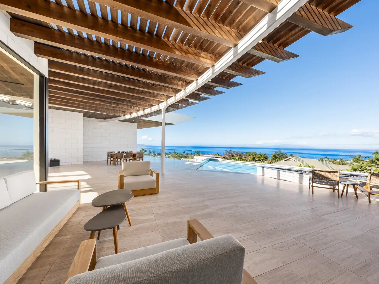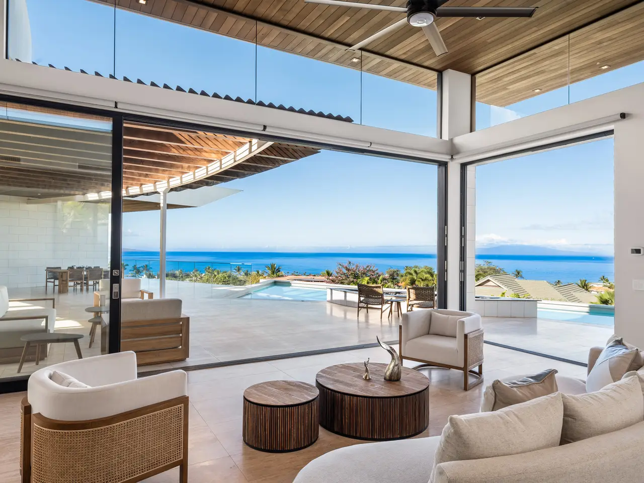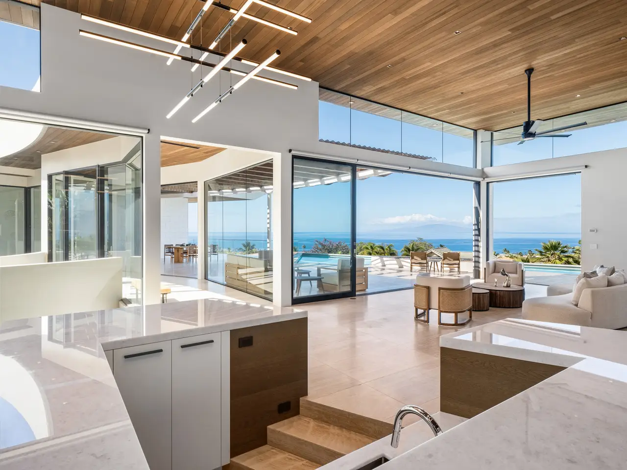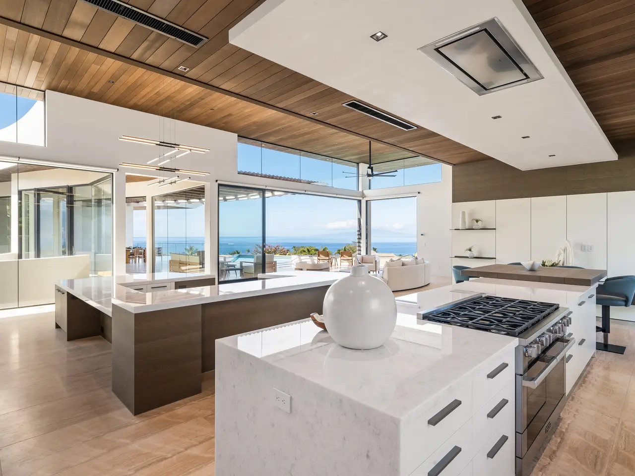 Atop the exclusive and private enclave of homes at The Ridge at Wailea, sits a masterpiece of modern architecture and design. A select few will experience the spectacular ocean views and the artistic flare of this residence as a livable sculpture. As you enter a large, covered entry, the striking black magma stone surrounds a tropical courtyard with a modern gate revealing an impressive steel and stone spiral staircase that welcomes you to another level of luxury and into another dimension of living. From the moment you enter this 5,000+ sq. ft. property, you will be struck by the floor-to-ceiling wall of windows and doors, filling the home with natural light and breathtaking views from south of Molokini to the majestic West Maui Mountains. Designed by Guy Dreier Designs and built by Trend Builders, the modern flair of this 4 bedroom, 4.5 bath estate is enhanced by sculptural shapes, dramatic lines, and organic spaces. Seamless integration of the expansive indoor and outdoor spaces serves to further enhance the open-air, island lifestyle. The remarkable layout features multi car parking and garage, media, living, dining areas, guest bedrooms with private lanais, and 2 master wings. The south wing has an exquisite master and spa-like bath, indoor/outdoor showers, a walk-in closet, and coastal views from a private lanai, an office/guest suite, laundry room, and elevator for privacy from the main living area. The north wing has a gracious master suite with expansive ocean views, indoor/outdoor shower, walk-in closet, poolside lanai, and the open-air kitchen for premier entertaining. With a large island, pantry, sunken bar with intimate seating areas, Miele wine unit, and other high-end appliances, the lavish chef’s kitchen offers guests an elegant entertaining experience. At the heart of this ultra-contemporary oasis is an outdoor lanai featuring a stunning Avant Gard pool with spa, gas fire pit for cozy evenings, a built-in barbecue, and the ultimate outdoor dining and entertaining area. Featuring sleek finishes, soaring high ceilings, Quartzite slab stone counters, Poliform systems throughout, this home has been designed with the highest attention to detail creating an air of sophistication. This is the perfect balance of single level living and contemporary comfort setting this home apart from rest. Listing Broker has a recorded interest in the property and is licensed in the State of Hawaii.