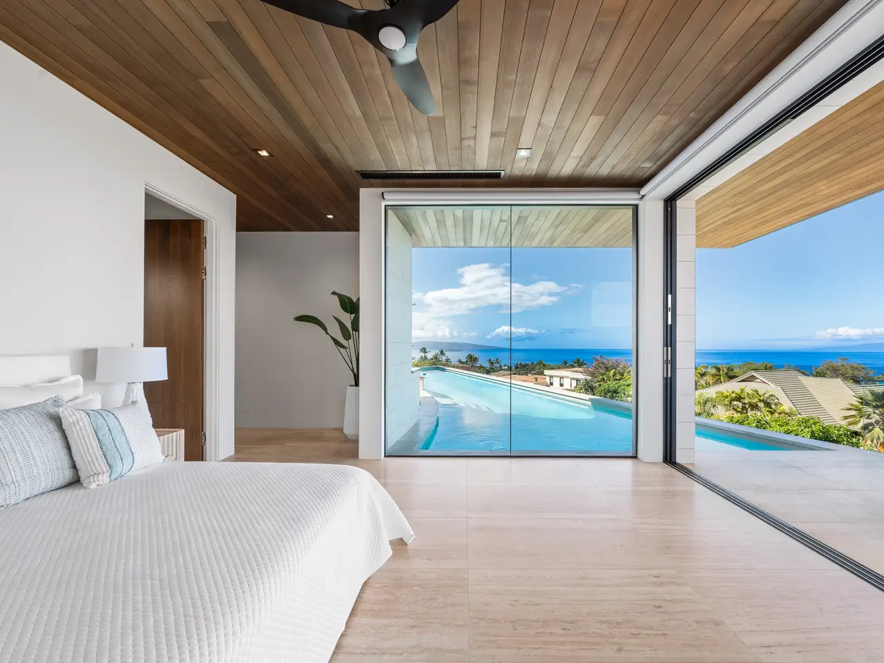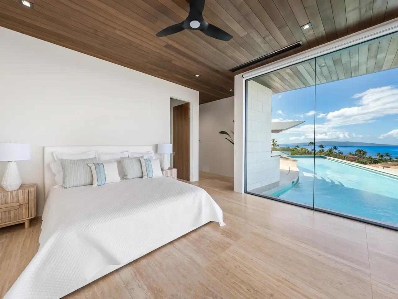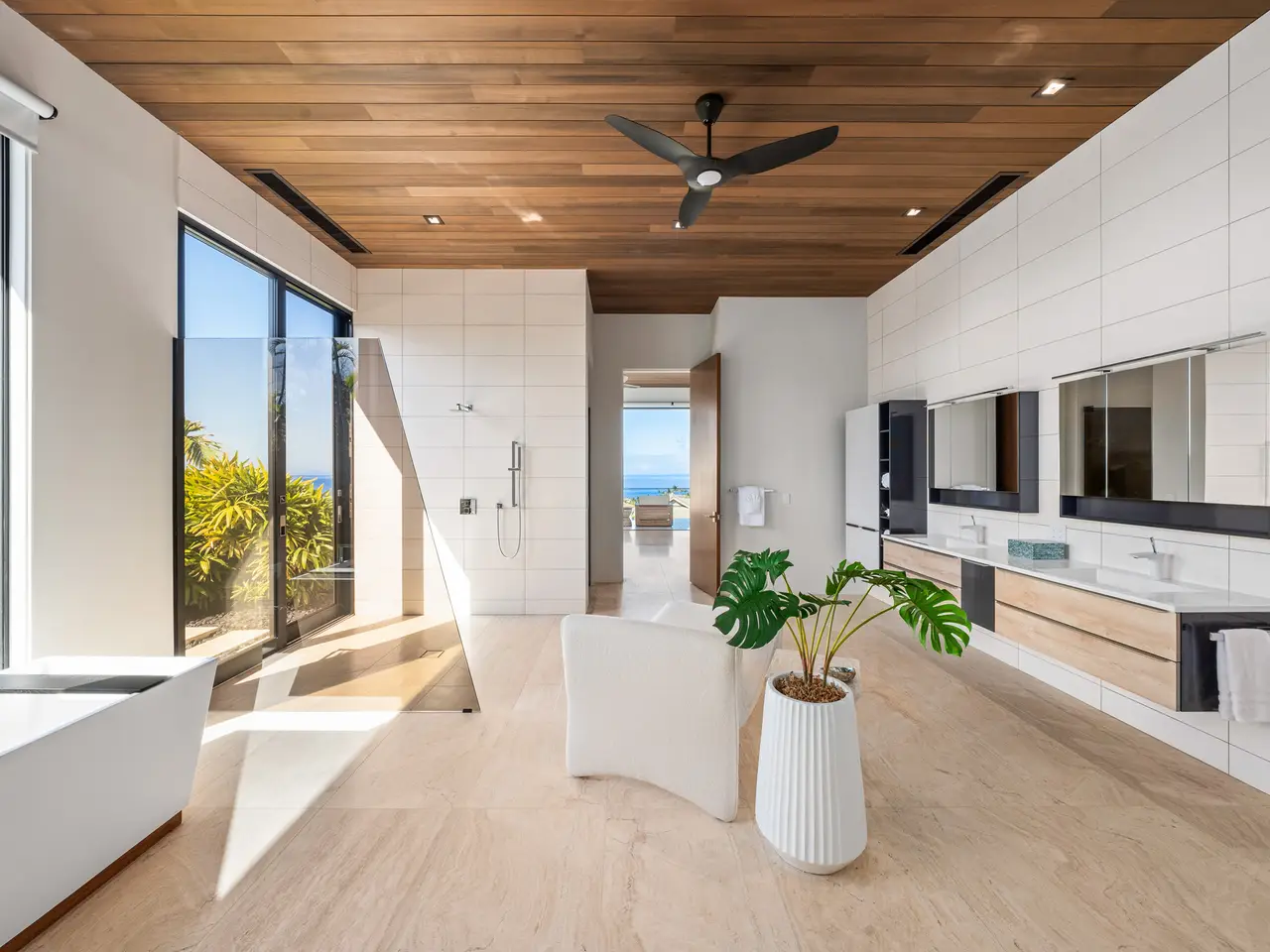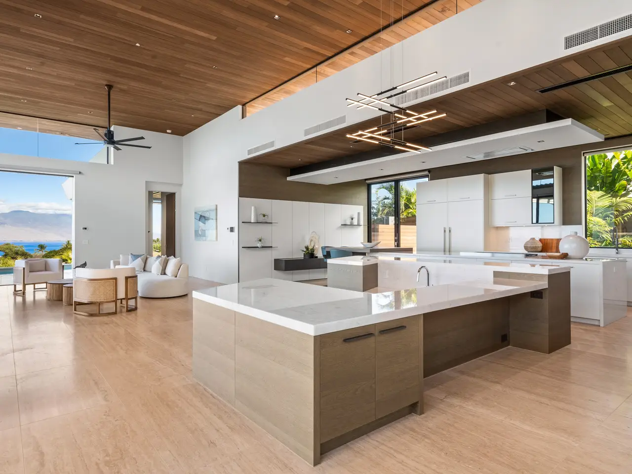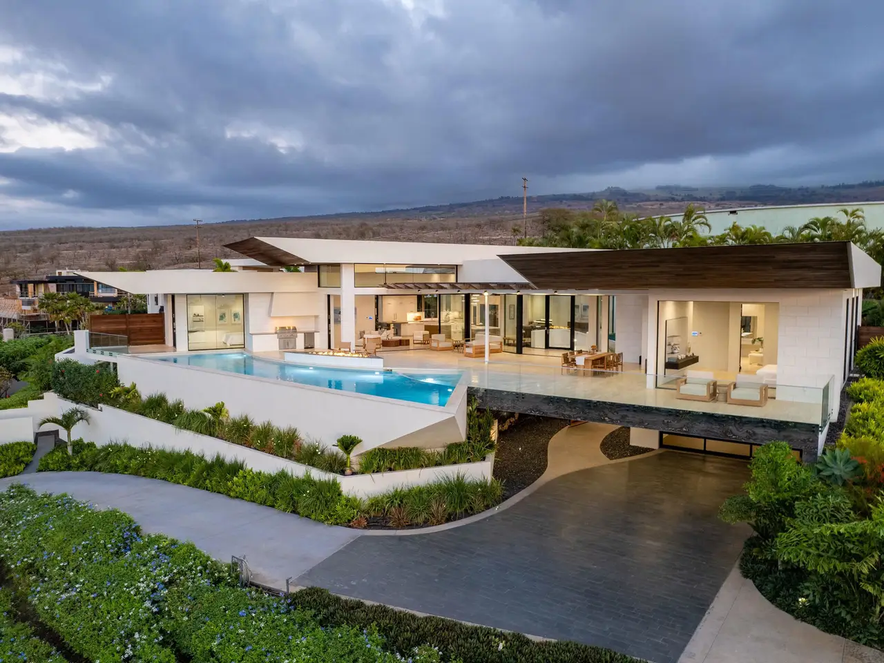 Atop the exclusive and private enclave of homes at The Ridge at Wailea, sits a masterpiece of modern architecture and design. A select few will experience the spectacular ocean views and the artistic flare of this residence as a livable sculpture. As you enter a large, covered entry, the striking black magma stone surrounds a tropical courtyard with a modern gate revealing an impressive steel and stone spiral staircase that welcomes you to another level of luxury and into another dimension of living. From the moment you enter this 5,000+ sq. ft. property, you will be struck by the floor-to-ceiling wall of windows and doors, filling the home with natural light and breathtaking views from south of Molokini to the majestic West Maui Mountains. Designed by Guy Dreier Designs and built by Trend Builders, the modern flair of this 4 bedroom, 4.5 bath estate is enhanced by sculptural shapes, dramatic lines, and organic spaces. Seamless integration of the expansive indoor and outdoor spaces serves to further enhance the open-air, island lifestyle. The remarkable layout features multi car parking and garage, media, living, dining areas, guest bedrooms with private lanais, and 2 master wings. The south wing has an exquisite master and spa-like bath, indoor/outdoor showers, a walk-in closet, and coastal views from a private lanai, an office/guest suite, laundry room, and elevator for privacy from the main living area. The north wing has a gracious master suite with expansive ocean views, indoor/outdoor shower, walk-in closet, poolside lanai, and the open-air kitchen for premier entertaining. With a large island, pantry, sunken bar with intimate seating areas, Miele wine unit, and other high-end appliances, the lavish chef’s kitchen offers guests an elegant entertaining experience. At the heart of this ultra-contemporary oasis is an outdoor lanai featuring a stunning Avant Gard pool with spa, gas fire pit for cozy evenings, a built-in barbecue, and the ultimate outdoor dining and entertaining area. Featuring sleek finishes, soaring high ceilings, Quartzite slab stone counters, Poliform systems throughout, this home has been designed with the highest attention to detail creating an air of sophistication. This is the perfect balance of single level living and contemporary comfort setting this home apart from rest. Listing Broker has a recorded interest in the property and is licensed in the State of Hawaii.