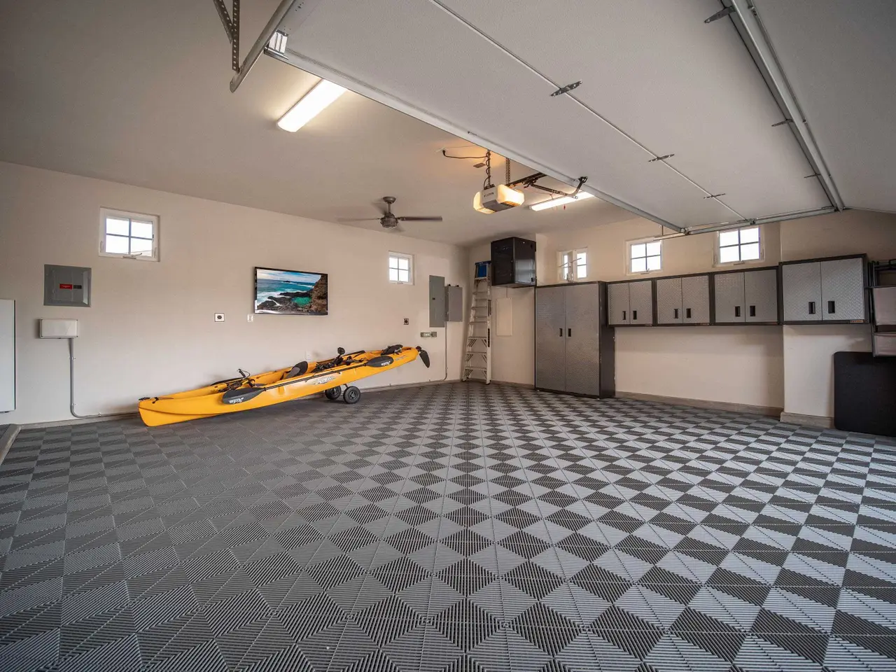 Garage with Swisstrax flooring and Gladiator wall cabinets