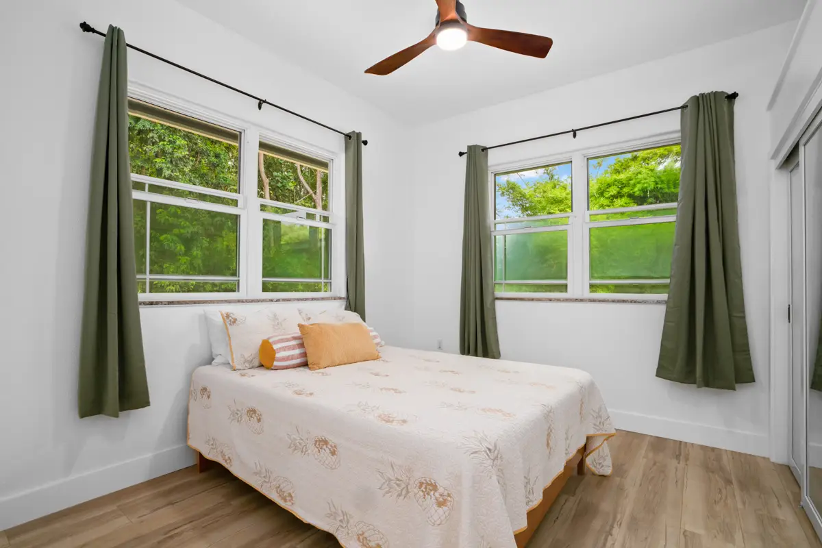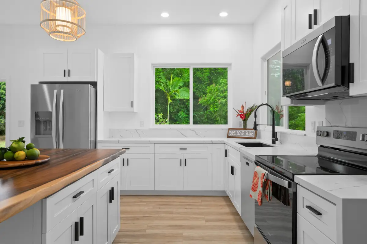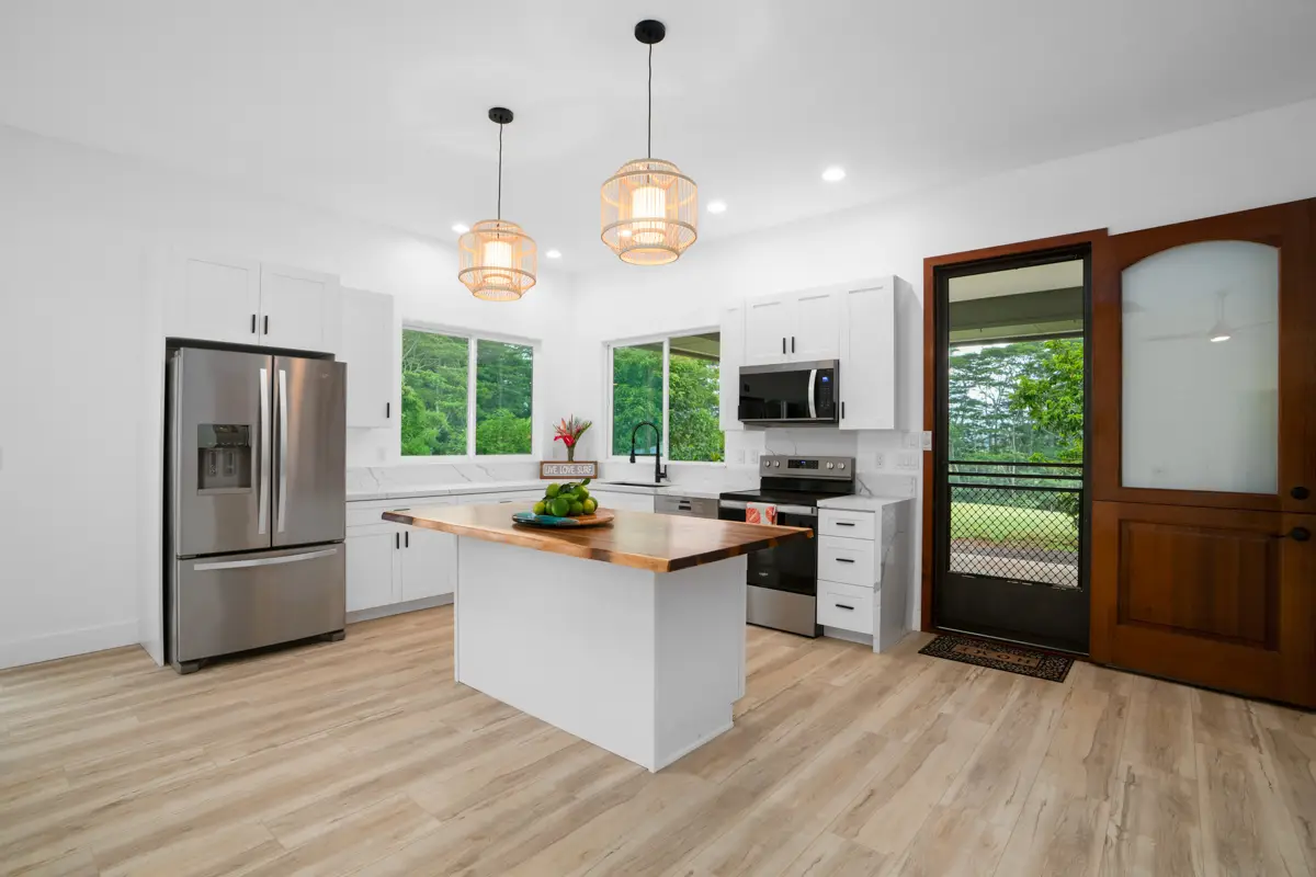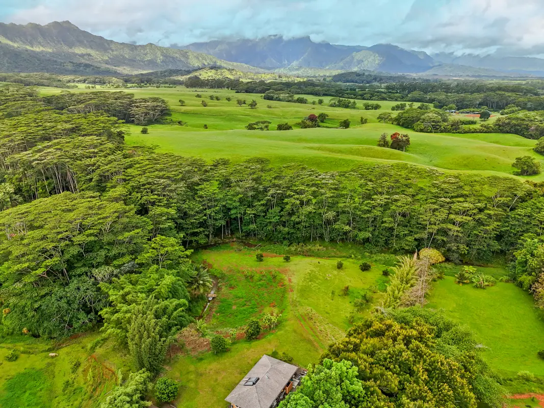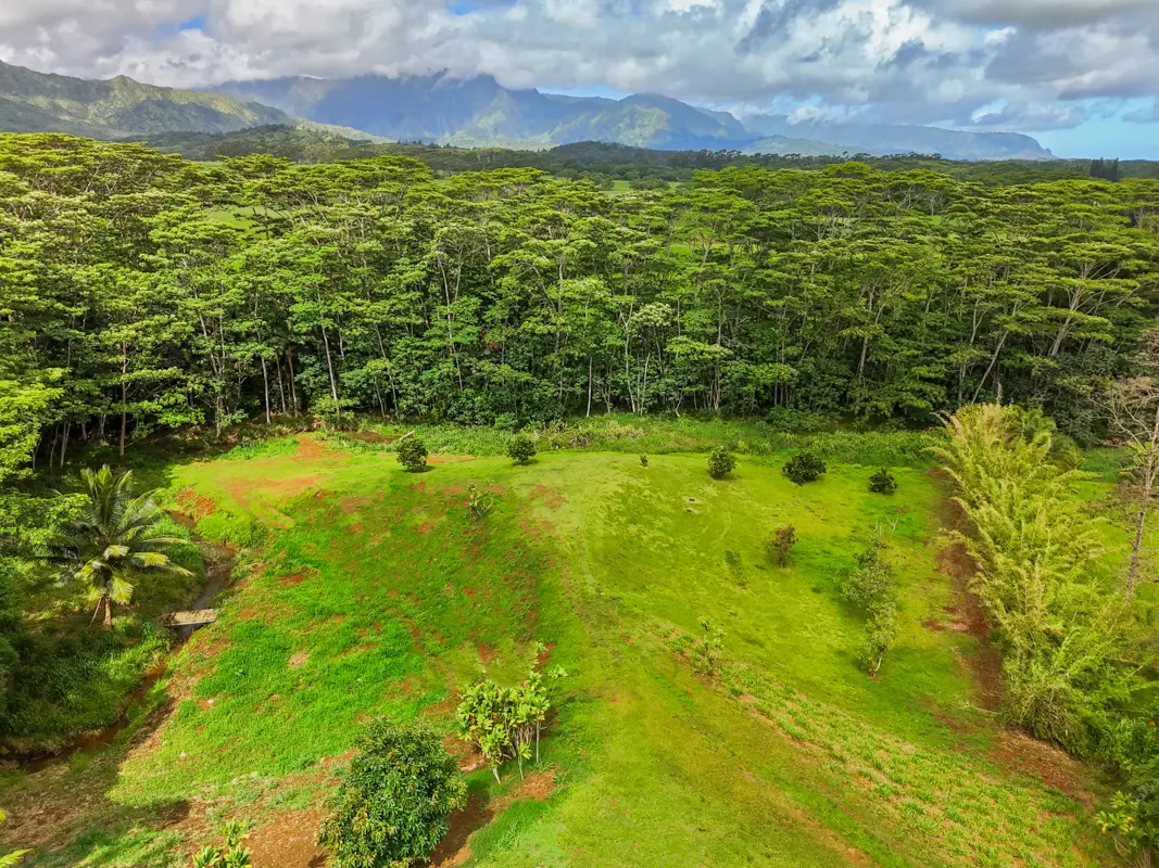 Opportunity awaits to live in a like-new home on acreage on the North Shore of Kauai. This beautifully updated residence features brand-new paint (interior & exterior), new flooring, quartz countertops, new stainless steel appliances, and a new washer & dryer. The home offers one bedroom, plus a bonus room, perfect for a home office, studio, or guest space and 10' high ceilings. Outside, enjoy a beautiful new soaking tub and shower, blending indoor-outdoor island living with a touch of luxury. Set on over 2.5-acres of agriculturally zoned land, this unique property is surrounded by natural beauty. A small stream flows through the landscape with mature citrus, avocado, and lychee trees. The property backs up to expansive open pasture lands, offering privacy in a tranquil setting. With a 5-bedroom septic system and an 80-gallon solar water heater already installed, this property offers immediate comfort and infrastructure for future expansion. Live in the home while designing your dream estate or farmstead. The land offers space, sustainability, and potential in a stunning tropical environment. Located in a quiet North Shore neighborhood just minutes from beaches, botanical gardens, and the charming community of Kilauea, this property is ideal for those seeking a peaceful lifestyle connected to nature, yet close to modern conveniences. A chance to own a rejuvenated home on acreage in one of Kauai’s most coveted locations.