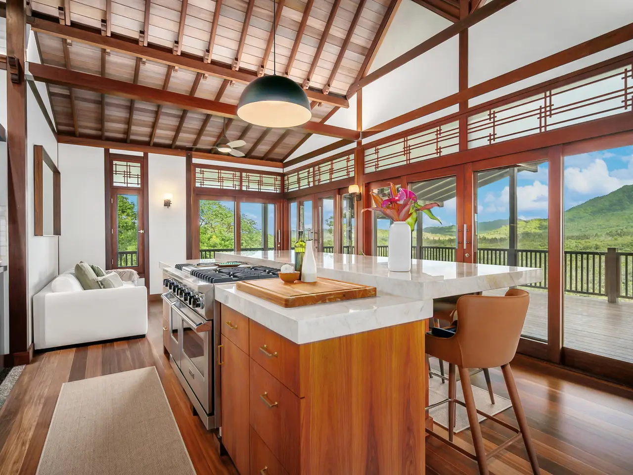 The main residence features incredible custom craftsmanship throughout, with an extensively remodeled & brand-new designer kitchen, soaring high ceilings, exotic imported Indonesian hardwoods, and custom windows.