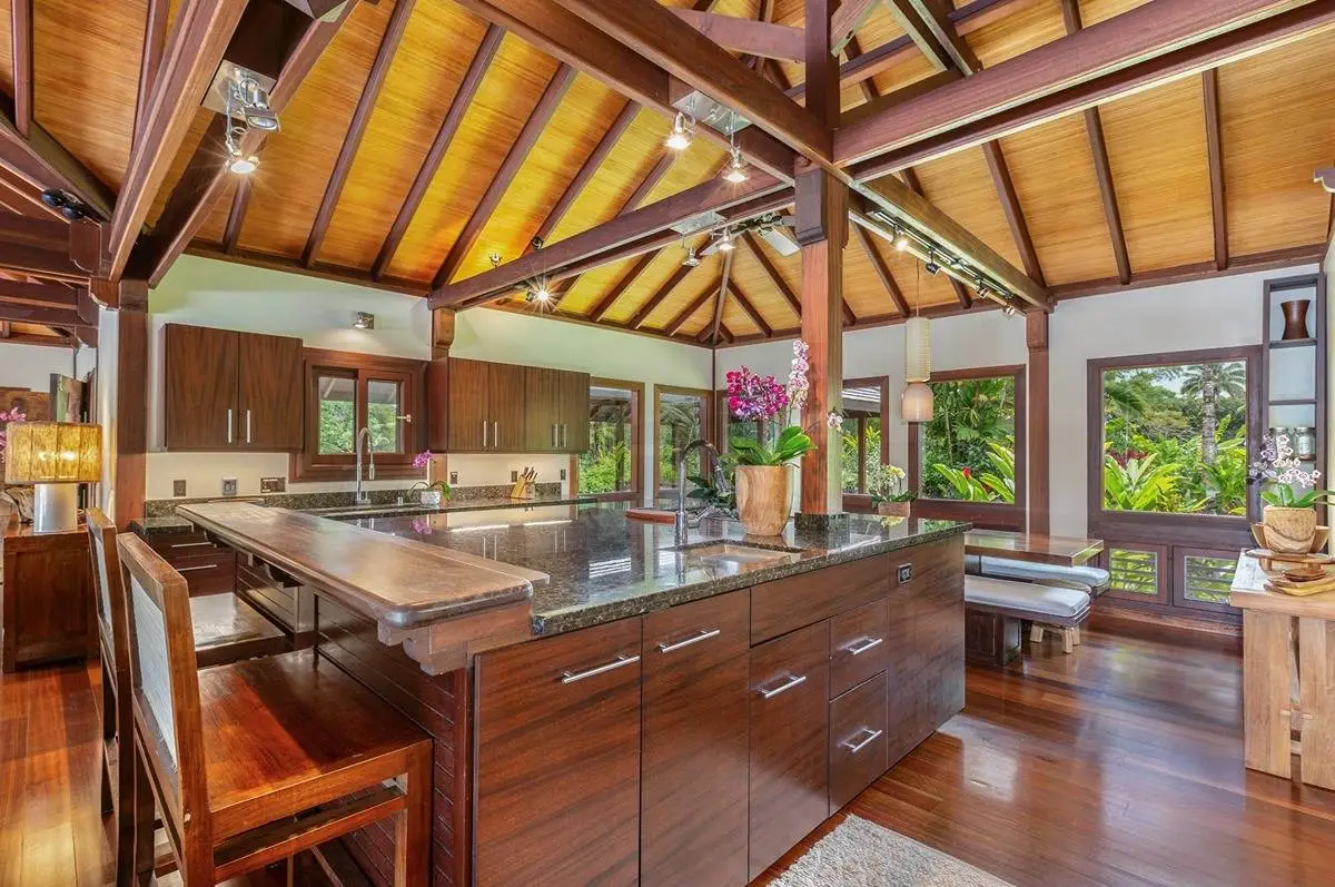Tucked away in absolute seclusion, this expansive estate spans 3.5 acres and offers complete privacy and Bali-style luxury. With breathtaking views of Mt. Namahana as a picturesque backdrop, the 4502 sqft main residence offers four bedrooms and three and a half baths. The grand 1750 sqft great room, which includes a spacious gourmet kitchen, inviting living area, and elegant dining space, serves as the perfect venue for entertaining guests and large family gatherings. The separate bedroom suites are connected by open covered breezeways, leading to an outdoor living room-style lanai. Designed to embrace the tropical lifestyle, the residence offers extensive outdoor covered living areas and capitalizes on the refreshing tradewinds.Outside the great room, the infinity-edged salt-water pool and spa adorned with imported greenstone tiles create a captivating centerpiece, surrounded by over 3000 sqft of ipe decking and expansive outdoor covered living spaces. The spacious multi-purpose open living area downstairs is currently used as a gym. Additional features include an oversized two-car garage, air conditioning and a private detached "writer's cottage.” Distinguishing itself within the neighborhood, the house is meticulously framed with termite-resistant tropical hardwoods throughout. The home features a brand new cedar shake roof, complemented by copper gutters and rain chains. Lava stone accents adorn the exterior, while custom-carved stone art pieces are integrated into carefully selected areas of the home. Breathtaking tropical landscaping and water features complete the atmosphere. The short drive to Kilauea town offers numerous amenities and conveniences. World class golf is just a few minutes away in Princeville. Famed Hanalei Bay and countless breathtaking beaches and surf spots are also easily accessible from this ideal location on Kauai's North Shore. This is arguably one of the finest properties in Kalihiwai Ridge and the entire North Shore.