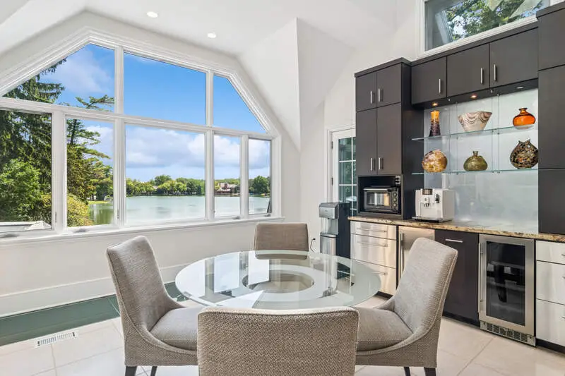 Walls of glass framing lake views