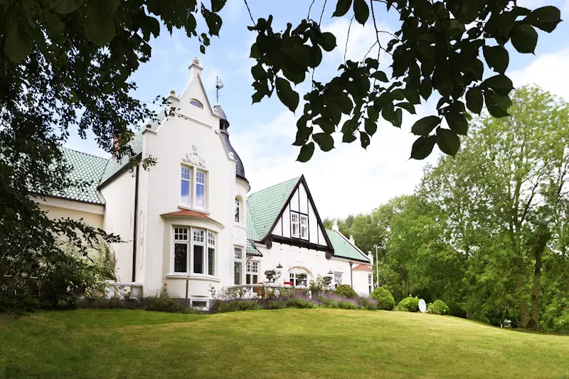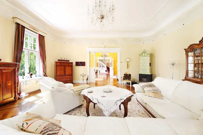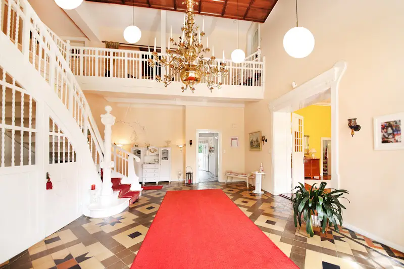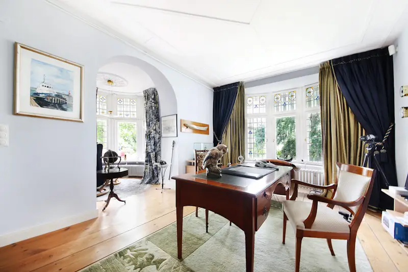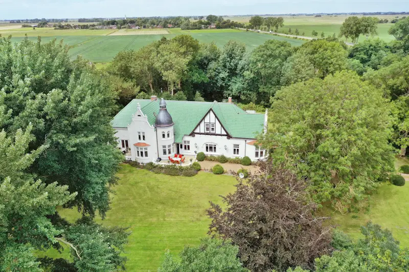 This magnificent, lovingly renovated and listed manor house, known locally as Axendorf Castle, stands elevated on a four meter high terp on a park-like property measuring over 14,000 m² not far from Tönning and the North Sea. The Kreutzgrat vaulted cellar, the oldest part of this ensemble, dates back to the 16th century. The names of the original owners from 1670 on the building also document the long history of the house. The property, which was originally used for agriculture and horse breeding, was rebuilt at the beginning of the 20th century and expanded with a tower between the two parts. The Art Nouveau elements that still adorn the house today also come from this time. This alarm-protected rarity can be reached via an avenue-like driveway with electric gates and high-quality paving, past the large garage building with three parking spaces (one for a mobile home, one with a pit) and an attached workshop. Once inside, every visitor can immediately see why Axendorf Castle is spoken of in the region. A spacious hall welcomes the guests and leads them via the spacious dining room through impressive sliding doors into the large salon with a unique and functional oven. The high ceilings, stucco and other style elements and, last but not least, the beautiful stained glass panes take you back in time, even though the house has been completely renovated. Particularly noteworthy is the room used as an office with a bay window and its own restorable bathroom on the ground floor of the tower and its beautiful view of the garden. The modern fitted kitchen and pantry, as well as a walk-through room with adjoining bathroom and bedroom, are waiting for new owners. From here you can also reach the separate apartment with shower room, fitted kitchen, bedroom and living room with direct access to your own spacious terrace. The upper floor with gallery is accessed from the hall via a magnificent staircase. From there you can reach the second tower room with a bay window and its own fireplace. The large studio room is impressive. There are also two connecting rooms with their own shower room available. The highlight is the master bedroom with a dream bathroom en suite made of marble. In addition to a dressing room, the latter offers a steam sauna, a walk-in shower, a double washbasin, a bathtub, as well as a toilet and bidet. The lovingly landscaped outdoor area impresses with its 300-year-old trees, fruit trees, roses and countless other plants. Various cozy places invite you to linger. In addition, there is not only a heated garden house, a greenhouse and a barbecue Kota available on your own pond, but also a 5x9 meter covered pool area heated by an air heat pump. The additional six hectares of grassland surrounding the park property are leased (rental income € 1,816 per annum), but can also be handed over lease-free if desired. This property with its history, its successful mix of old style elements and modern technology, offers a wide range of possible uses. From a spacious family home, to training, treatment or further education rooms, to use as a sophisticated bed and breakfast or as an event location for weddings and concerts, there are no limits to your imagination. A fiber optic connection will be installed by summer 2023 at the latest. Let us convince you of this unique property in a personal viewing.